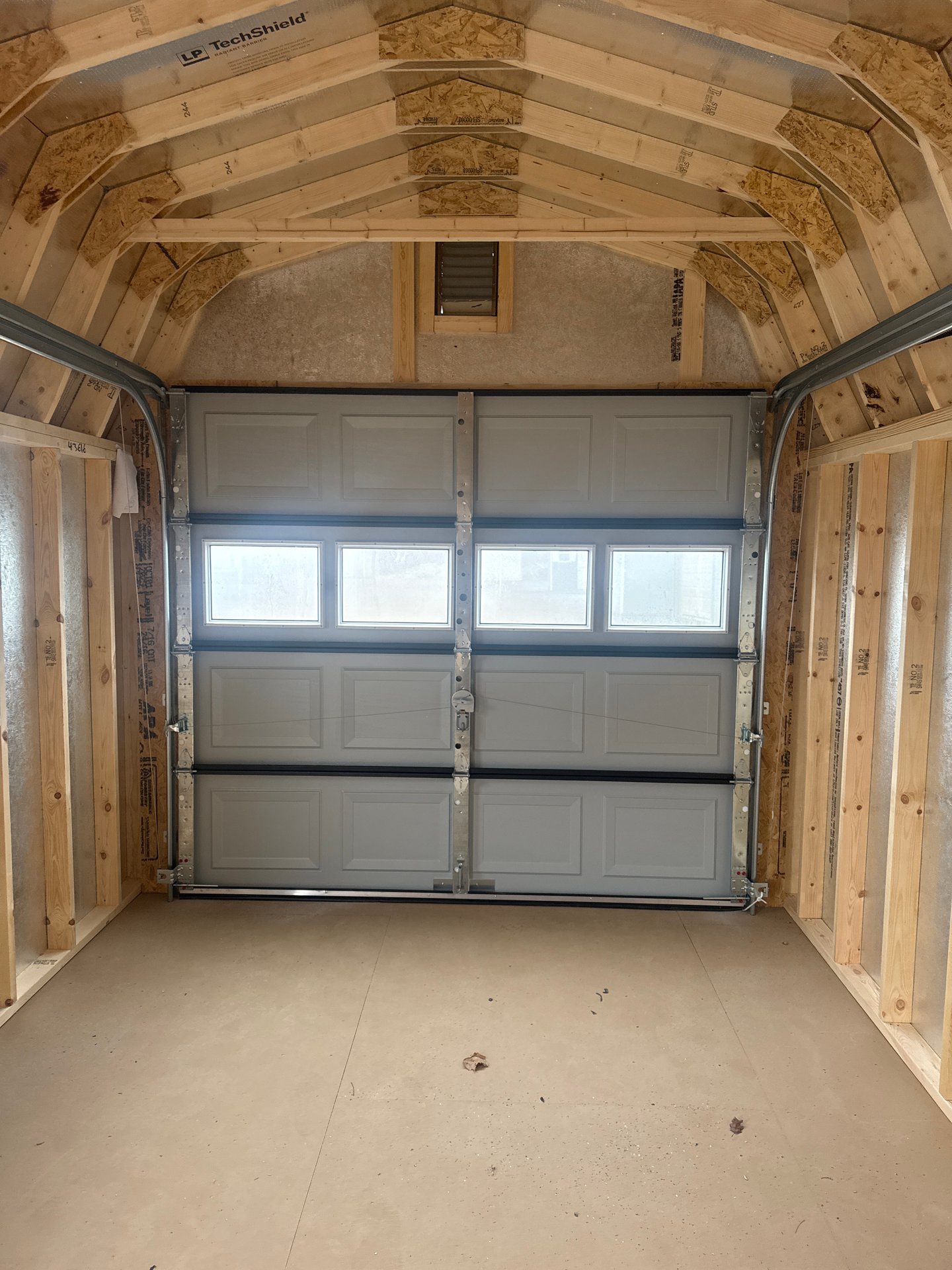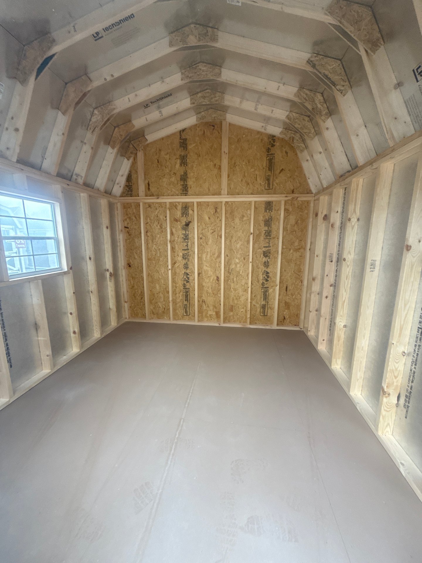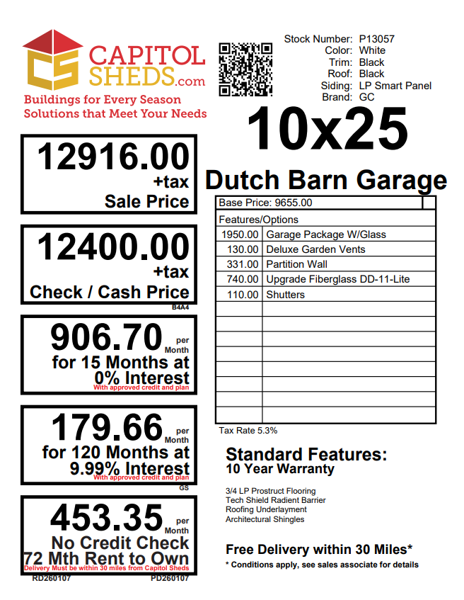 This 10×25 Dutch Barn Garage in Black with White trim combines classic charm with practical design. Constructed with durable Smart Panel siding, 2×4 wall and roof framing spaced 18″ on center, LP Tech Shield roof sheeting, and LP T&G Prostruct flooring on pressure-treated 2×4 joists 12″ on center, it’s built to last. Two windows bring in natural light, while the 6′ Double doors provide easy access and a stylish touch. Perfect for a storage shed, workshop, or small hobby space, this A-Frame offers a timeless design, high-quality construction, and functional features to fit any backyard or property.