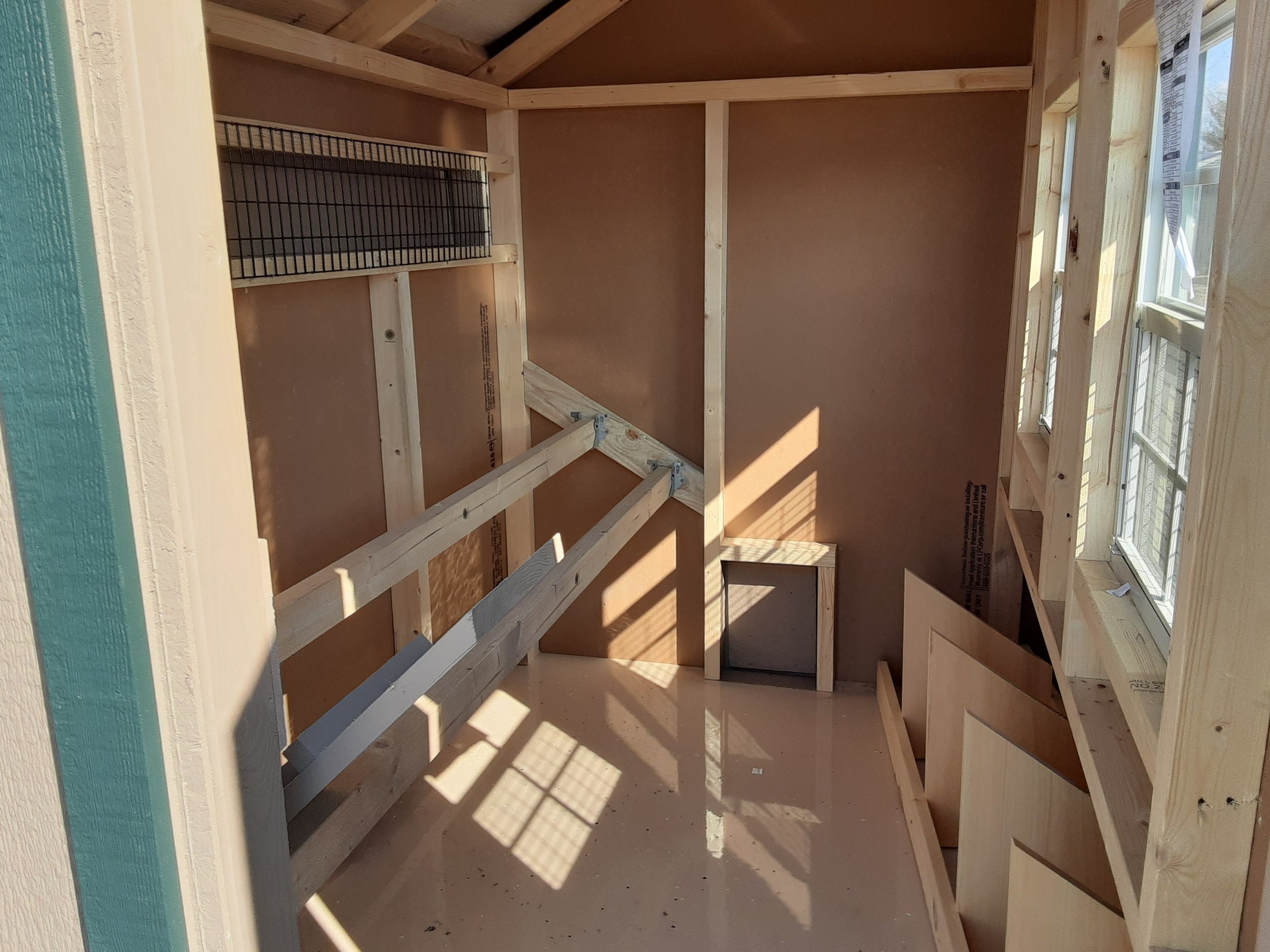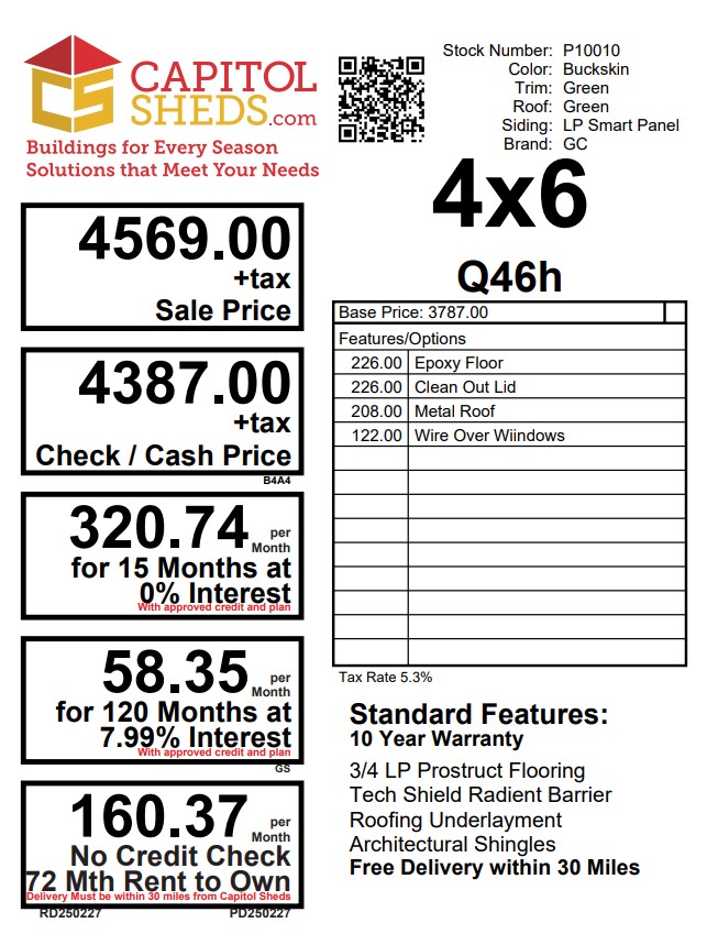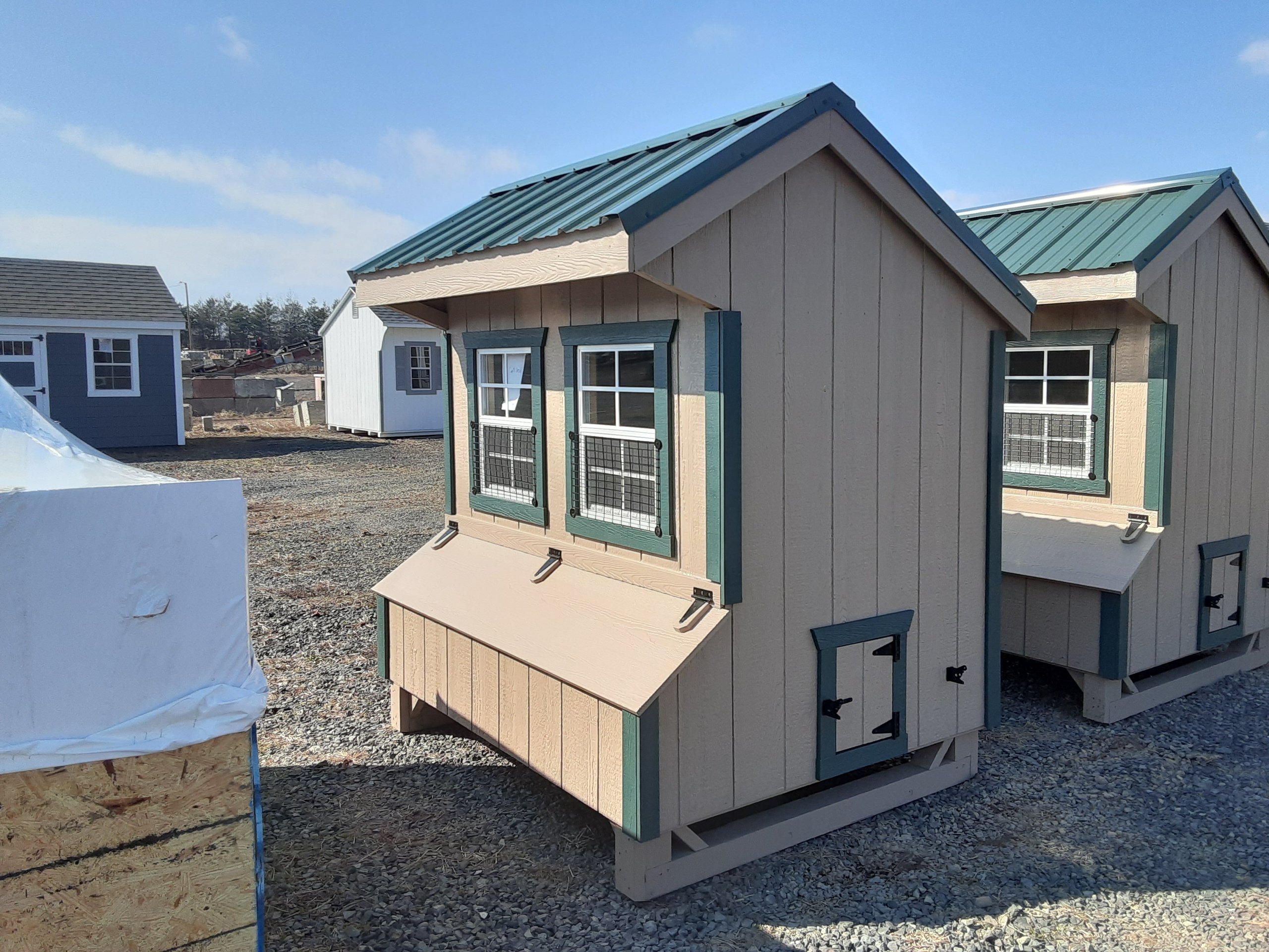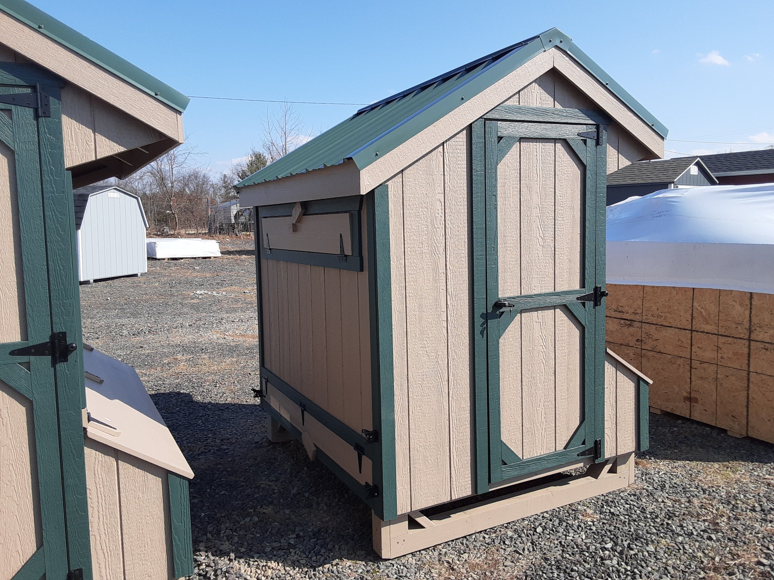 Style Name: Chicken Coop Size: 4×6 Siding: LP Smart Panel Main Color: Buckskin Trim Color: Green Roof Color: Green Roofing: Metal Roofing Underlayment: Roof Felt Wall Framing: 2×4 studs 16 inches on center Roof Framing: 2×4 rafters 16 inches on center Roof Sheeting: LP Tech Shield Upgraded Features: Epoxy Floor, Metal Roof