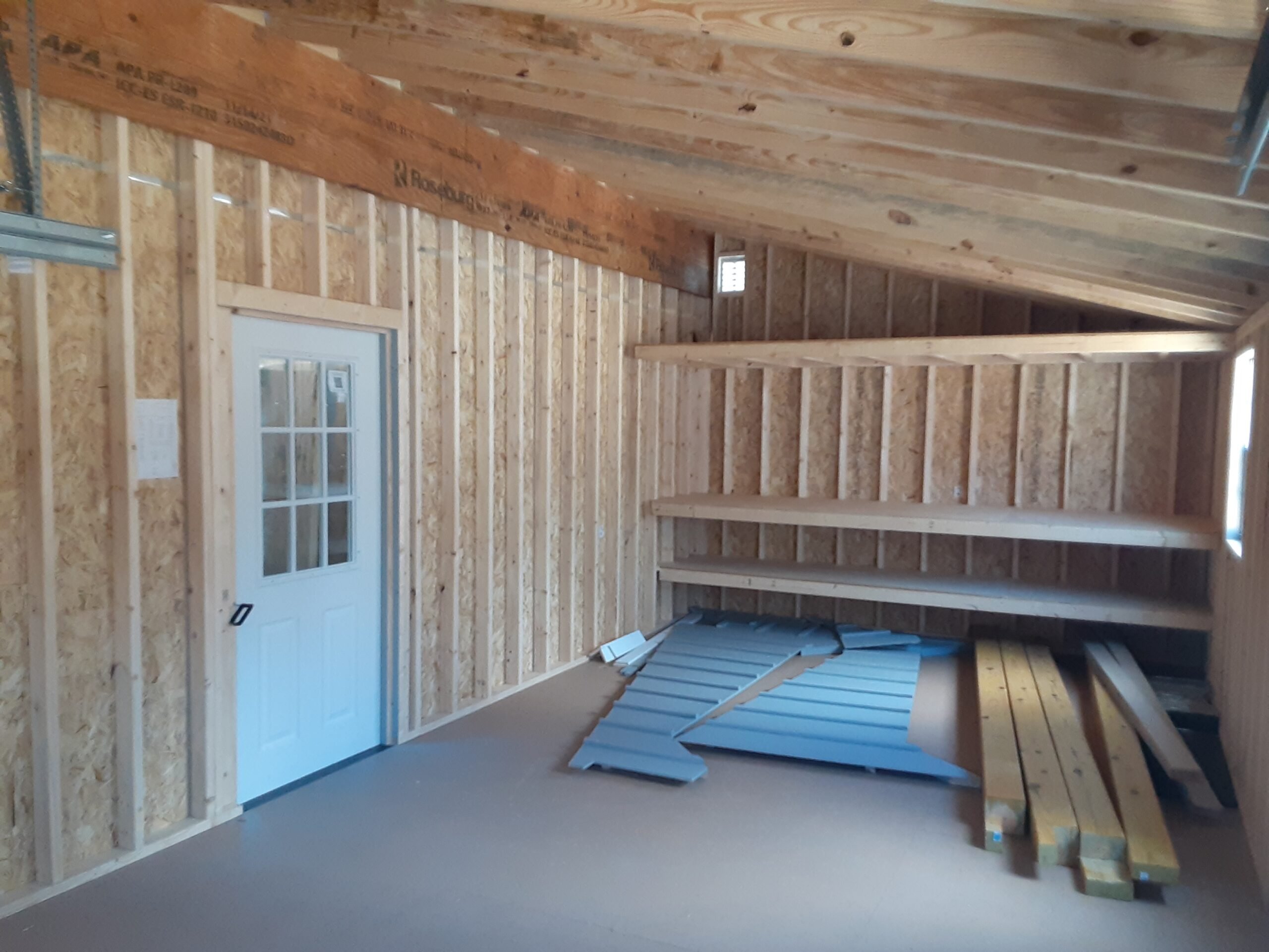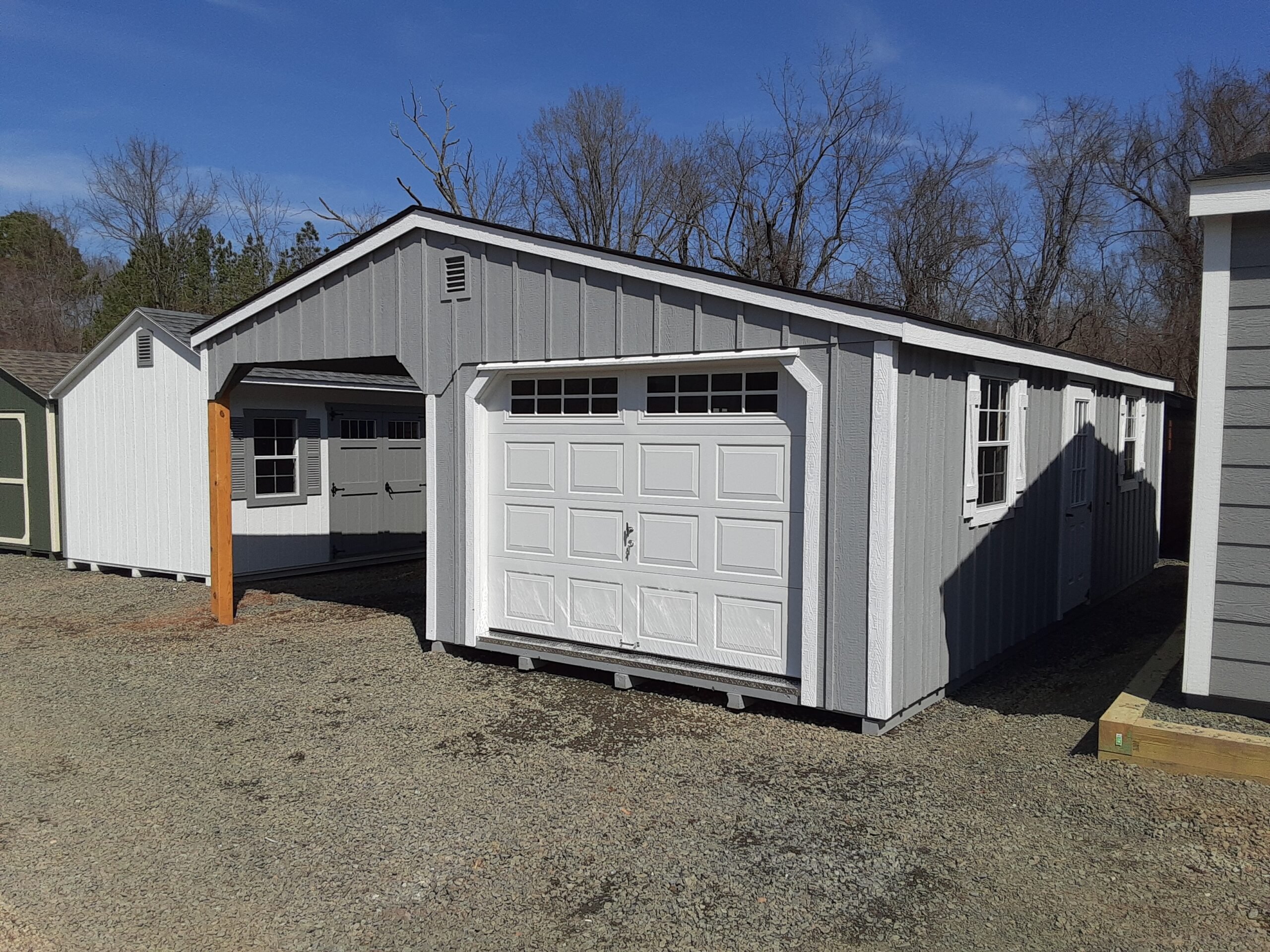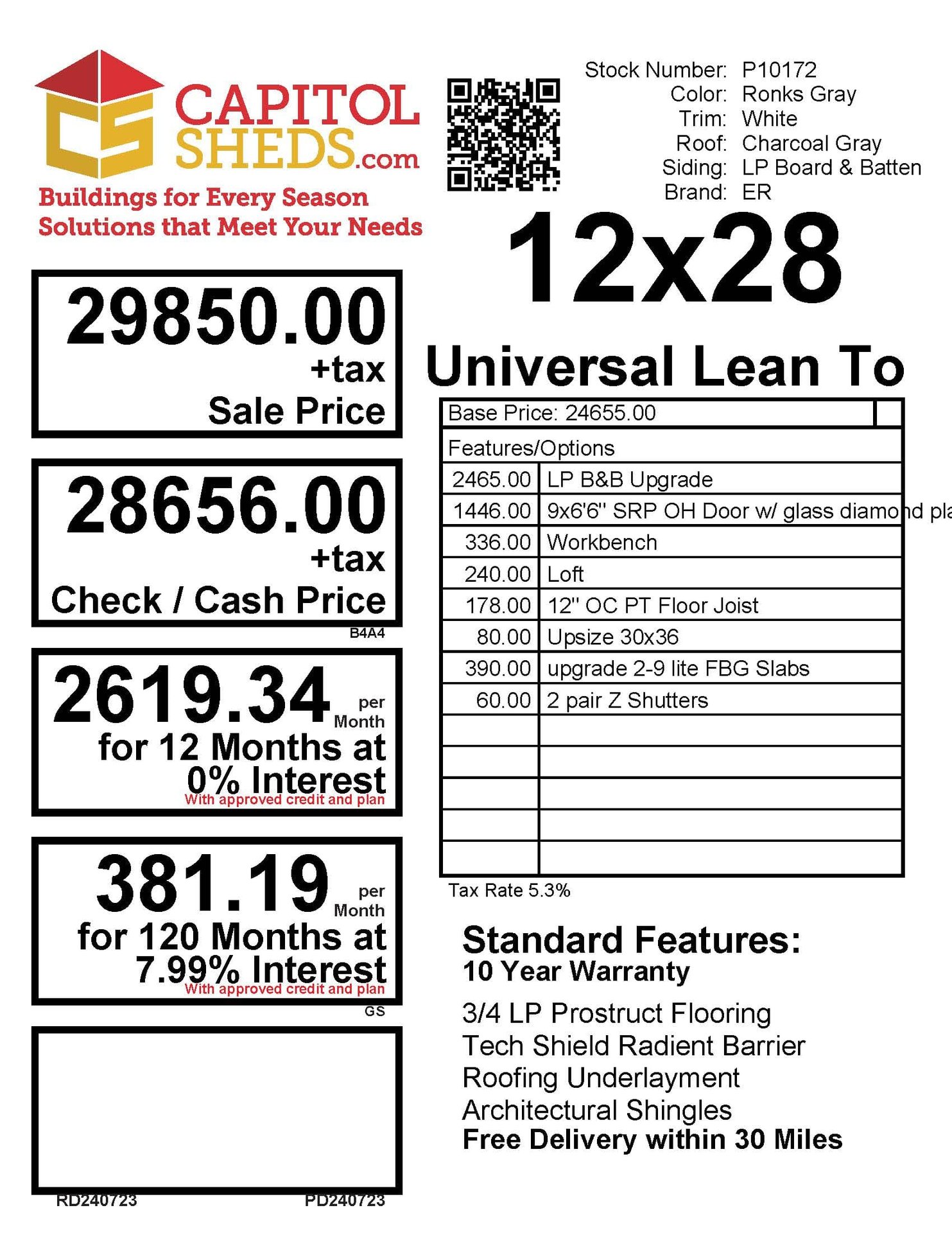 Discover the Universal Lean To Storage Shed, a spacious and stylish solution for your storage needs. Amish-built with 12×28 dimensions, it features durable LP Board & Batten siding in Ronks Gray with White trim. The Charcoal Gray IKO Cambridge Dimensional Shingles protect the roof, while 2×4 studs and rafters provide sturdy framing. Enjoy natural light through the two 30″ x 36″ windows and easy access with two 9 Lite doors. This shed comes with valuable upgrades like a 10′ Lean To, Garage Door w/ Glass, Work Bench, Loft, and more. With its practicality and timeless charm, it’s the perfect addition to your outdoor space.