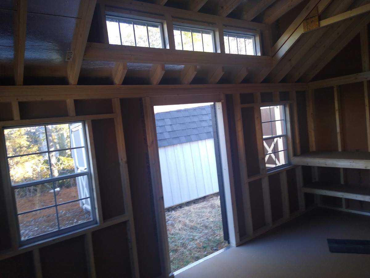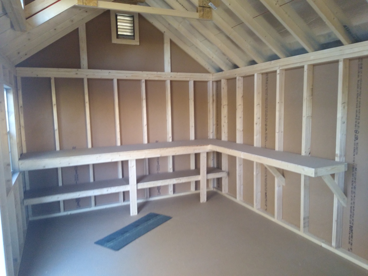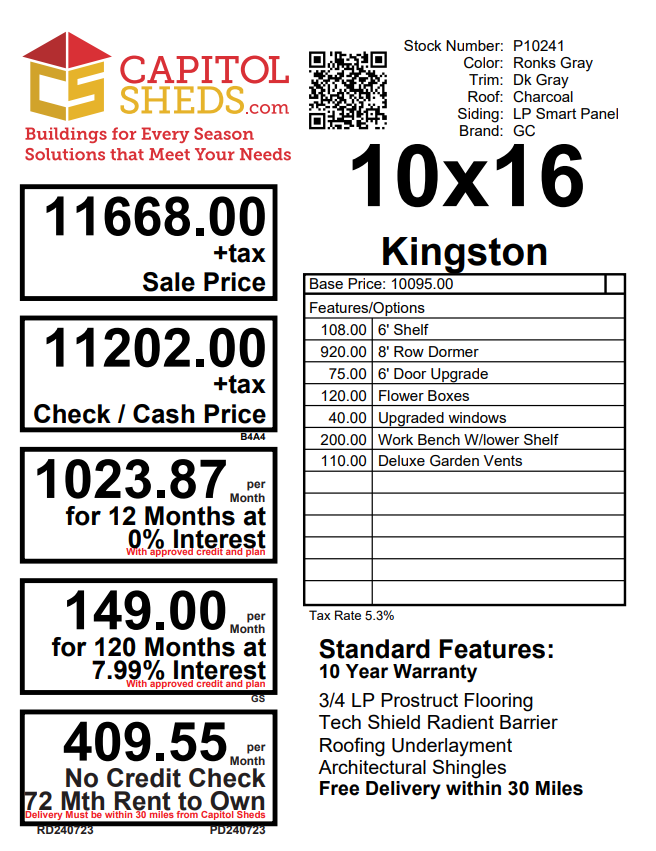 Style Name: Kingston Size: 10×16 Siding: Smart Panel Main Color: Ronks Gray Trim: Dark Gray Roof Color: Charcoal Roof : Shingles Number of Windows: 2-24×36 Number of Doors: 2 Garden Style vents Work Bench With lower Shelf 6′ Shelf 8′ Row Dormer Vinyl Flower Boxes Wall Framing: 2×4 Studs 16 inches on center Roof Framing: 2×4 rafters 16 inches on center Roof Sheeting: LP Tech Shield Flooring: LP Prostruct Flooring Floor Joists: Pressure Treated 2×4 Joists 16 inches on center
