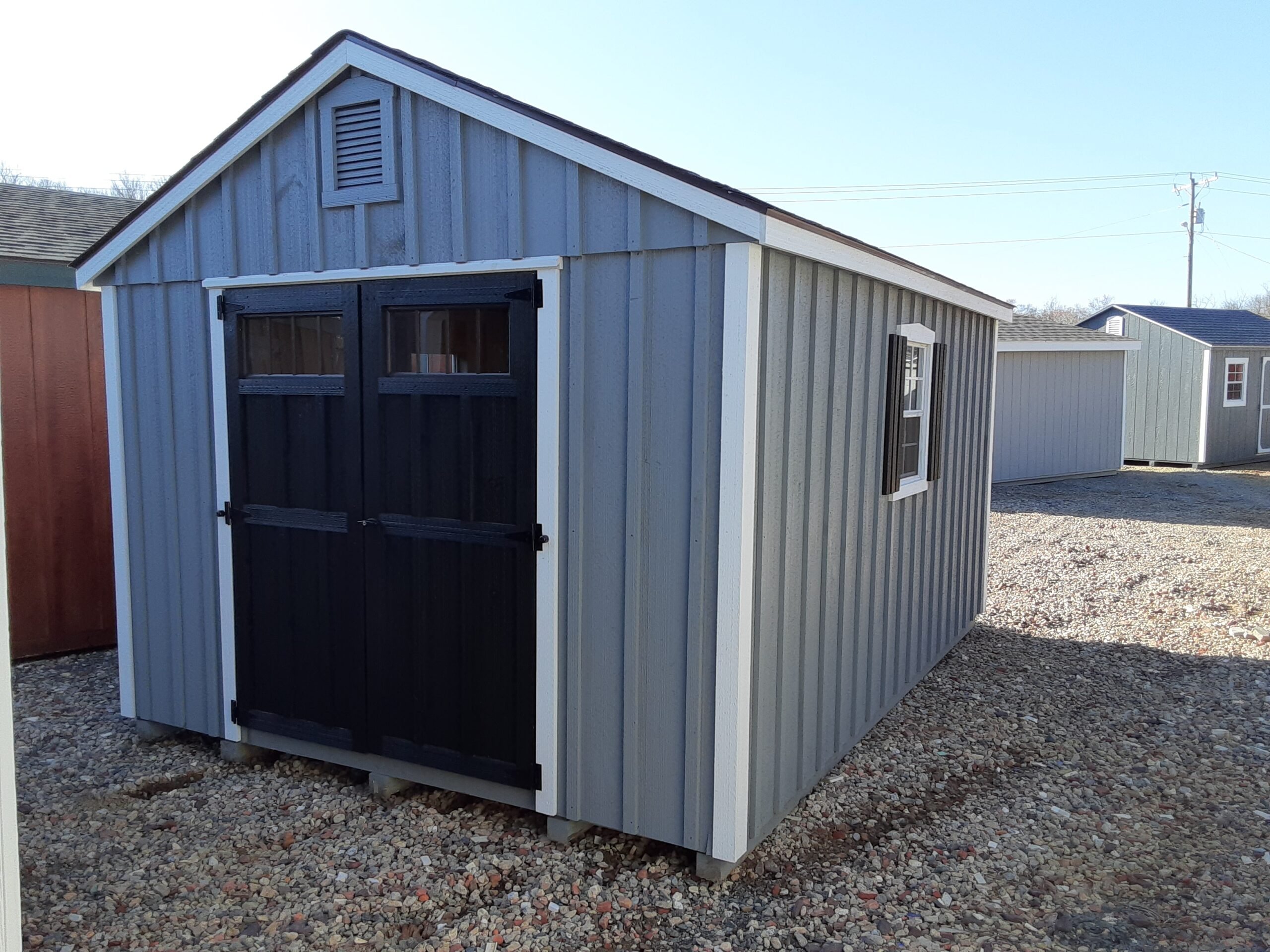 Introducing our Amish built A-Frame storage shed, sized at 10×14 feet and finished in Ronks Gray with white trim. The Pine Board & Batten siding and IKO Cambridge Dimensional Shingles add durability and style. The shed features two windows, two doors with transom windows, LP Prostruct Flooring, and pressure-treated 2×4 floor joists. It also includes upgrades such as garden vents, two 16″ shelves, and painted doors. The shed’s 2×4 wall and roof framing provide strength to withstand harsh weather conditions. Invest in this quality shed for ample storage space and an attractive addition to your outdoor area.