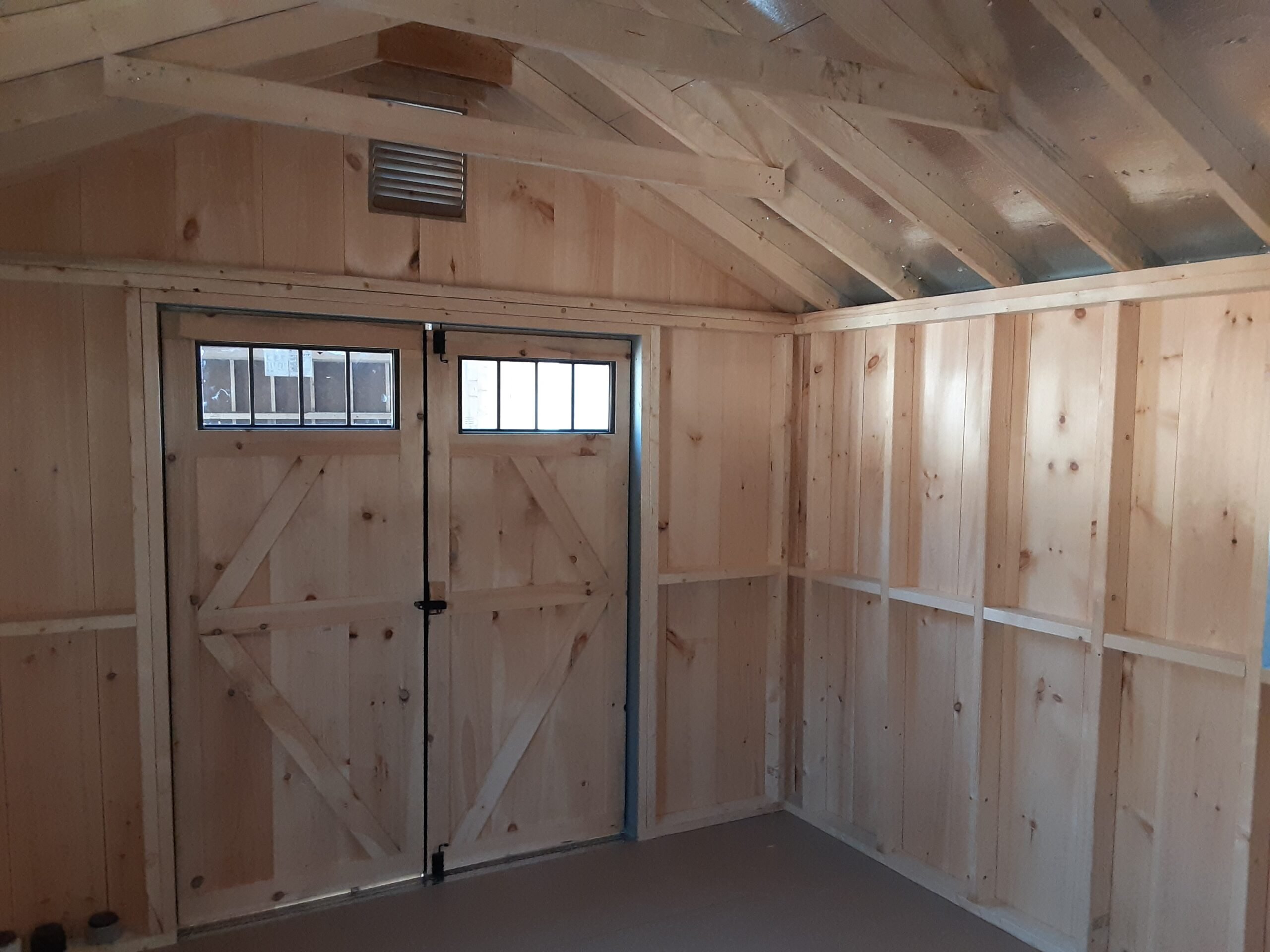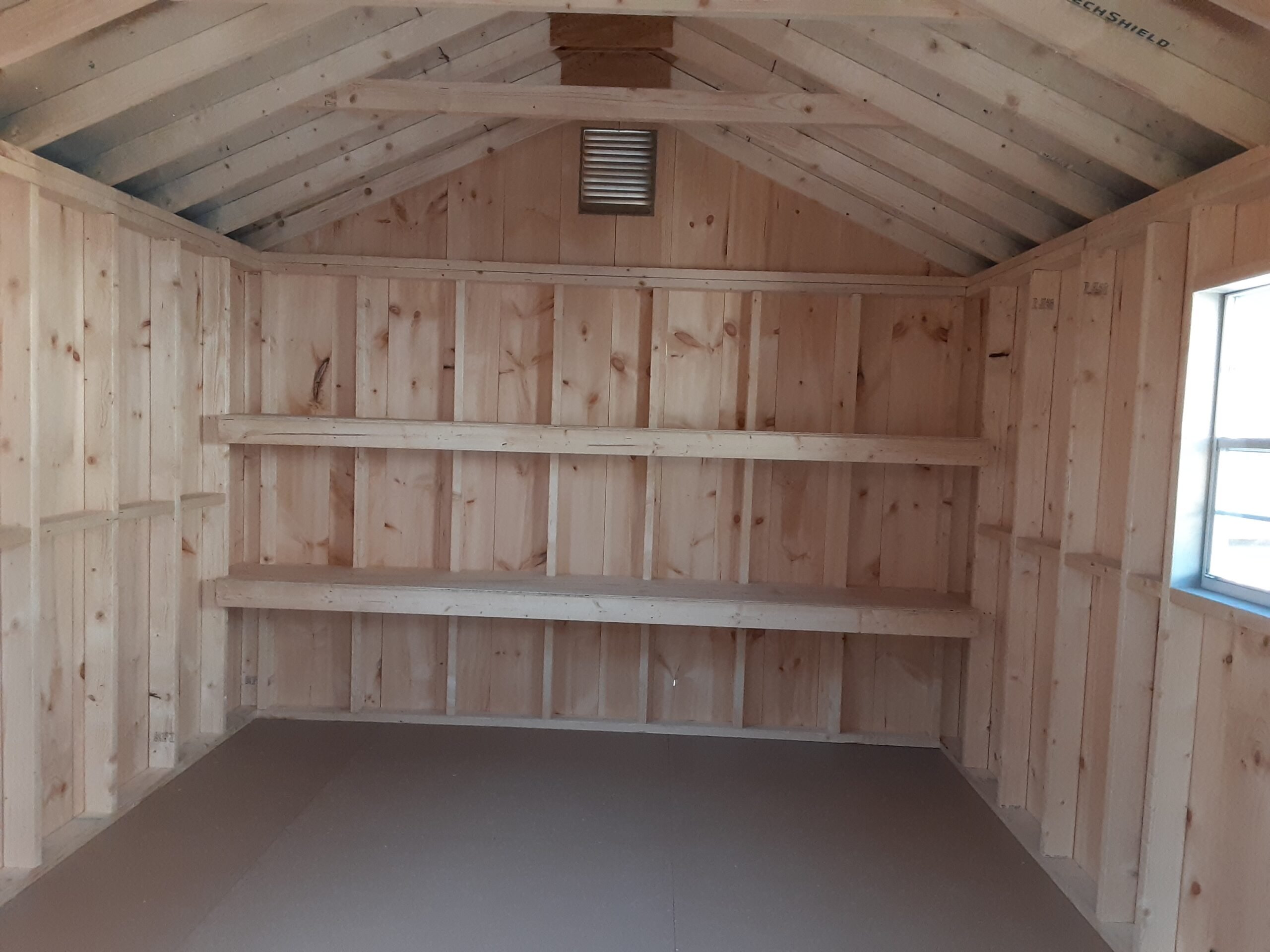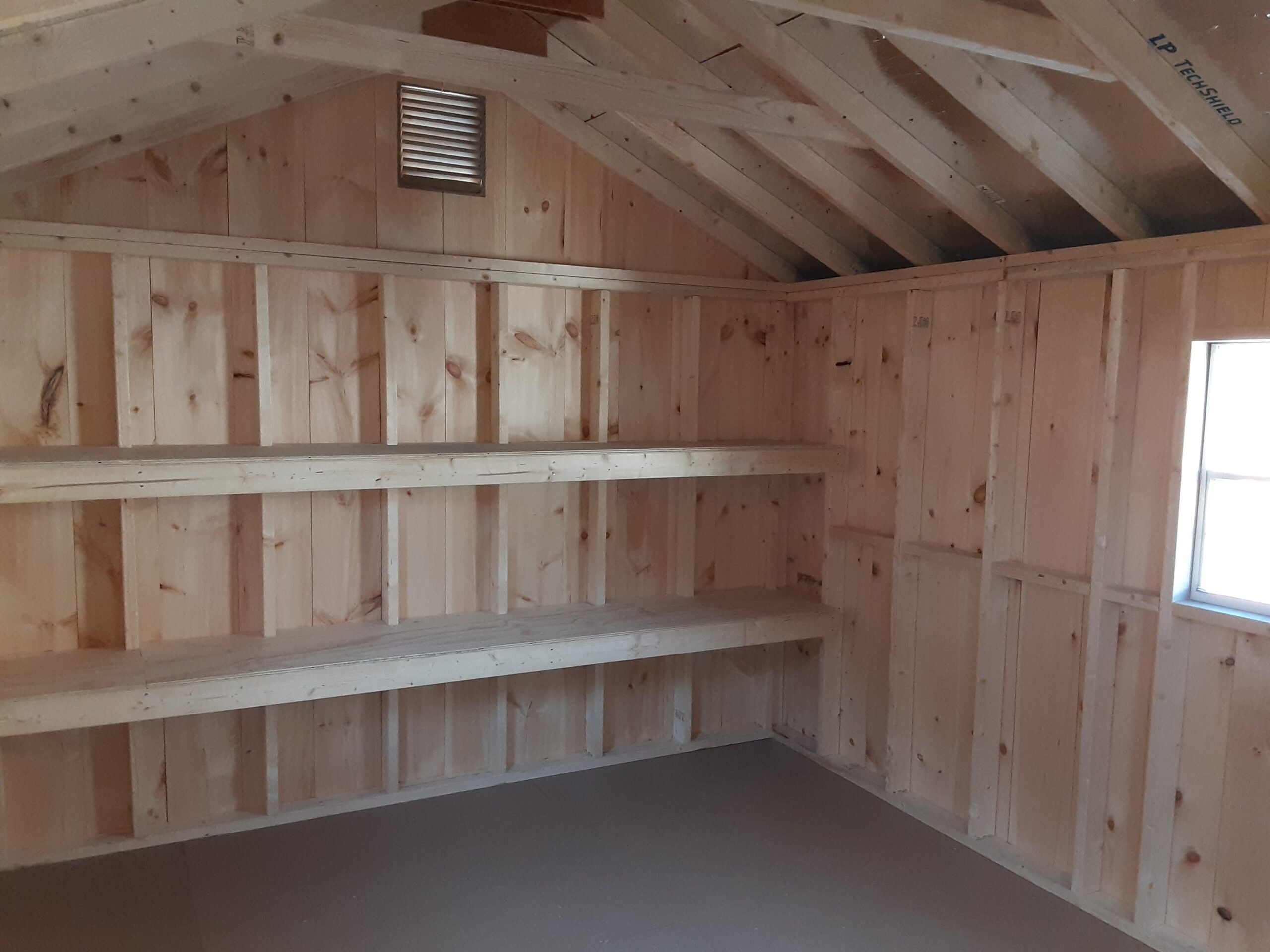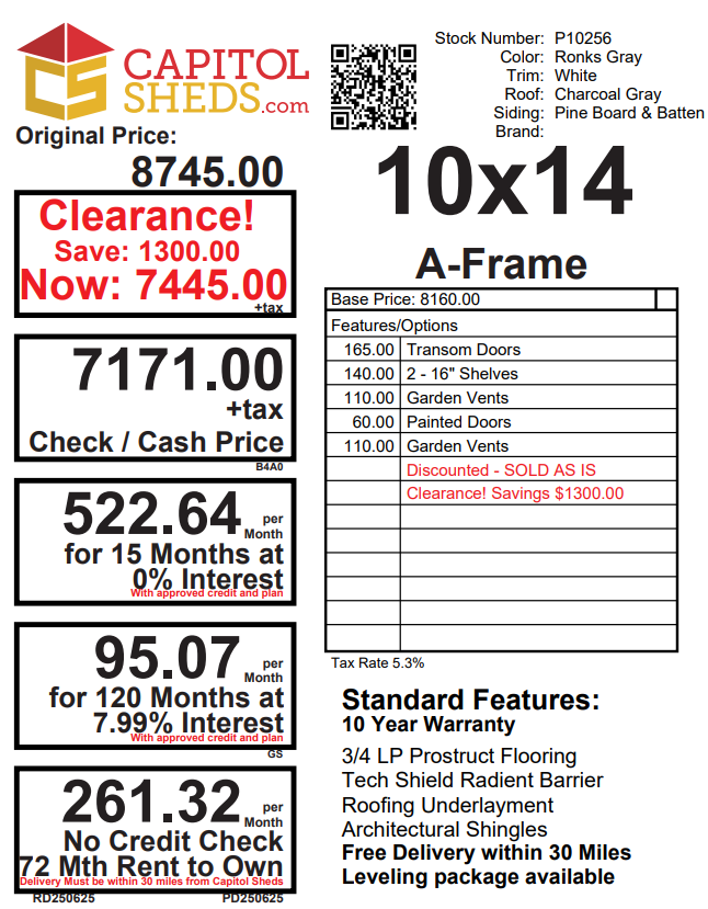 Style Name: A-Frame Size: 10×14 Siding: Pine Board & Batten Main Color: Ronks Gray Trim Color: White Shingle Color: Charcoal Gray Shingles: IKO Cambridge Dimensional Shingles Number of Windows: 2 Number of Doors: 2 Wall Framing:2×4 studs 16 inches on center Roof Framing:2×4 rafters 16 inches on center Roof Sheeting:LP Tech Shield Flooring: LP Prostruct Flooring Floor Joists: Pressure Treated 2×4 joists 16 inches on center Included Upgrades: Transom Doors (2) 16″ shelves Garden Vents Painted Doors