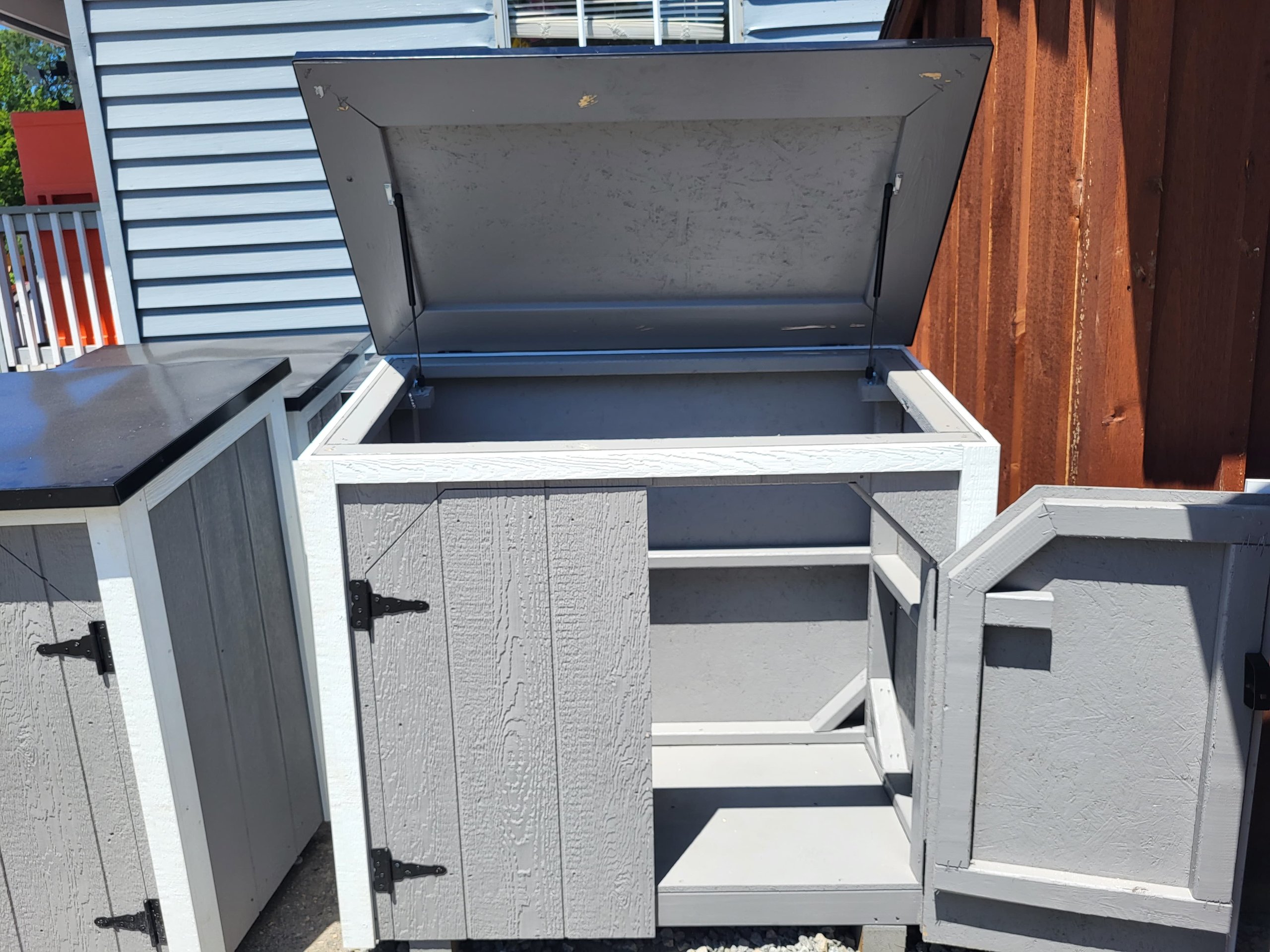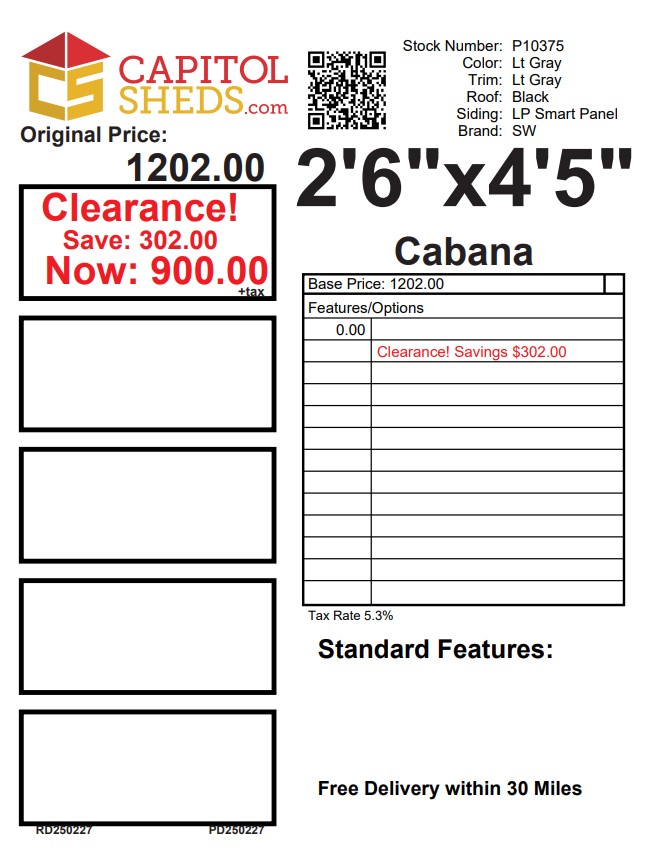 Introducing the Cabana, a compact yet stylish outdoor storage solution. With dimensions of 2’6″ x 4’5″, it’s perfect for storing tools, cushions, or pool accessories. Featuring durable LP Smartpanel siding in a sleek Light Gray finish, complemented by matching trim. The lid, constructed from sturdy metal, adds a touch of sophistication with its sleek Black color. This Cabana is not just practical but also adds aesthetic appeal to any backyard or patio space.