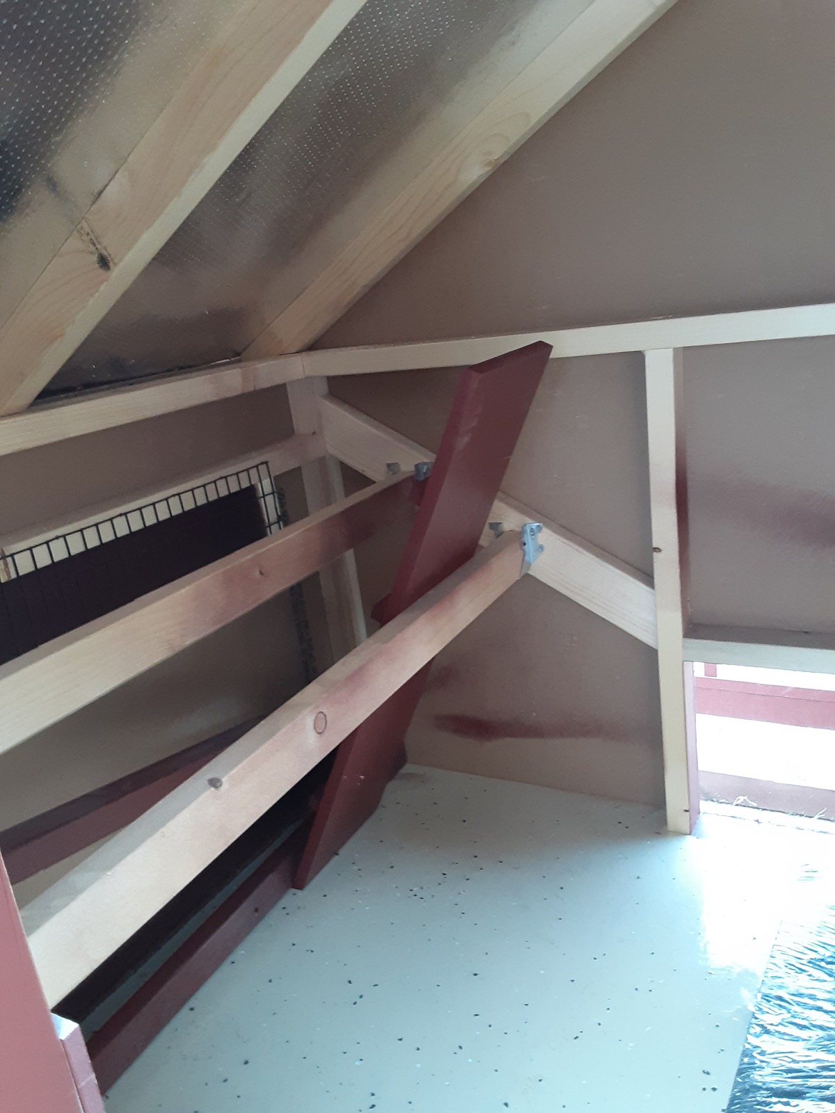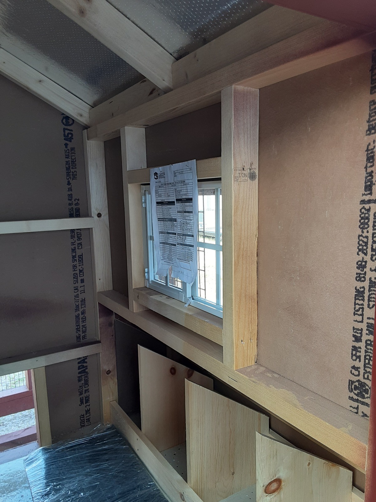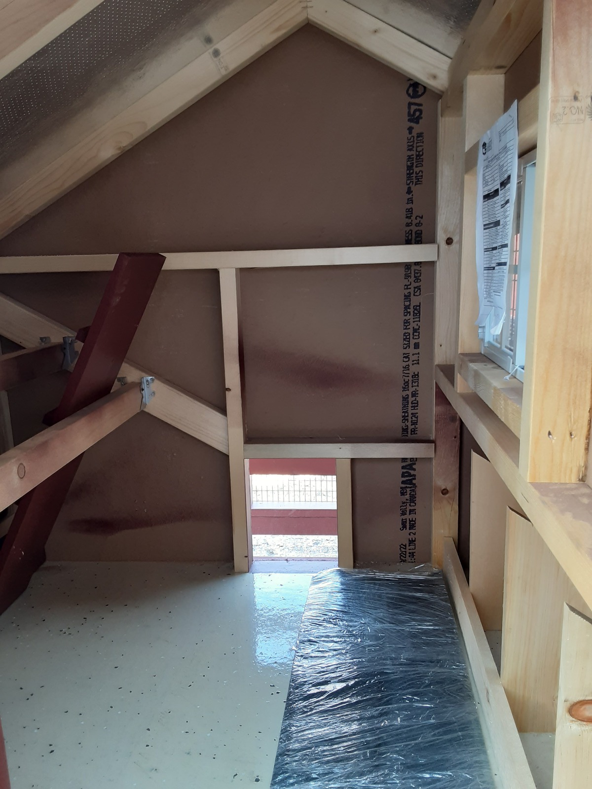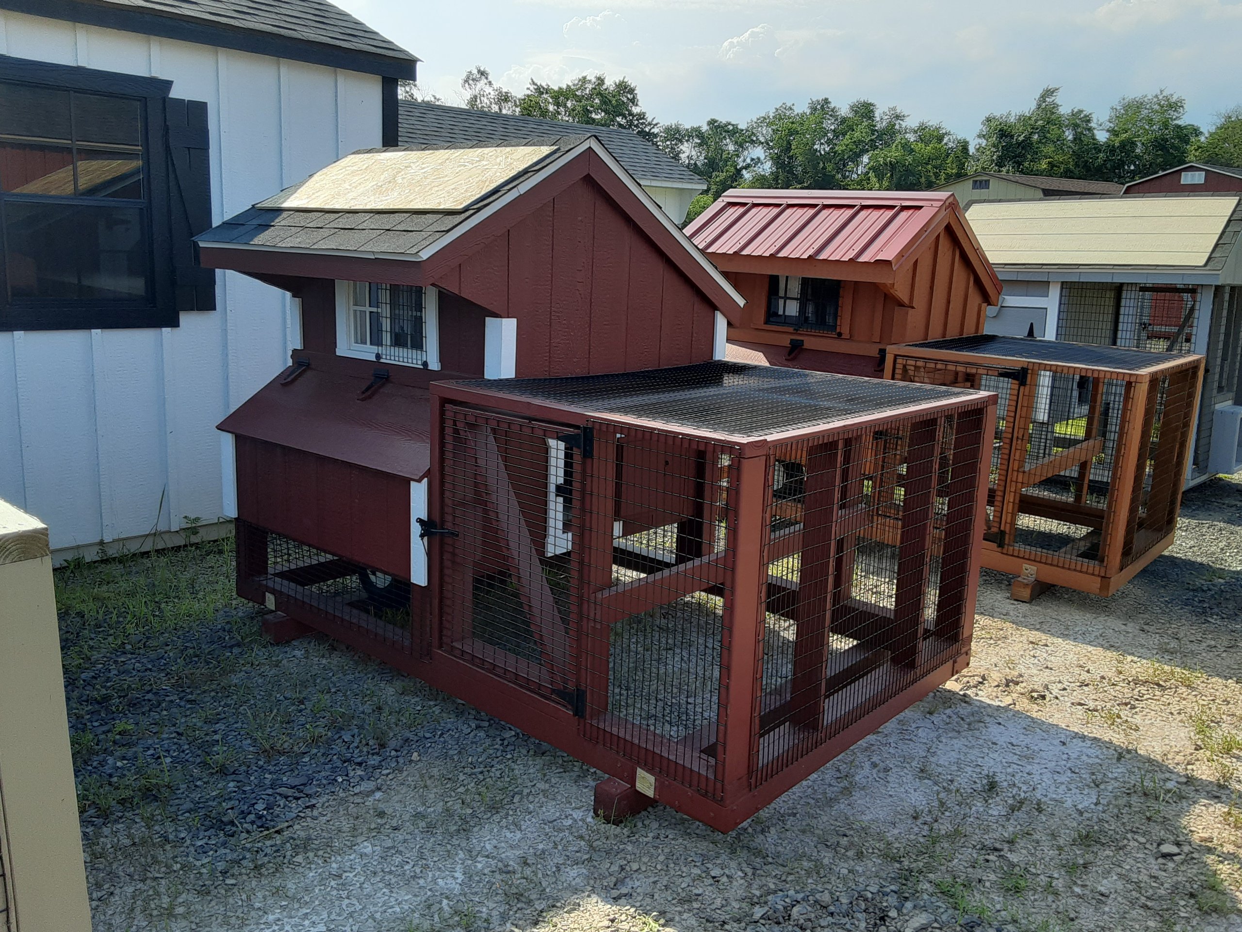 Name: Tractor Coop Size: 4×4 Siding: Lp Smart Panel Main Color: Red Trim Color: White Roof Color: Charcoal Roof: Shingeled Number of Windows: 1 Number of Doors: 1 Epoxy Floor Wire over window Clean out Lid Wall Framing: studs 16 inches on center Framing:2×4 rafters 16 inches on center Sheeting: Tech Shield Flooring: Prostruct Flooring Floor Joists:Pressure Treated 2×4 joists 16 inches on center Included Upgrades: Epoxy Floor Metal Roof