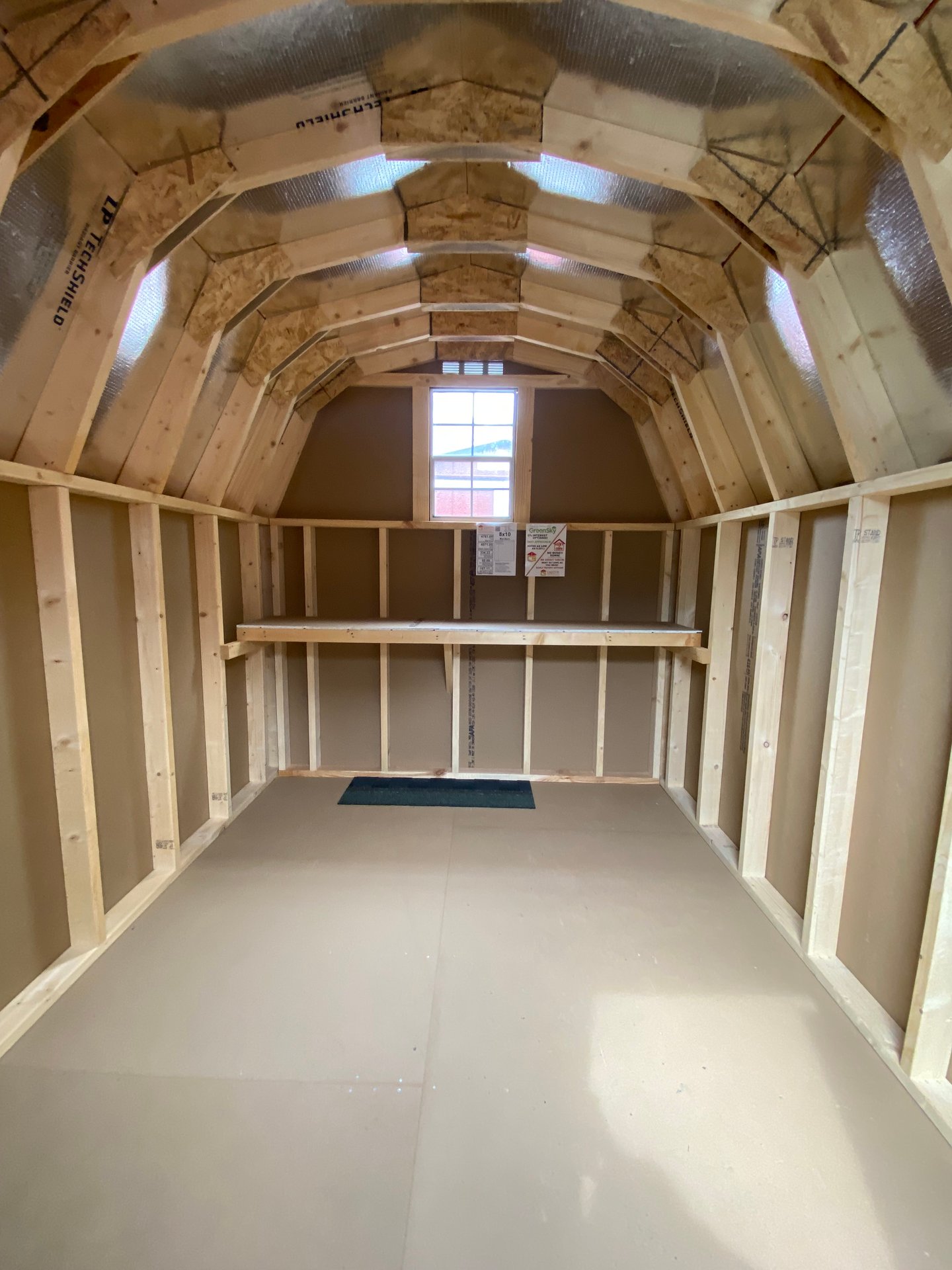 Introducing the Mid Barn Amish Built Storage Shed: a durable and stylish solution for your storage needs. With LP Smart Panel siding in a striking red color, white trim, and IKO Cambridge Dimensional Shingles in charcoal, this 8×10 shed is built to withstand the elements. It features a window for natural light, two doors for easy access, and a 16″ shelf for added storage. Crafted with 2×4 framing, LP Prostruct Flooring, and pressure-treated joists, this shed ensures strength and stability. Experience exceptional craftsmanship and functionality with the Mid Barn, a timeless addition to your outdoor space.