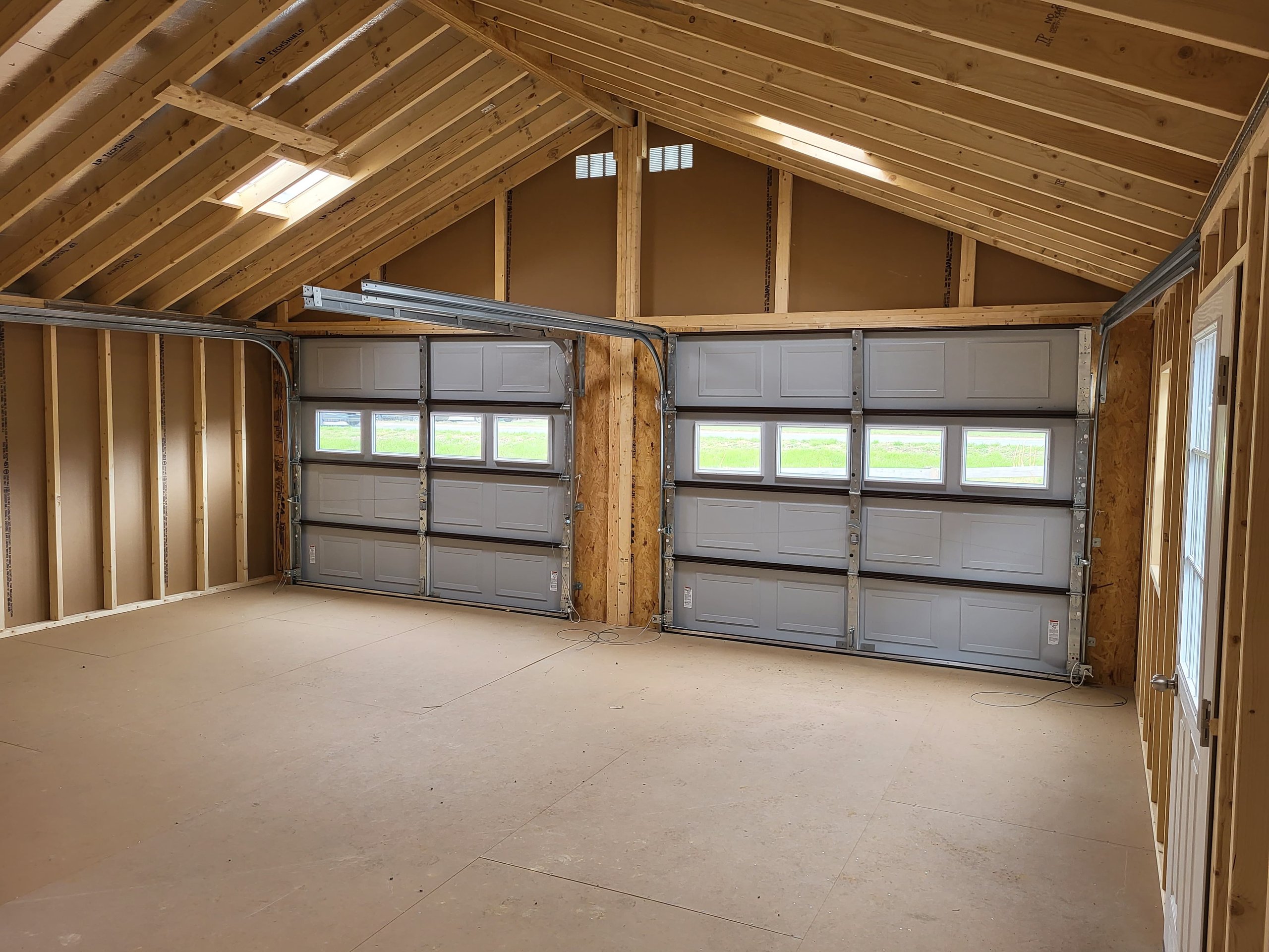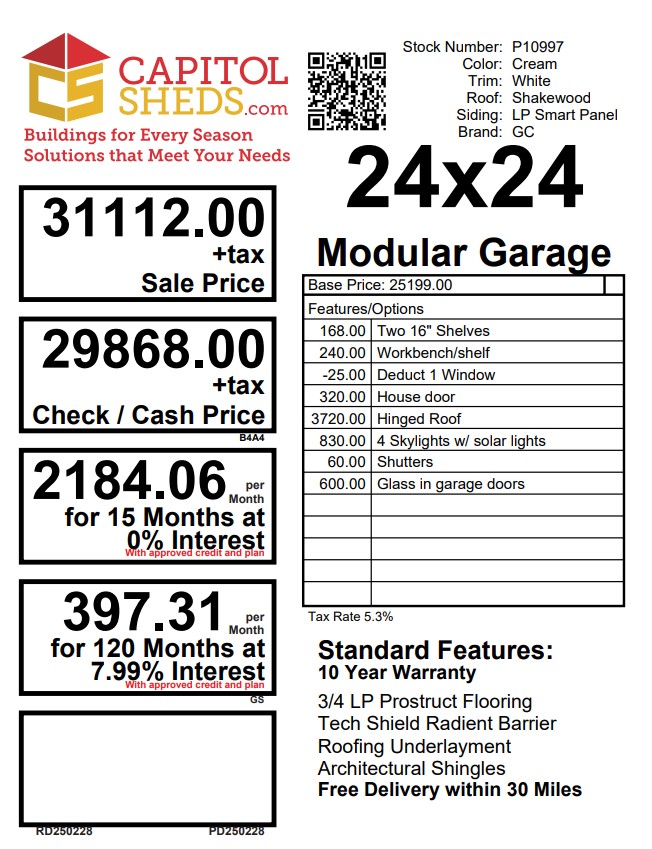 The 24×24 Modular Garage is a robust and spacious structure featuring LP Smartpanel siding in a cream main color with white trim, topped with a Shakewood-colored shingle roof. Built with 2×4 studs and rafters 16 inches on center, it includes roof felt underlayment and LP Tech Shield roof sheeting for enhanced durability and insulation. Upgraded features add functionality and aesthetic appeal: two shelves, a workbench, a house door, a hinged roof, four skylights, glass in garage doors, and shutters. This garage combines practicality with style, making it a perfect solution for secure storage and workspace needs.