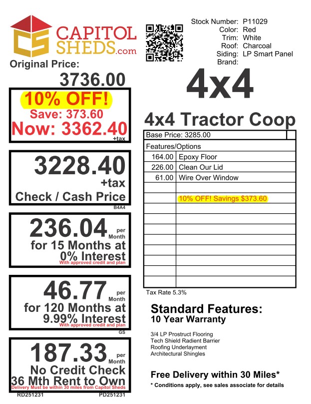 Reserve this chicken coop for a $500 deposit. Within 1 business day a rep will contact you to discuss delivery details and discounts you may qualify for. Don’t lose out on this beautiful chicken coop – Place your deposit today to hold it!