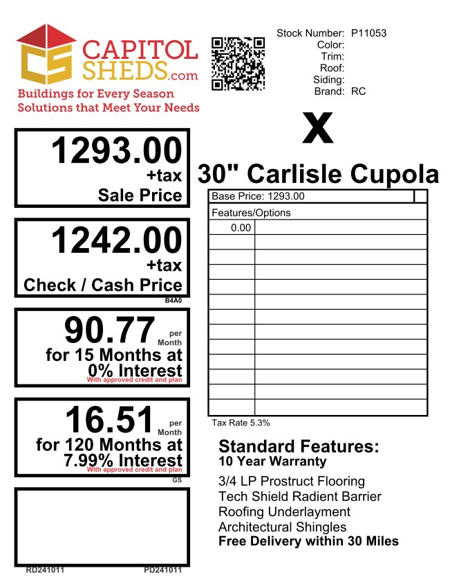 Reserve this cupola for a $500 deposit. Within 1 business day a rep will contact you to discuss delivery details and discounts you may qualify for such as cash/check, military/1st responder, etc. Don’t lose out on this beautiful structure to add to your building – Place your deposit today to hold it!