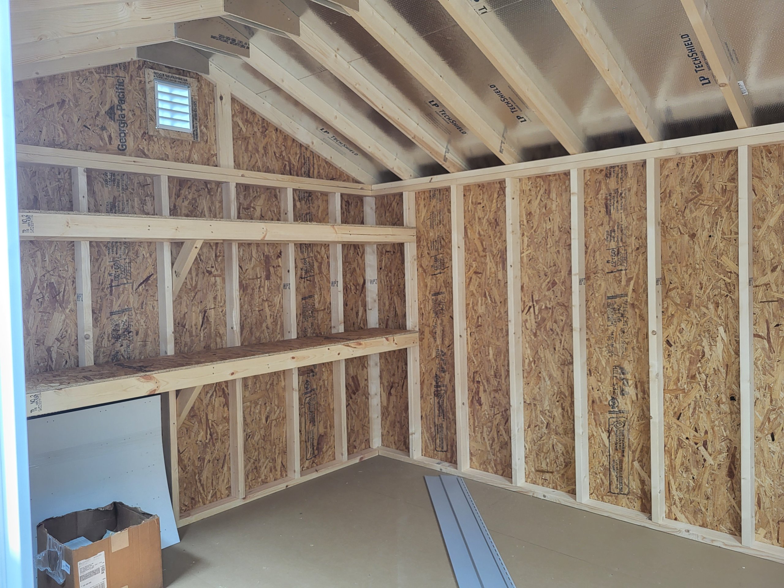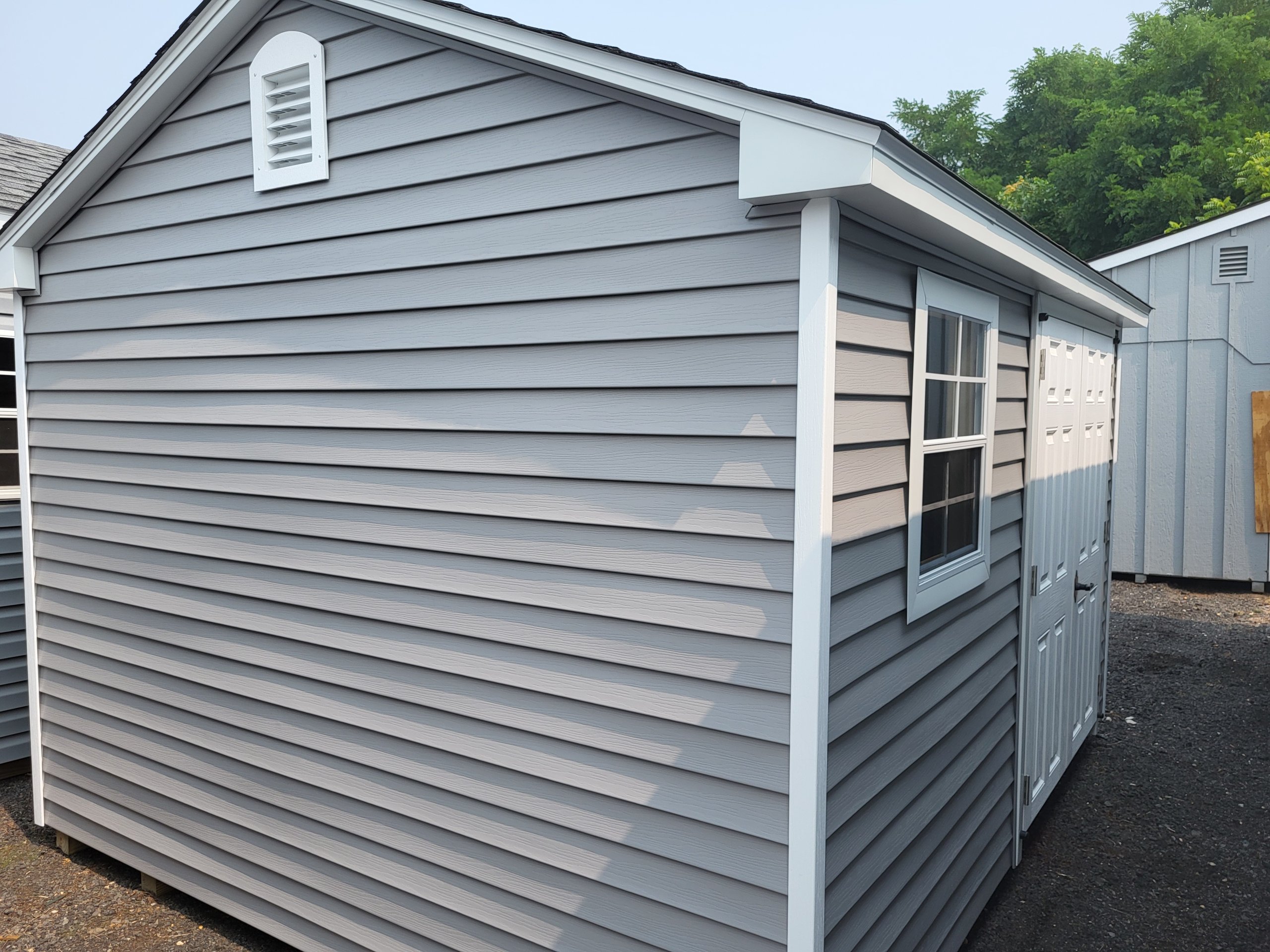 Upgrade your storage with this 10×12 Amish-built shed, designed for durability and style. Featuring sleek Slate vinyl siding with White trim, it’s topped with Dual Black dimensional shingles and roof felt underlayment for superior protection. Built with 2×4 wall and roof framing, LP Tech Shield roof sheeting, and premium butt hinges, it ensures lasting strength. Inside, two spacious shelves provide efficient organization for tools, equipment, and supplies. Whether used for storage, a workspace, or a backyard retreat, this shed combines expert craftsmanship with practical upgrades, offering a reliable and attractive solution for your outdoor storage needs.
