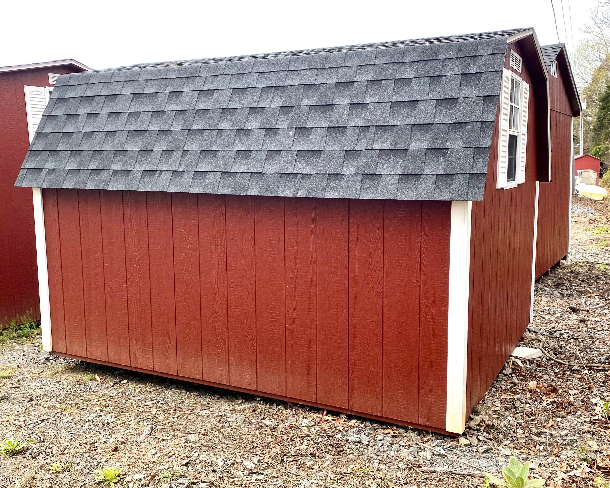 Introducing the Traditional Dutch Barn -A masterpiece of craftmanship by the Amish artisans. This 4′ Mini Barn is built to endure, offering exceptional quality and functionality for all your storage needs. The 4′ Mini Barn siding provides superior durability while exuding timeless elegance in Red, complemented by pristine White Trim. The Charcoal colored dimensional shingles protect your belongings from the elements ensuring long-lasting reliability. With two doors for easy access, the interior boasts 2×4 stud wall framing, 2×4 rafter roof framing, and LP Tech Shield roof sheeting for added strength. The LP Prostruct Flooring, coupled with pressure-treated 2×4 floor joists ensures stability and longevity. invest in the 4’Mini Barn for a storage solution that’s built to last.