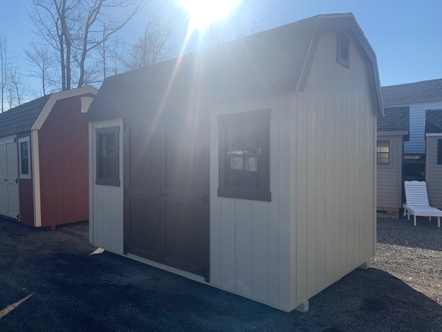 Introducing the New England Dutch Shed, an elegant 8×12 storage solution with Duratemp siding in a timeless Beige hue. With a sturdy construction, it features a Brown shingle roof, 2 windows, and 1 upgraded 5′ Double Door. The Dark Brown trim adds a touch of sophistication, while the Pressure Treated Floor ensures durability. Enhancements like Classic Vents, Diamond Treadplate, and Felt Roof Paper provide added functionality and style. Experience the convenience of the New England Dutch Shed, perfect for storing your belongings in a charming and reliable space.