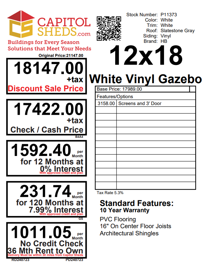 Style Name: White Vinyl Gazebo Size: 12×18 Siding: Vinyl Main Color: White Trim Color: White Roof Color: Slatetone Gray Roof: Shingles Number of Doors: 1 single door Wall Framing:2×4 studs 16 inches on center Roof Framing:2×4 rafters 16 inches on center Roof Sheeting:LP Tech Shield Flooring: 5/12 Plywood Flooring Floor Joists:Pressure Treated 2×4 joists 16 inches on center
