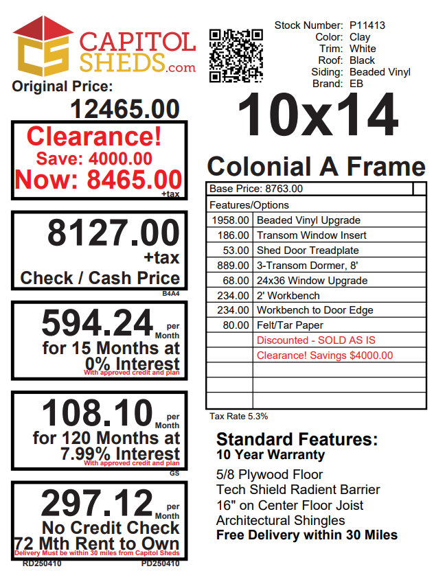 Style Name: Colonial A-frame Size: 10×14 Siding: Beaded Vinyl Main Color: Clay Trim Color: White Roof Color: Black Roof: Shingles Number of Windows: 2 Number of Doors: 2 Wall Framing:2×4 studs 16 inches on center Roof Framing:2×4 rafters 16 inches on center Roof Sheeting: LP Tech Shield Flooring: 5/12 Plywood Floor Joists: Pressure Treated 2×4 joists 16 inches on center