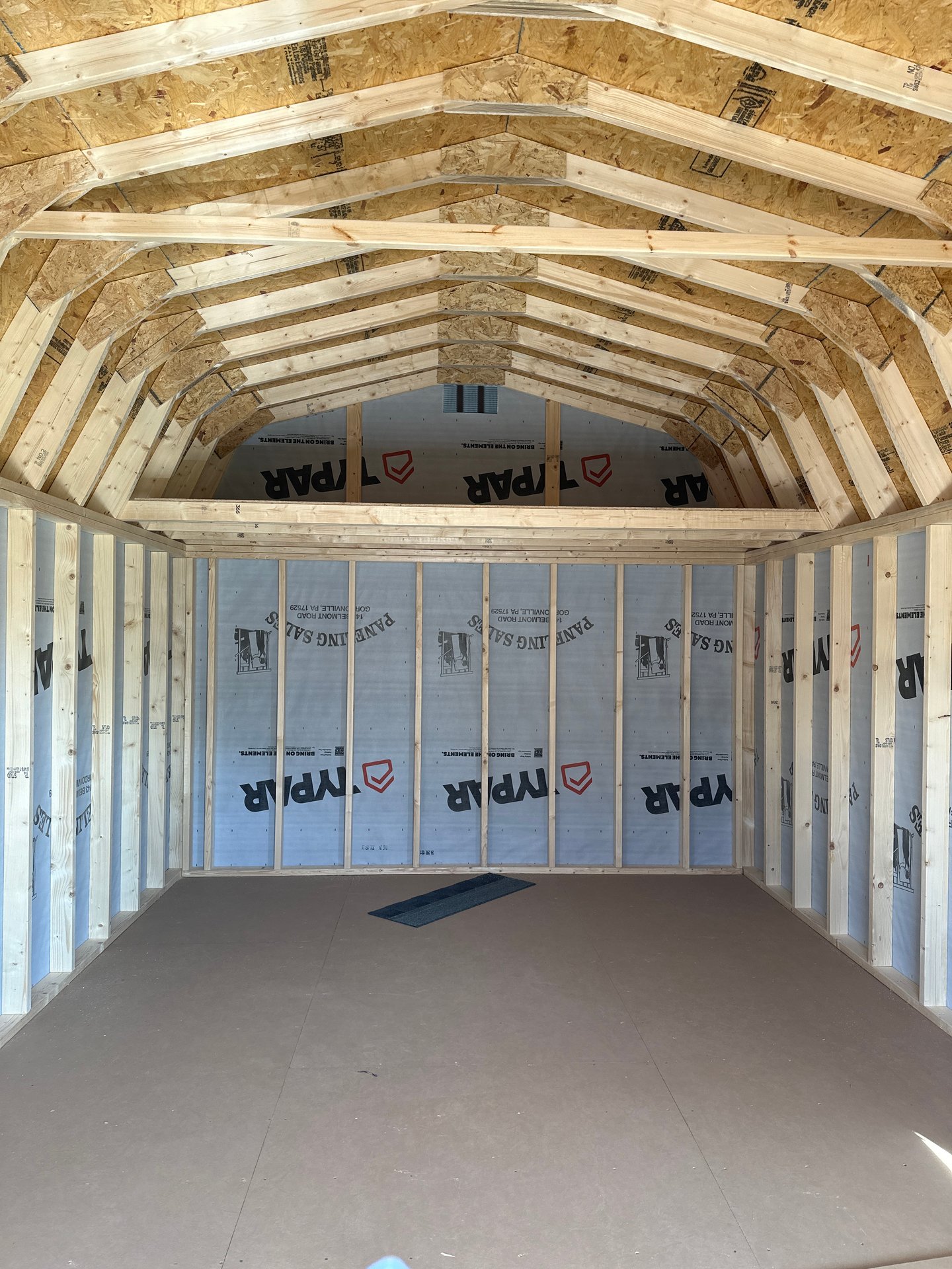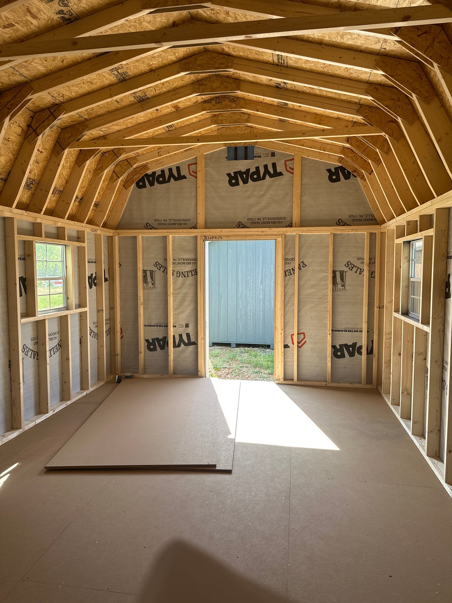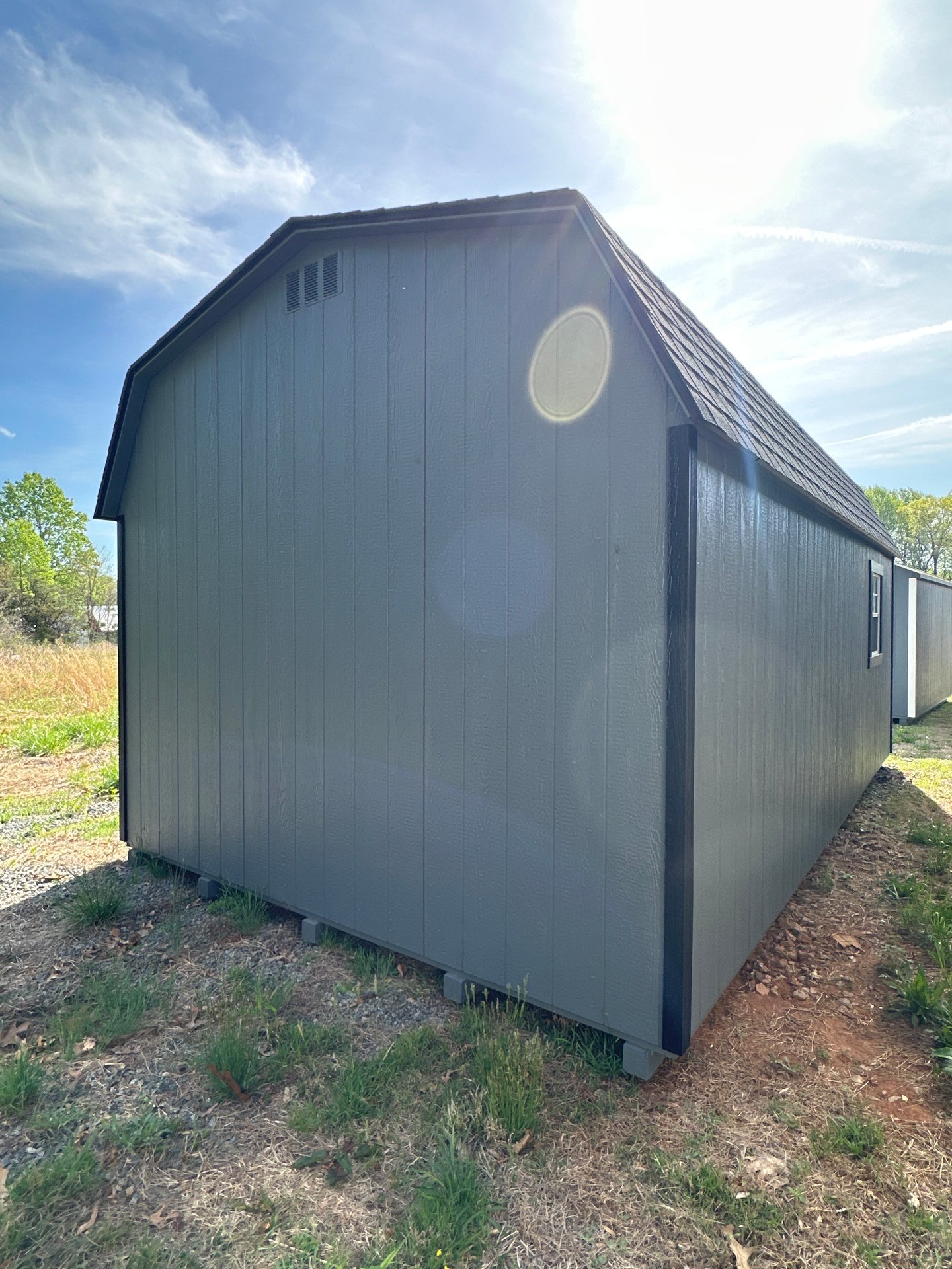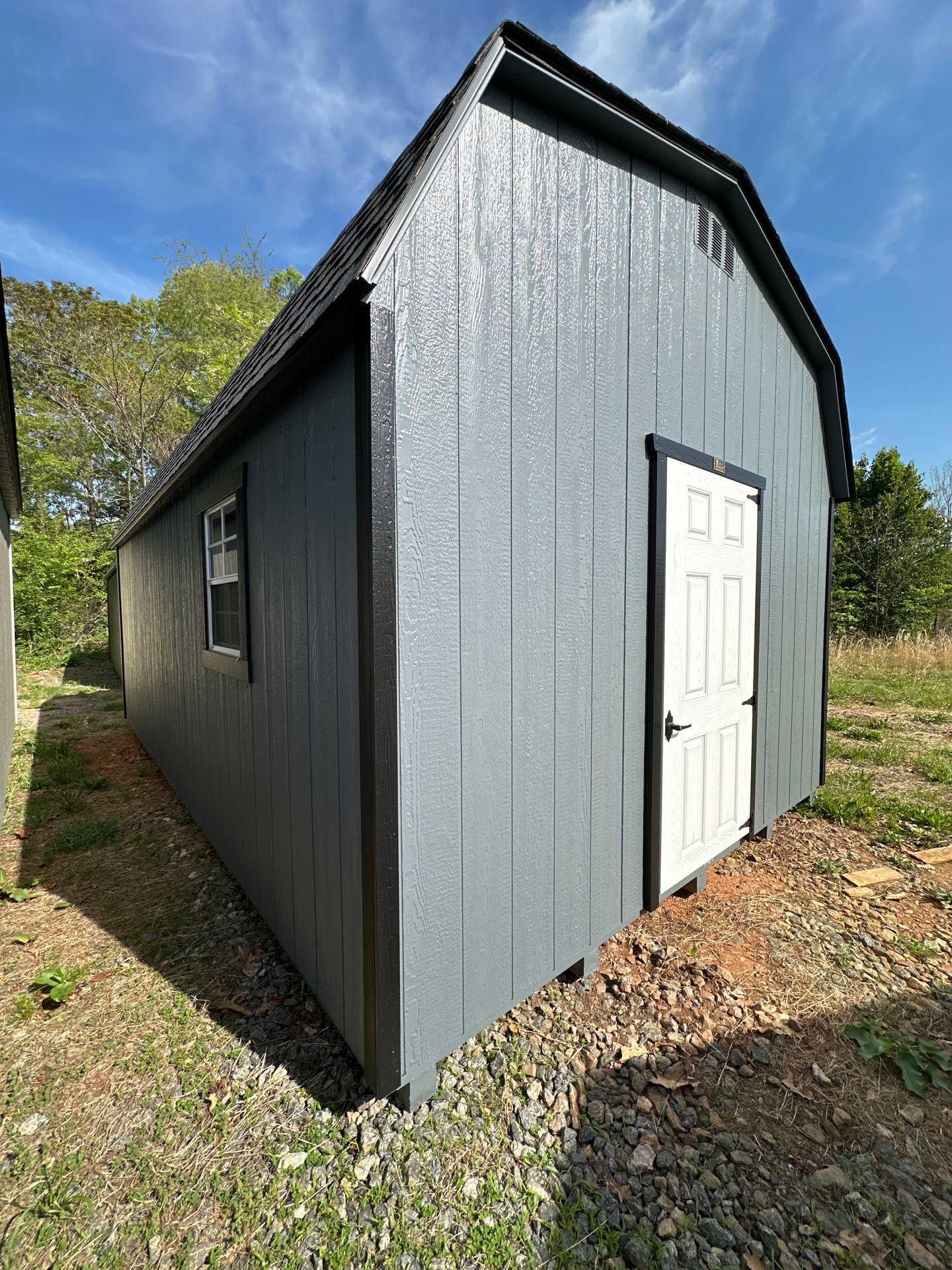 Style Name: Dutch Barn Size: 12×20 Siding: LP Smart Panel Main Color: Dark Gray Trim Color: Black Roof Color: Charcoal Roofing: Architectural Shingles Roofing Underlayment: Roof Felt Paper Number of Windows: 2 Number of Doors: 1 Wall Framing: 2×4 studs 16 inches on center Roof Framing: 2×4 rafters 16 inches on center Flooring: LP T&G Prostruct Flooring Floor Joists: Pressure Treated 2×4 joists 12 inches on center   Included Upgrades: