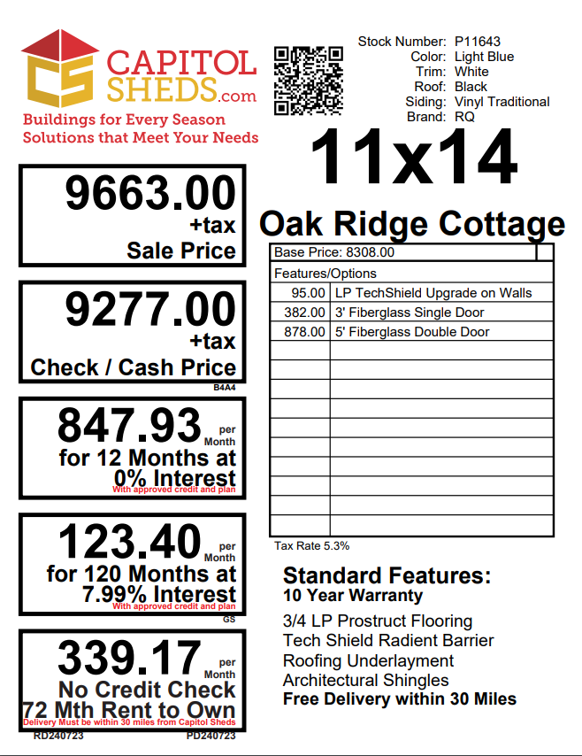 Introducing the Oak Ridge Cottage, a charming 11×14 retreat meticulously crafted by Amish artisans. Adorned in a soothing Light Blue with crisp White trim and a sleek Black roof, this Vinyl Traditional beauty exudes tranquility. Architectural Shingles, LP Tech Shield walls, and upgraded Fiberglass Doors enhance durability. With two windows inviting natural light, the 2×4 framing and LP Prostruct Flooring ensure reliability. The 3′ Fiberglass Single Door and 5′ Fiberglass Double Door provide easy access, completing this picturesque haven that combines style, functionality, and enduring quality for a truly inviting space.
