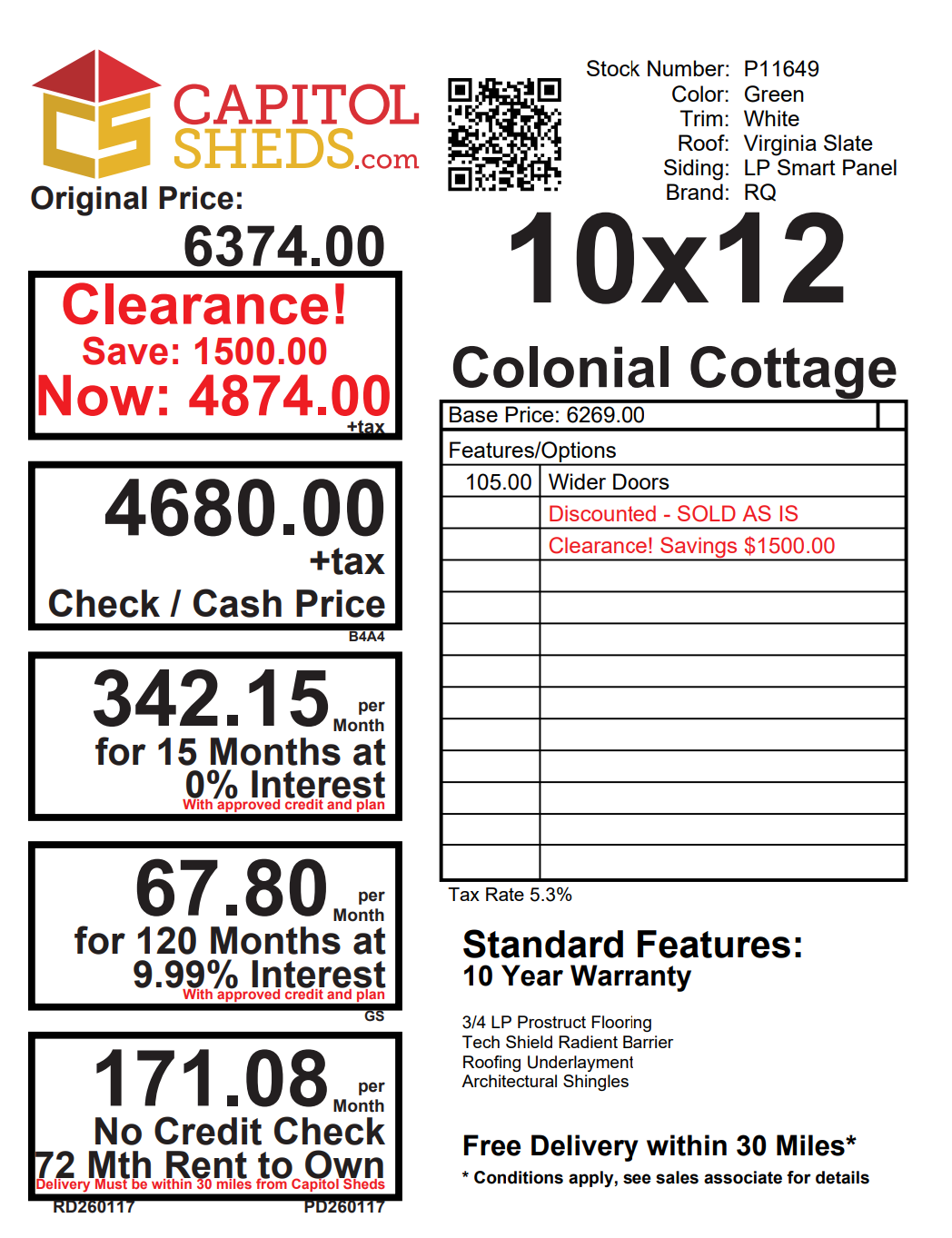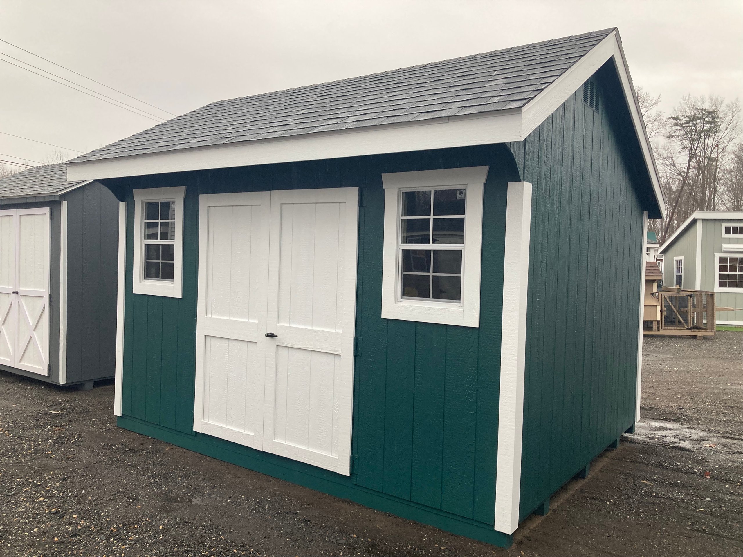 Introducing the Colonial Cottage 10×12 Storage Shed – a charming Amish creation. Adorned in soothing Green with crisp White trim, it’s a stylish storage solution. Crafted with durable LP Smart Panel siding and crowned with a Virginia Slate roof, featuring architectural shingles for lasting elegance. Embrace the outdoors through two windows, and enjoy easy access with a wider door. The 2×4 framing and LP Prostruct Flooring ensure durability, making it a timeless addition to your space. Redefine storage with this cottage-inspired masterpiece, where functionality meets aesthetics seamlessly.