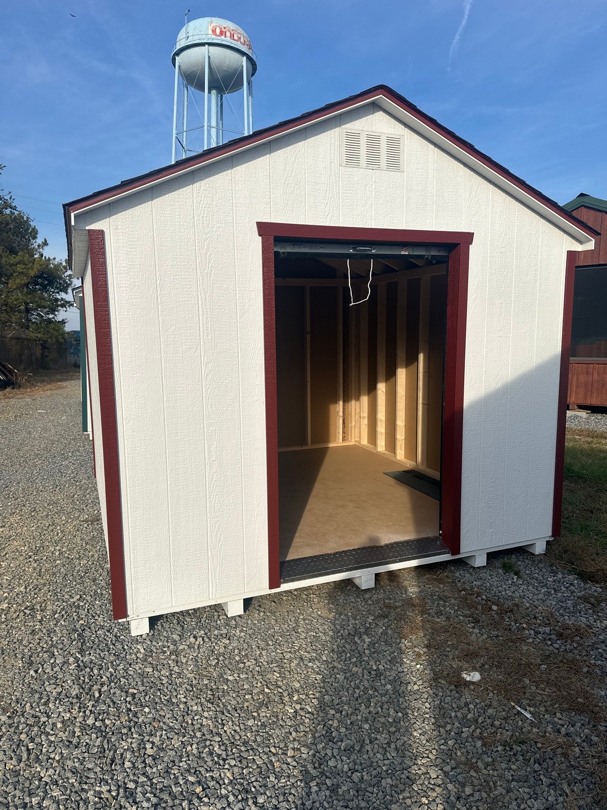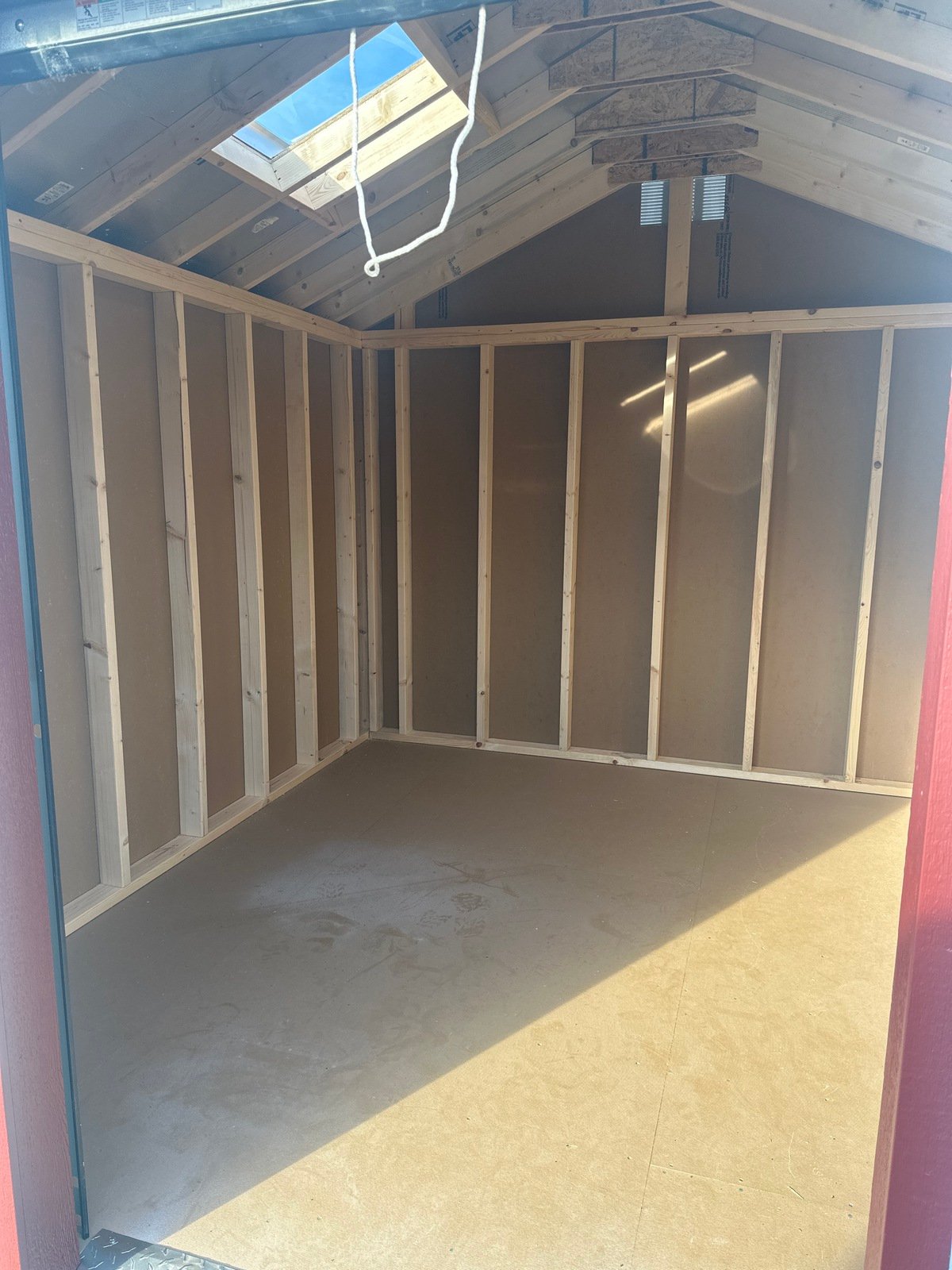 Style Name: A-Frame Size: 10×10 Siding: Smart Panel Main Color: white Trim: Red Roof Color: Charcoal Roof : Shingles Number of Windows:None Roll up Door Solar Sky Light Wall Framing: 2×4 Studs 16 inches on center Roof Framing: 2×4 rafters 16 inches on center Roof Sheeting: LP Tech Shield Flooring: LP Prostruct Flooring Floor Joists: Pressure Treated 2×4 Joists 16 inches on center