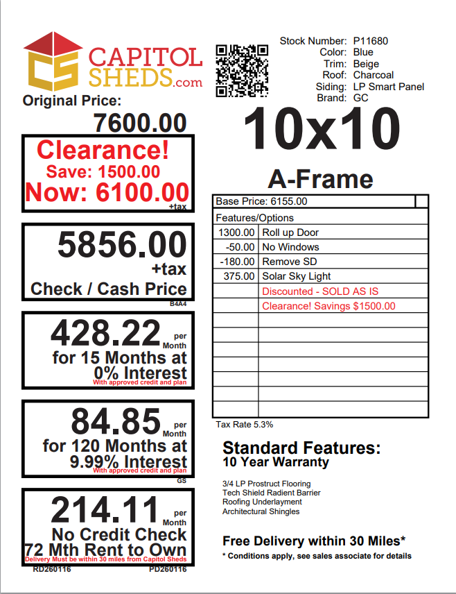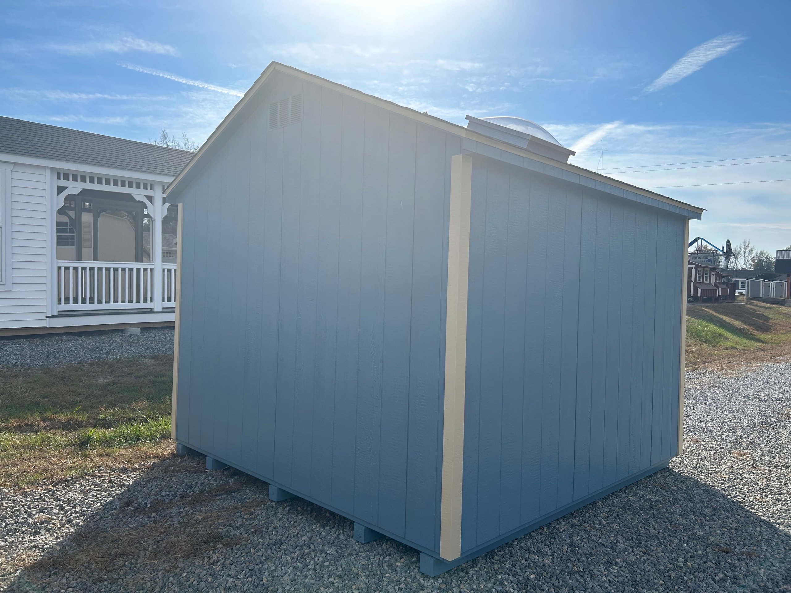 Unveil the epitome of storage elegance with our A-Frame 10×10 Shed, meticulously crafted by Amish artisans. Dressed in captivating Blue LP Smart Siding and adorned with Beige trim, this shed is a visual masterpiece. The Charcoal roof, crowned with Shingles and Roof Felt underlayment, ensures enduring protection. Revel in the ambiance of natural light through the skylight and access your belongings effortlessly with the Roll-up door. Engineered with precision using 2×4 studs, LP Tech Shield roofing, and Pressure Treated 2×4 Joists, this shed is a sanctuary of durability. Elevate your space further with the included Red Roll Up Door, a vibrant touch to timeless craftsmanship.