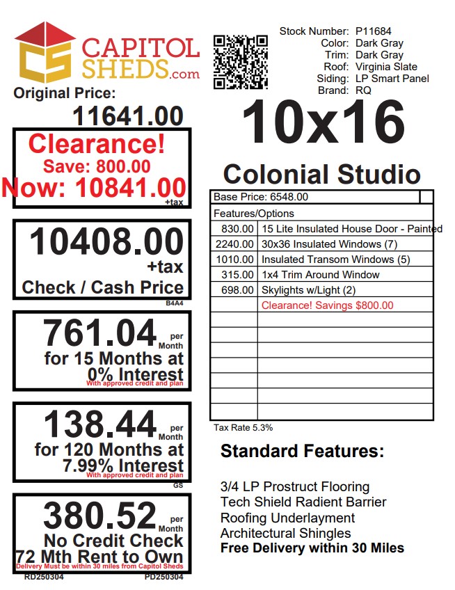 Reserve this building for a $500 deposit. Within 1 business day a rep will contact you to discuss delivery details. Don’t lose out on this beautiful building – Place your deposit today to hold it!