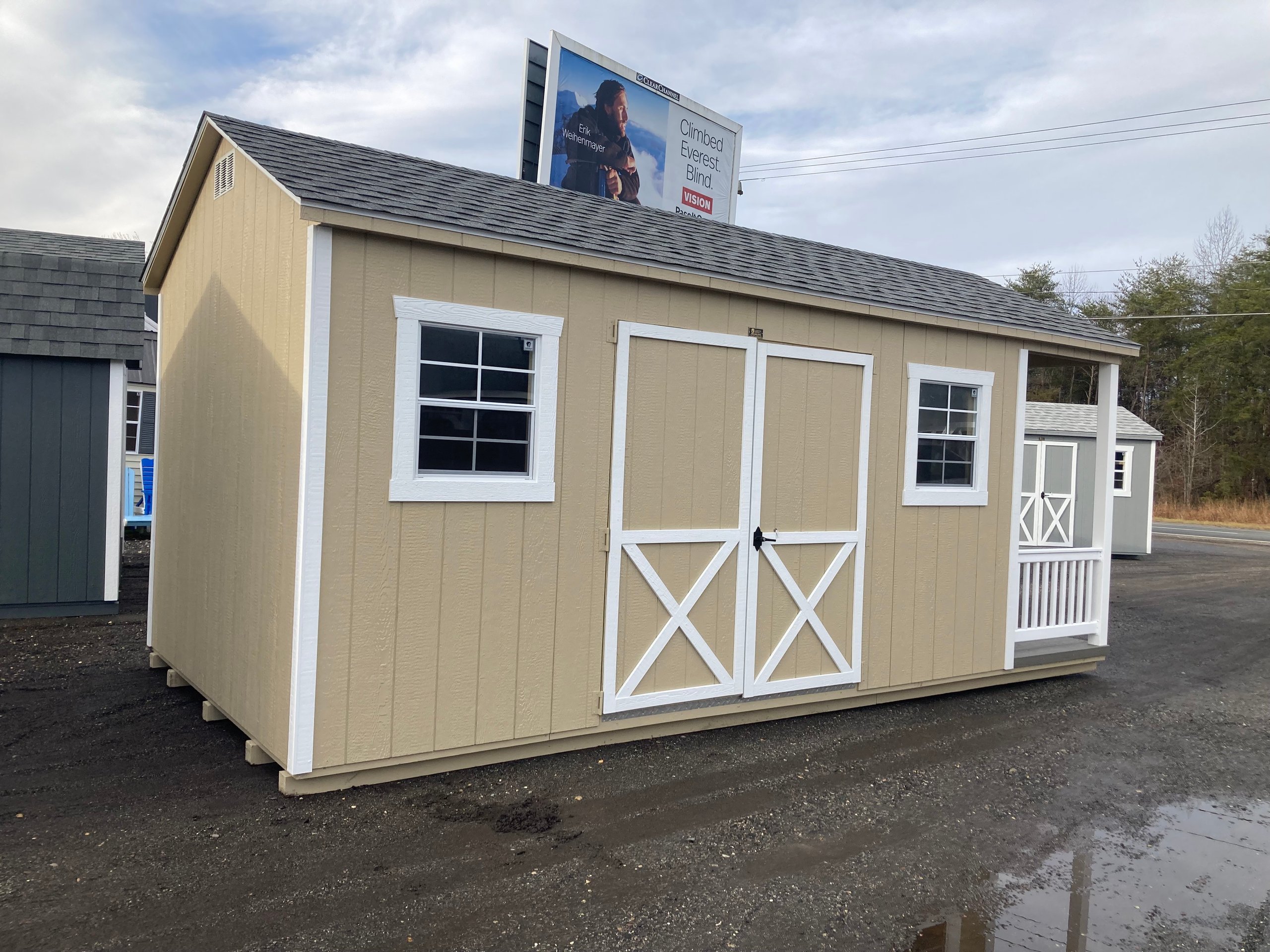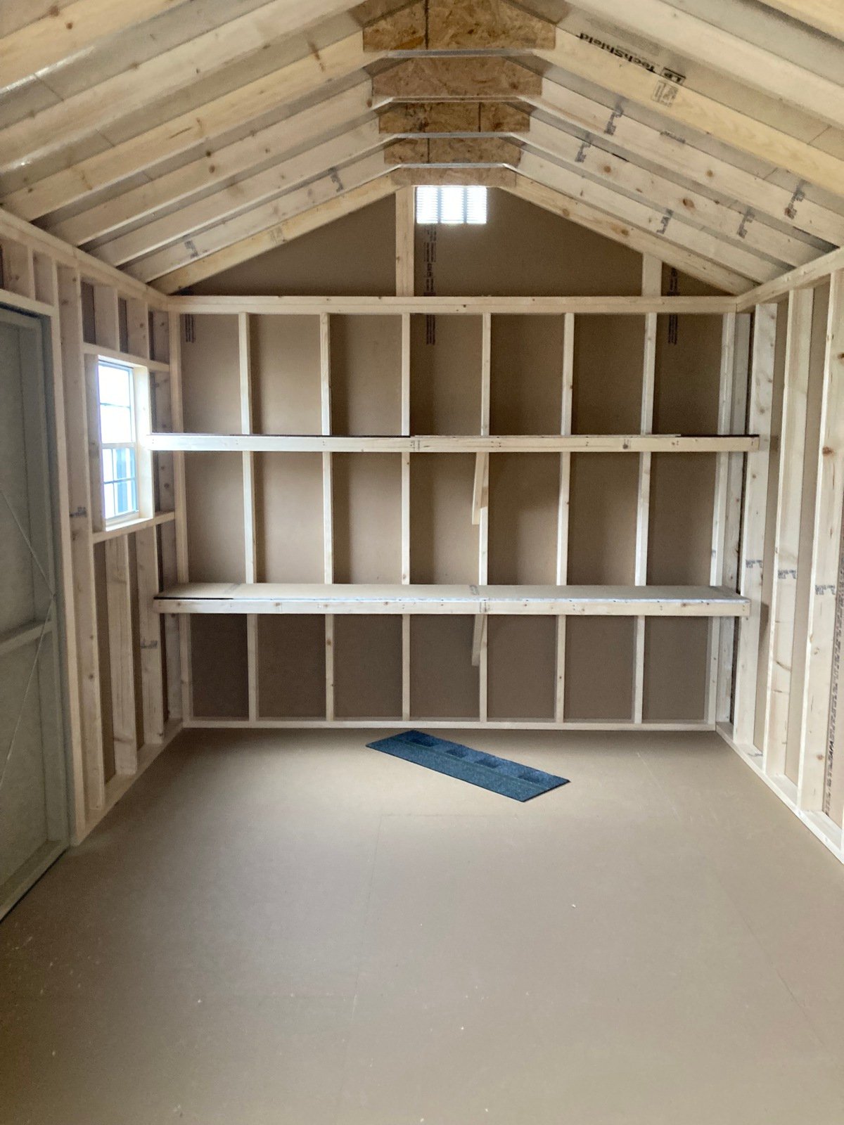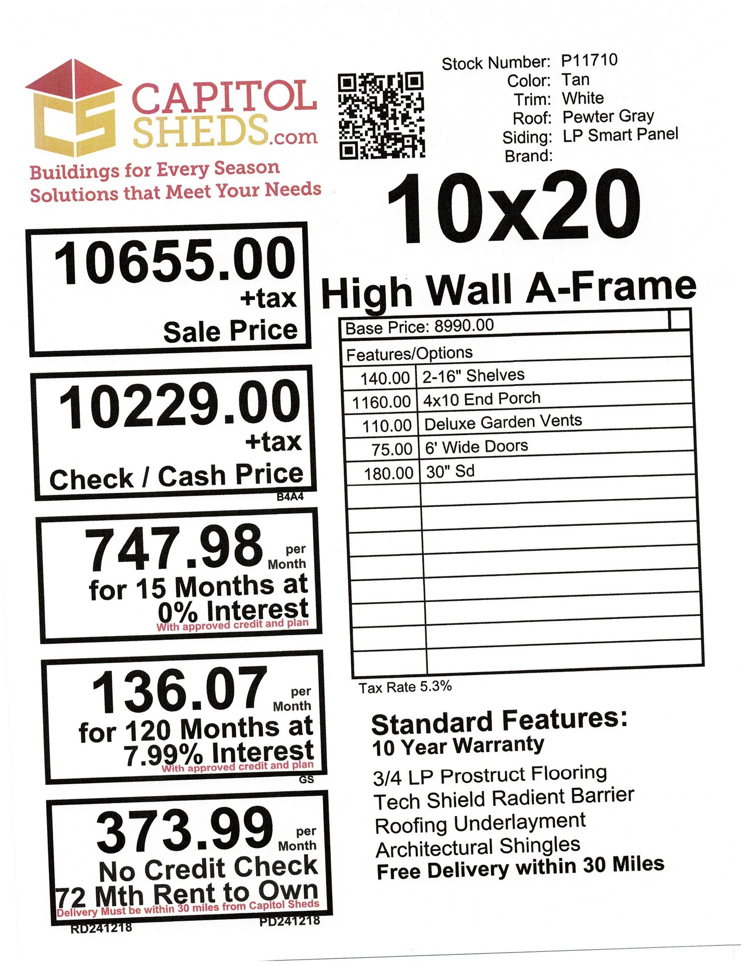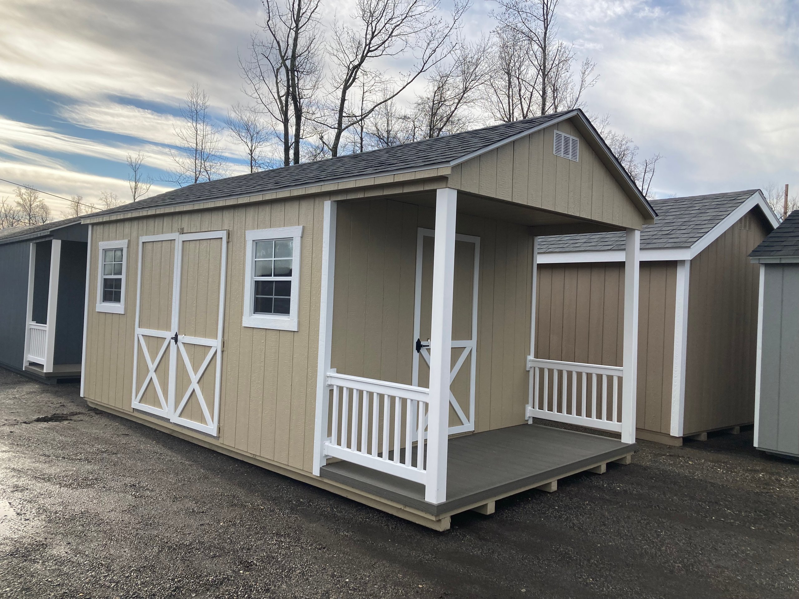 Introducing the Traditional A-Frame -A masterpiece of craftmanship by the Amish artisans. This 10×20 High Wall A-Frame is built to endure, offering exceptional quality and functionality for all your storage needs. The High Wall A-Frame siding provides superior durability while exuding timeless elegance in Tan , complemented by pristine White. The Pewter Gray colored dimensional shingles protect your belongings from the elements ensuring long-lasting reliability. With two doors for easy access, the interior boasts 2×4 stud wall framing, 2×4 rafter roof framing, and LP Tech Shield roof sheeting for added strength. The LP Prostruct Flooring, coupled with pressure-treated 2×4 floor joists ensures stability and longevity. invest in the High Wall A-Frame for a storage solution that’s built to last.