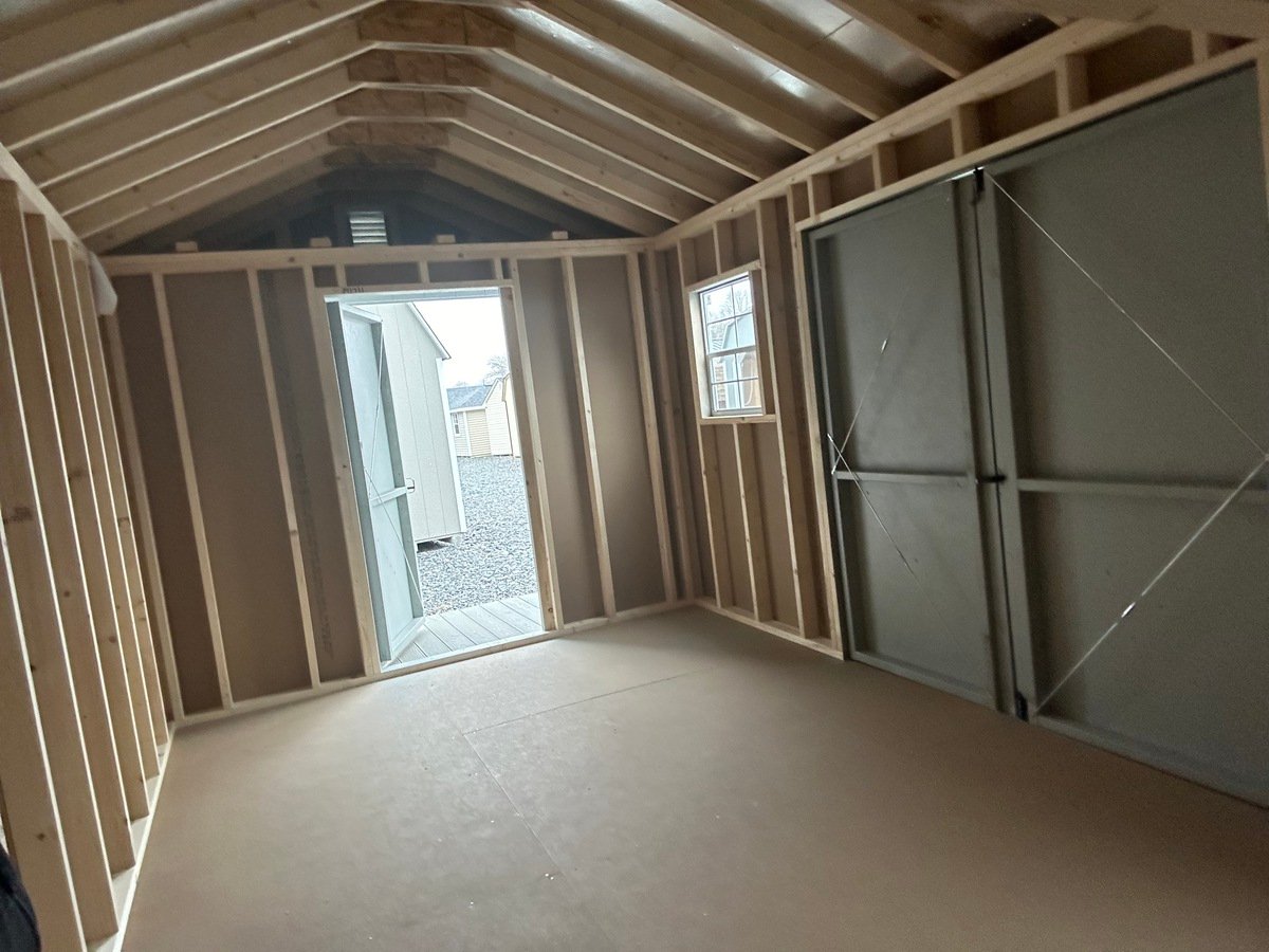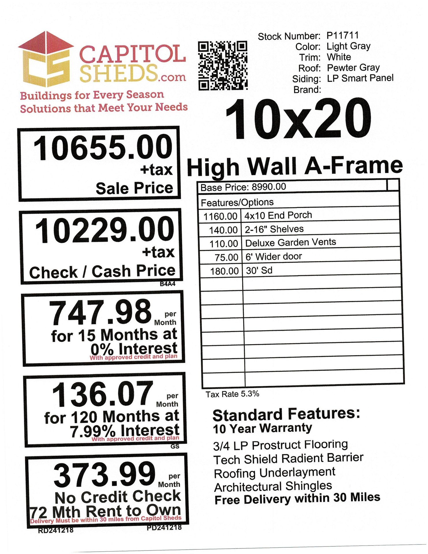 Introducing the Traditional A-Frame -A masterpiece of craftmanship by the Amish artisans. This 10×20 High Wall A-Frame is built to endure, offering exceptional quality and functionality for all your storage needs. The High Wall A-Frame siding provides superior durability while exuding timeless elegance in Lite Gray , complemented by pristine White. The Pewter Gray colored dimensional shingles protect your belongings from the elements ensuring long-lasting reliability. With two doors for easy access, the interior boasts 2×4 stud wall framing, 2×4 rafter roof framing, and LP Tech Shield roof sheeting for added strength. The LP Prostruct Flooring, coupled with pressure-treated 2×4 floor joists ensures stability and longevity. invest in the High Wall A-Frame for a storage solution that’s built to last.