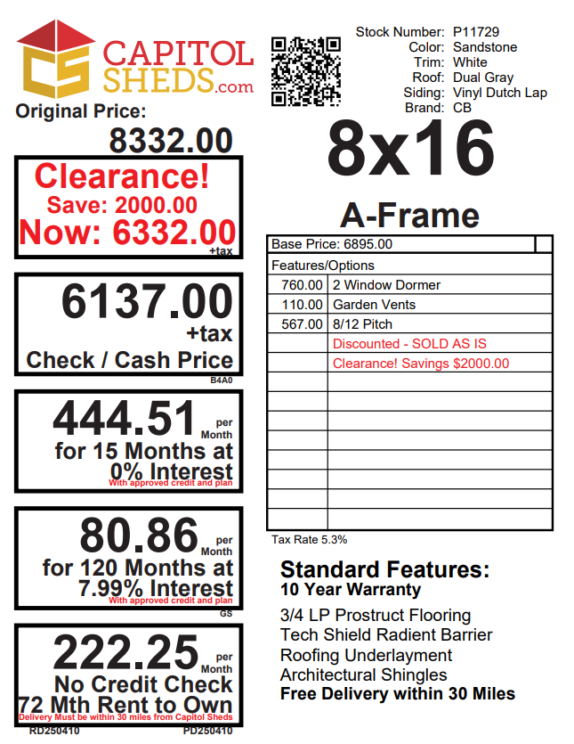 Introducing the Traditional A-Frame -A masterpiece of craftmanship by the Amish artisans. This 8×16 A-Frame is built to endure, offering exceptional quality and functionality for all your storage needs. The A-Frame siding provides superior durability while exuding timeless elegance in Sand Stone , complemented by pristine White. The Dual Gray colored dimensional shingles protect your belongings from the elements ensuring long-lasting reliability. With two doors for easy access, the interior boasts 2×4 stud wall framing, 2×4 rafter roof framing, and LP Tech Shield roof sheeting for added strength. The LP Prostruct Flooring, coupled with pressure-treated 2×4 floor joists ensures stability and longevity. invest in the A-Frame for a storage solution that’s built to last.