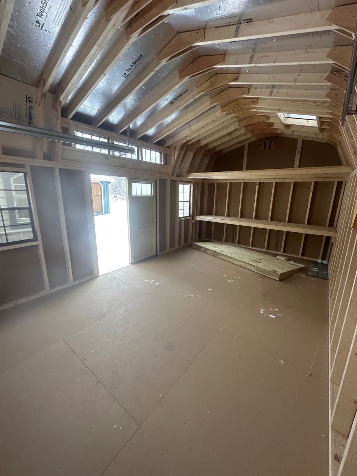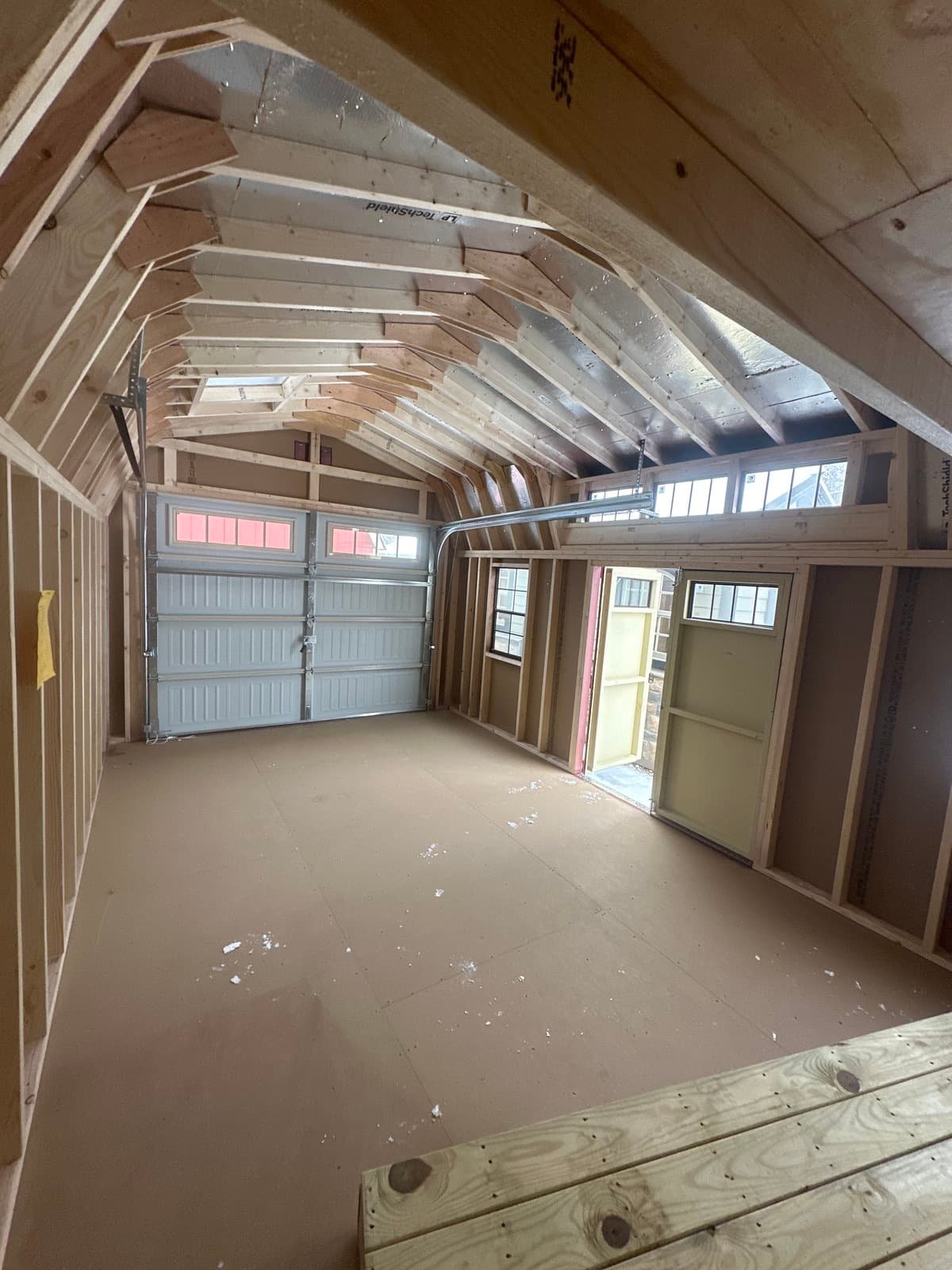 Introducing the Dutch Barn, a 12×20 Amish-built storage shed that seamlessly blends functionality with timeless charm. Crafted with precision, its LP Smart Panel siding in a striking red hue complements the beige trim, while the cedar-colored dimensional shingles exude warmth. The 2×4 studs and LP Tech Shield roof sheathing ensure durability, while the LP Prostruct Flooring and pressure-treated 2×4 joists provide a sturdy foundation. This shed boasts two windows, a garden double door with transoms, an 8′ transom dormer, and a stylish carriage-style garage door with glass. Additional features include a spacious loft, a 12′ workbench, and two skylights for natural illumination. Upgrade your storage with elegance.