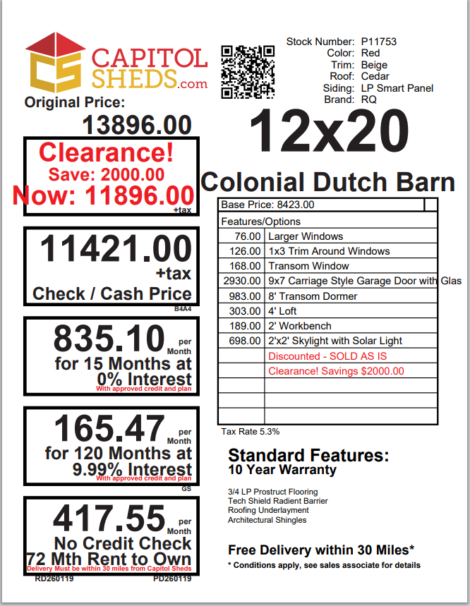 Reserve this building for a $500 deposit. Within 1 business day a rep will contact you to discuss delivery and discounts you may qualify for such as cash/check, military/1st responder, etc.