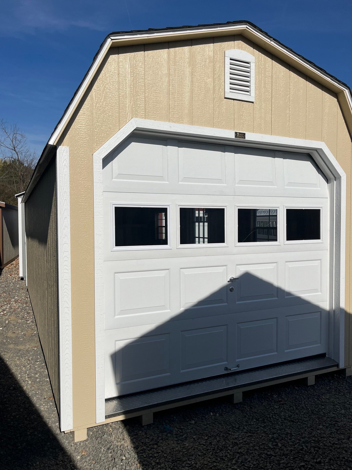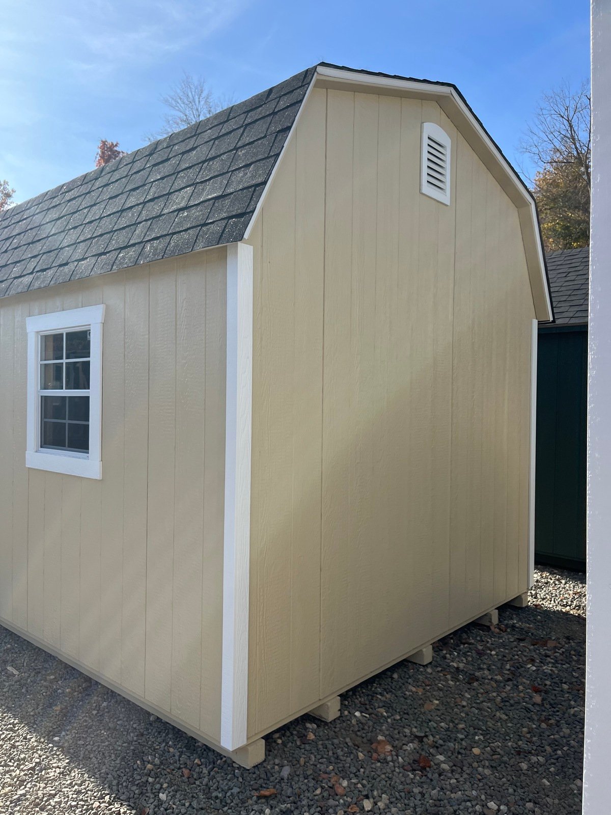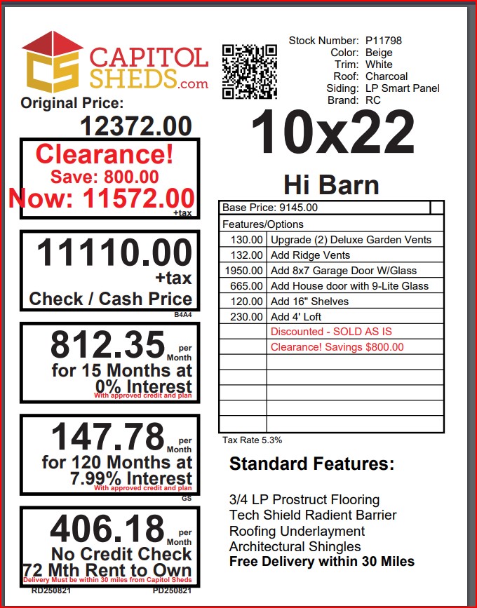 Style Name: Hi Barn Size: 10×22 Siding: LP Smart Panel Main Color: Beige Trim Color: White Roof Color: Charcoal Roofing: Architectural Shingles Roofing Underlayment: Roof Felt Paper Number of Windows: 2 Number of Doors: 3 Wall Framing: 2×4 studs 16 inches on center Roof Framing: 2×4 rafters 16 inches on center Roof Sheeting: LP Tech Shield Flooring: LP T&G Prostruct Flooring Floor Joists: Pressure Treated 2×4 joists 16 inches on center   Included Upgrades: Garden Vents Ridge Vent 6” higher walls 8×7 Garage door House door with 9-Lite Glass 16” Shelves 4’ Loft  8” Floor Joist Upgrade