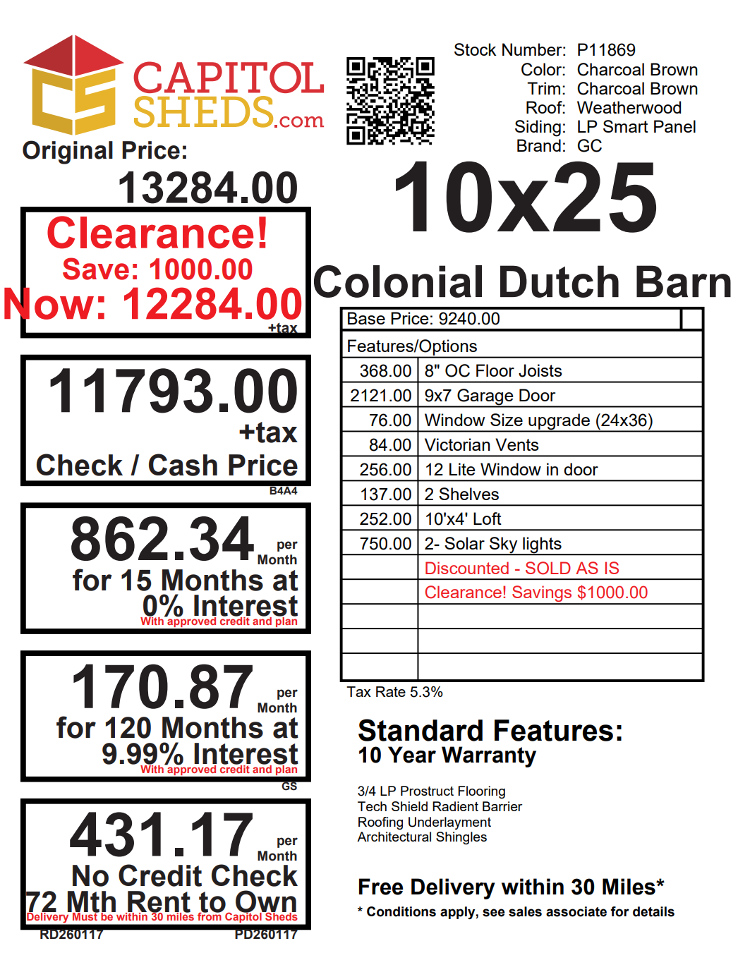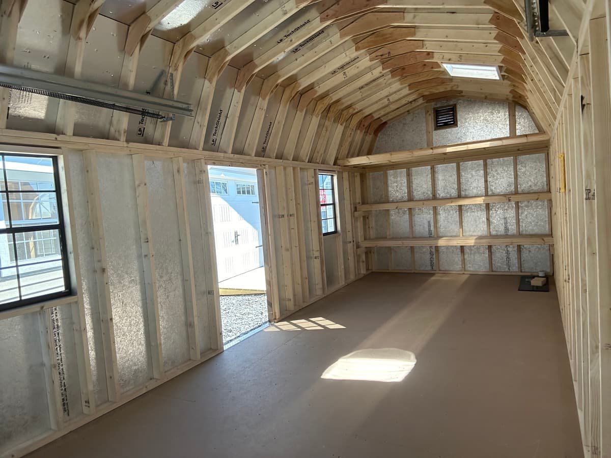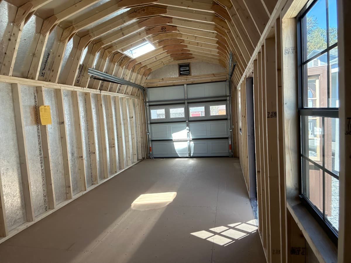 Introducing our Colonial Dutch Barn Garage, a masterfully crafted Amish-built storage solution that combines timeless charm with unbeatable functionality. With its spacious 10×25 footprint, Smart Panel siding in elegant Charcoal Brown, and Weatherwood shingles, this shed blends seamlessly into any landscape. Boasting two 24×36 wood sash windows and a pair of 9×7 garage doors, natural light floods the interior, complemented by elegant vents and two solar skylights. Inside, discover versatile storage options, including a 16″ shelf and a 4′ loft. Constructed with precision using 2×4 studs and rafters, and featuring LP Prostruct flooring, this shed is built to last.