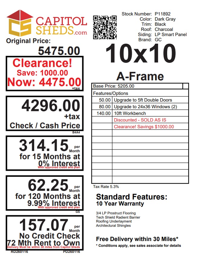 Step into spacious functionality with our 10×10 A-Frame Shed. Its Dark Gray hue, complemented by Black trim, exudes contemporary elegance. Crafted with LP Smartpanel siding and fortified by LP Tech Shield, it ensures durability. The Charcoal roof, dressed in shingles and Roof Felt underlayment, promises enduring protection. Within, discover upgraded features: a wider door for easy access, larger windows inviting ample light, and a 10′ workbench for versatile functionality. Elevate your outdoor storage experience with this stylish, practical solution, marrying form and function seamlessly in your backyard landscape.