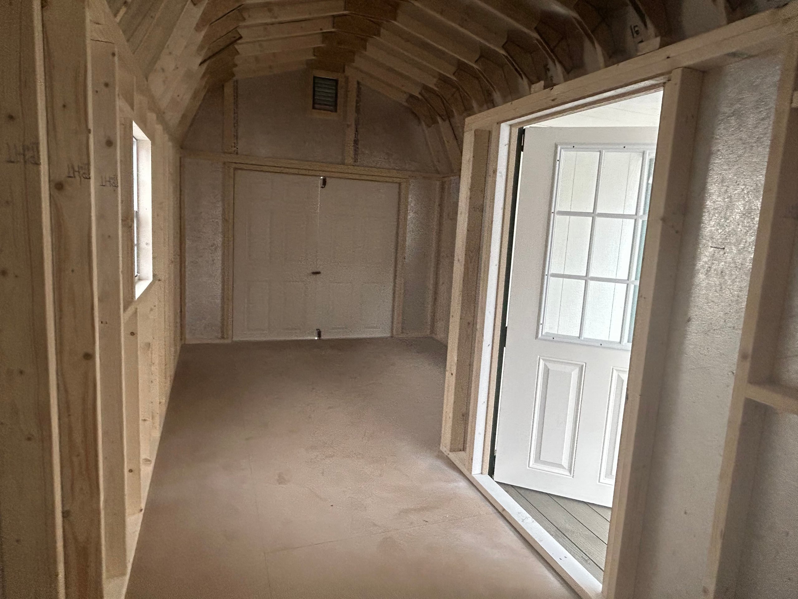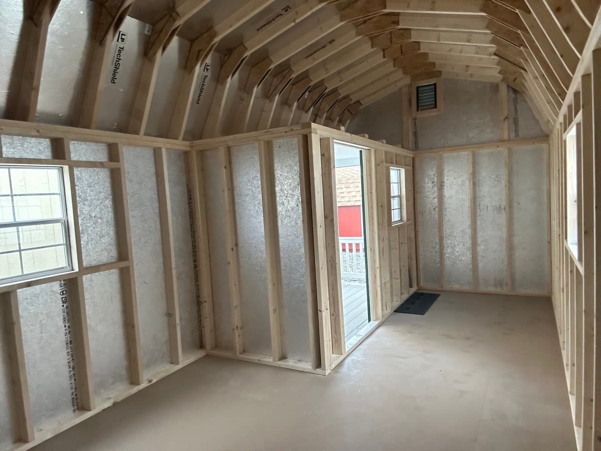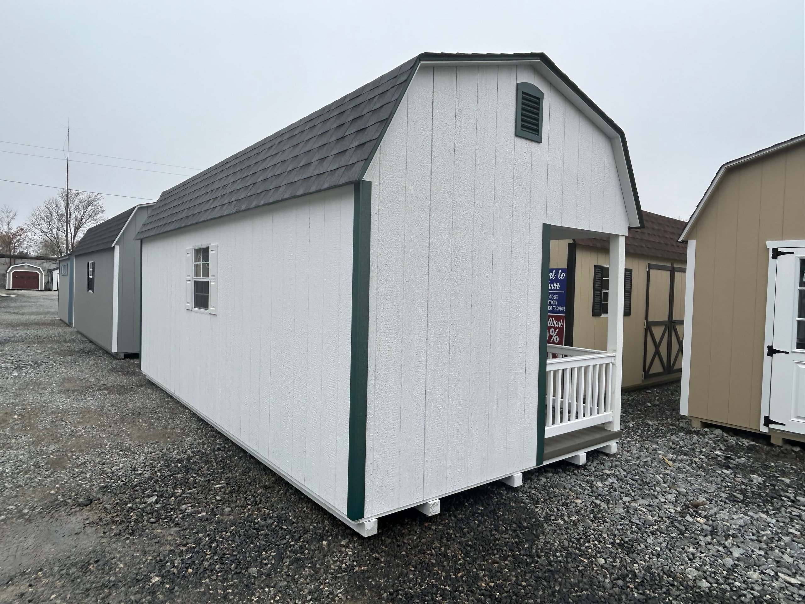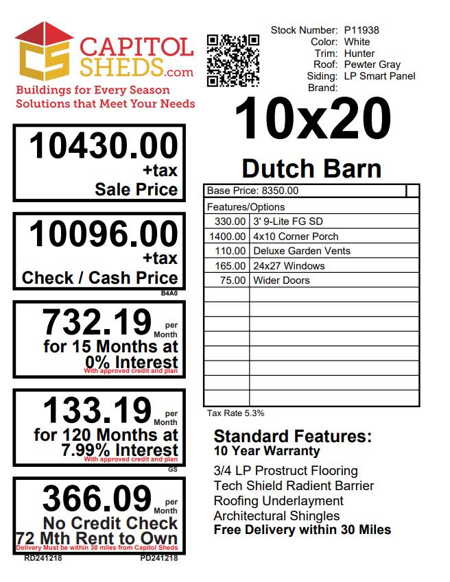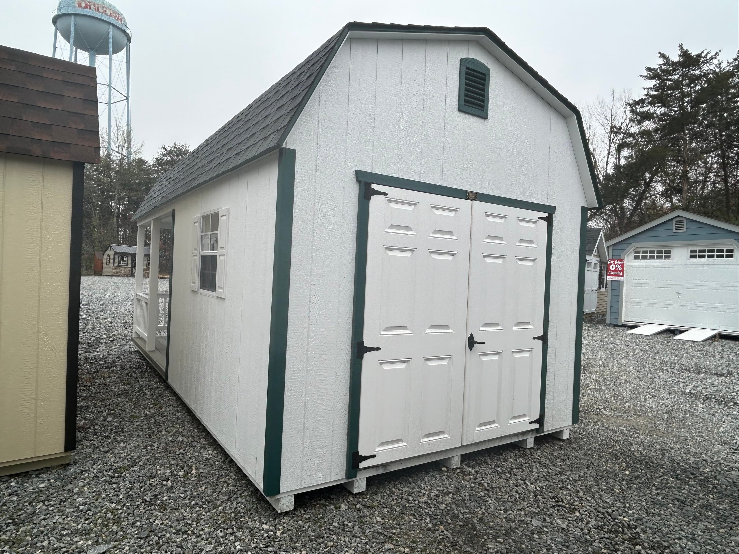 Introducing the Traditional Dutch Barn -A masterpiece of craftmanship by the Amish artisans. This 10×20 Dutch Barn is built to endure, offering exceptional quality and functionality for all your storage needs. The Dutch Barn siding provides superior durability while exuding timeless elegance in White , complemented by pristine Hunter Green. The Pewter colored dimensional shingles protect your belongings from the elements ensuring long-lasting reliability. With 3 doors for easy access, the interior boasts 2×4 stud wall framing, 2×4 rafter roof framing, and LP Tech Shield roof sheeting for added strength. The LP Pro struct Flooring, coupled with pressure-treated 2×4 floor joists ensures stability and longevity. invest in the Dutch Barn for a storage solution that’s built to last.