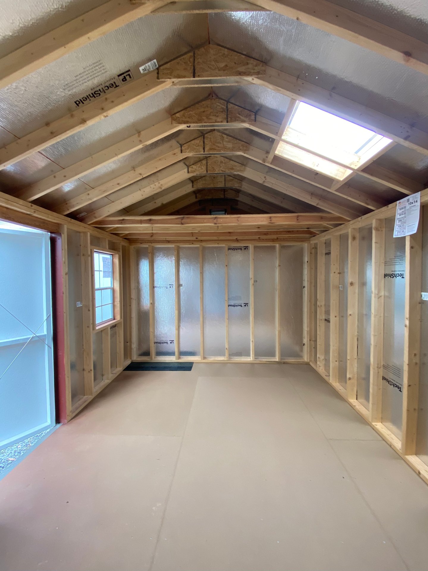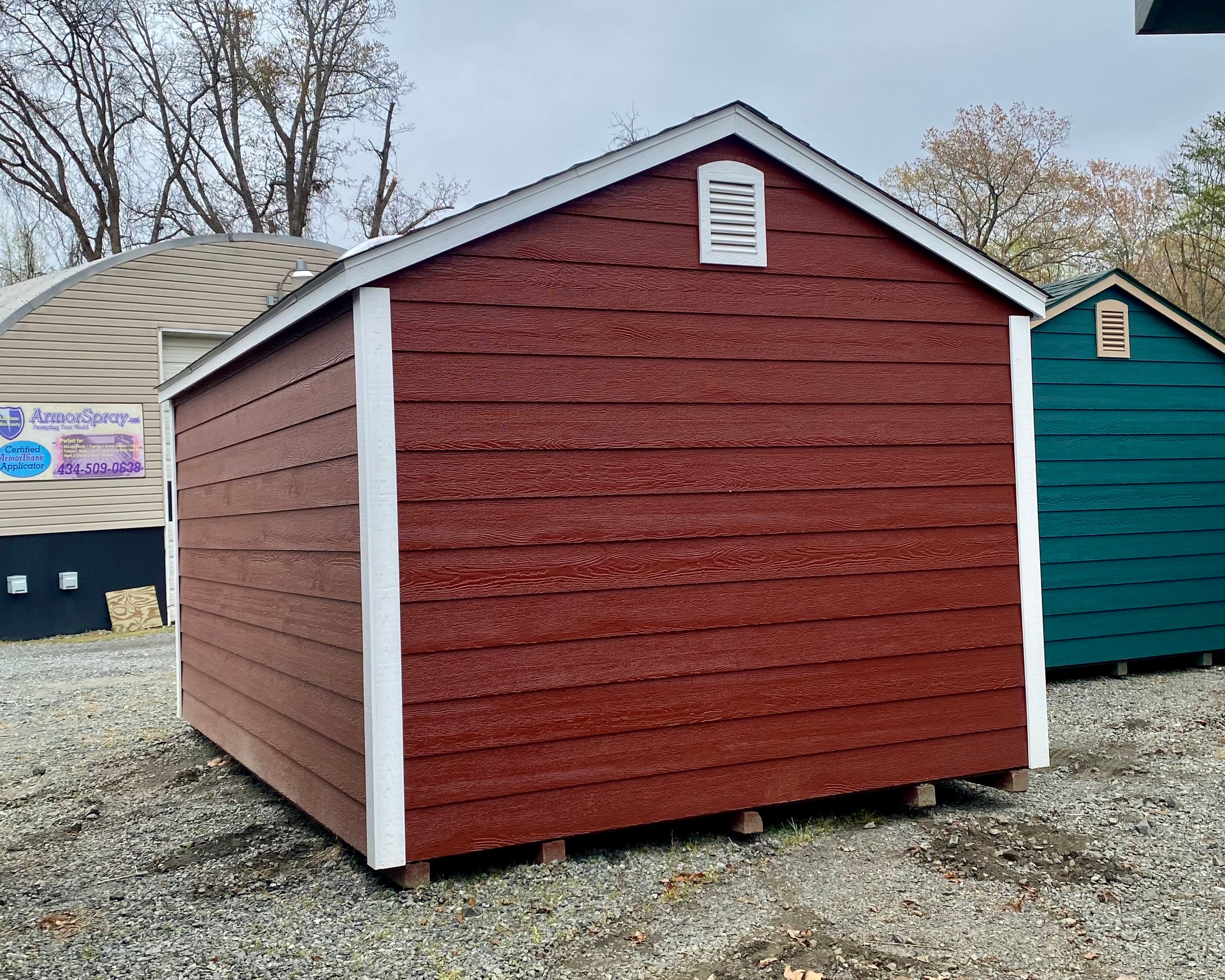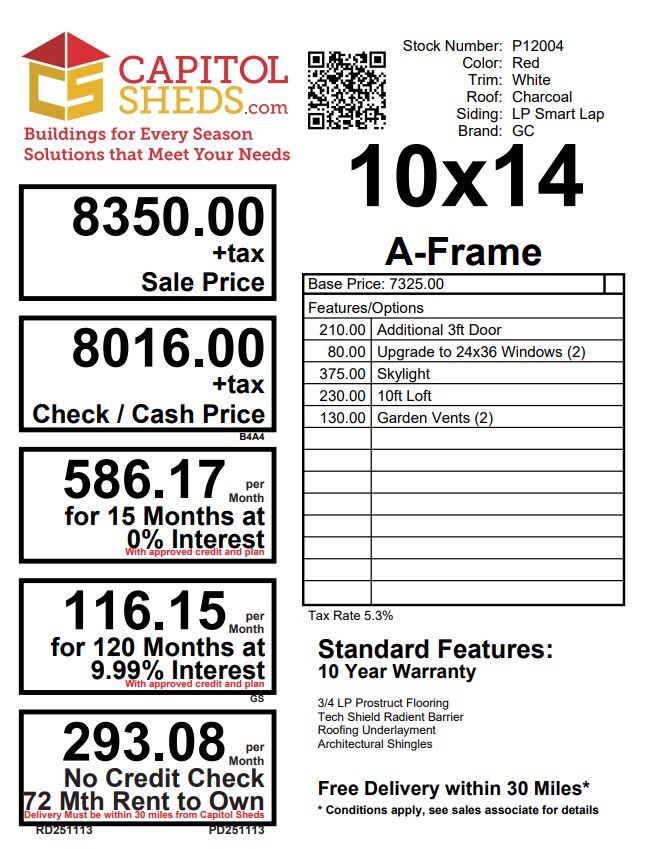 Style Name: A-Frame Size: 10×14 Siding: LP Smart Lap Main Color: Red Trim Color: White Roof Color: Charcoal Roofing: Shingles Roofing Underlayment: Roof Felt Wall Framing: 2×4 studs 16 inches on center Roof Framing: 2×4 rafters 16 inches on center Roof Sheeting: LP Tech Shield Upgraded Features: -Extra Single Door -Bigger Windows -Skylight -Loft -Garden Vents