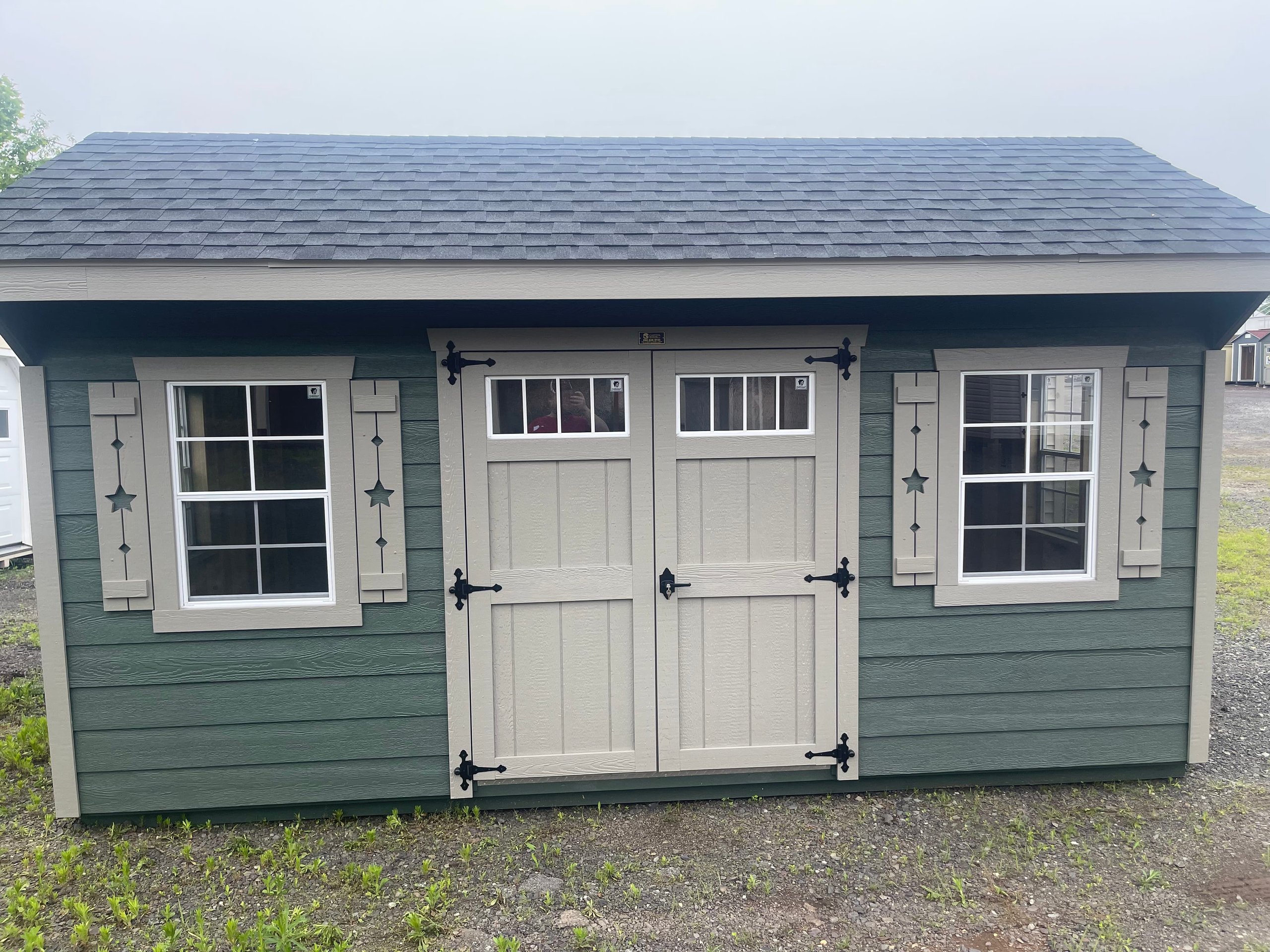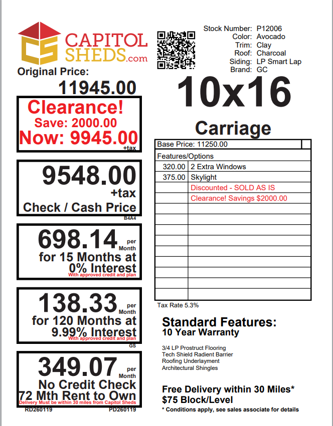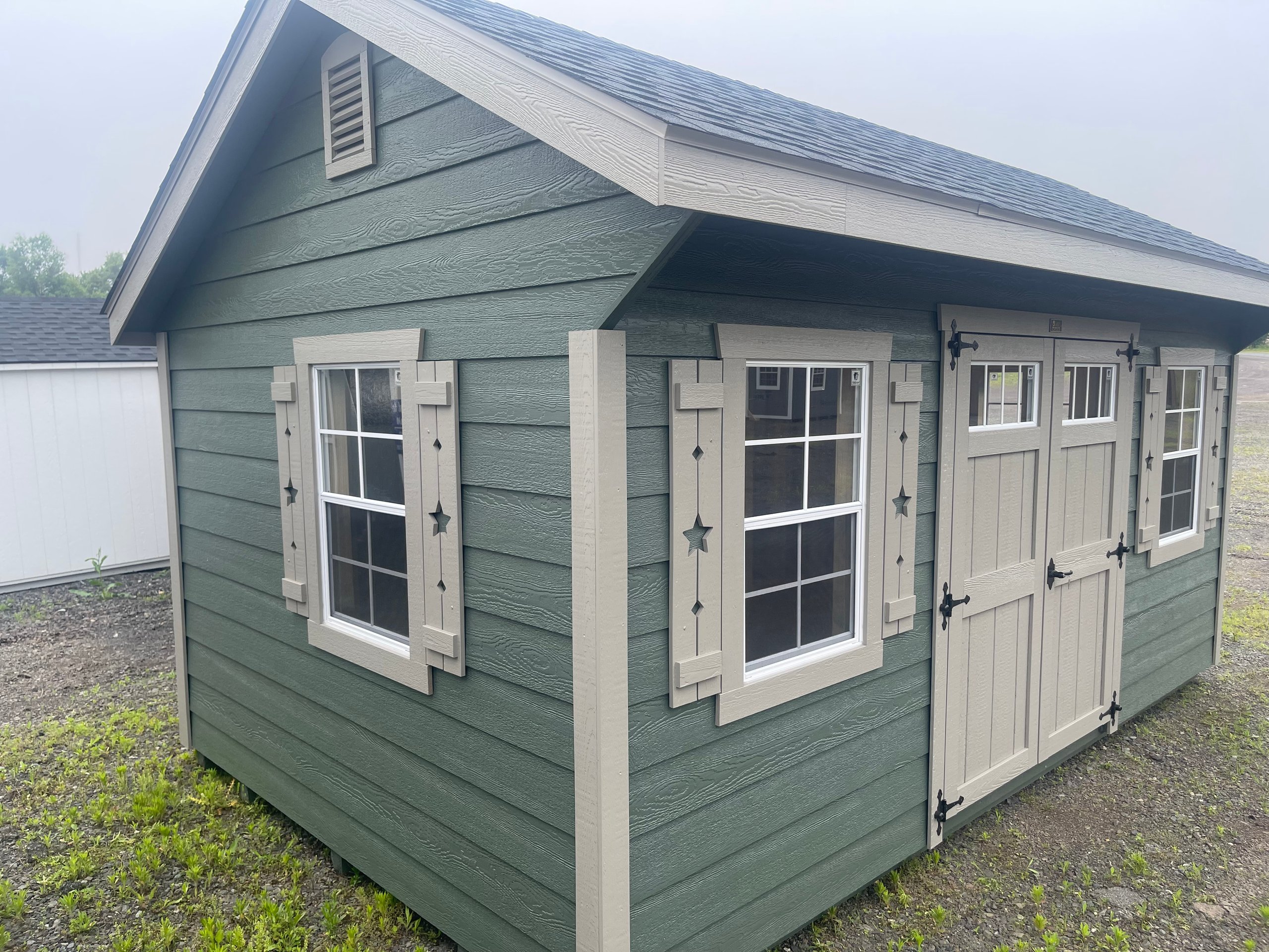 The 10×16 Carriage shed is a practical and stylish storage solution, featuring LP Smart Lap siding in an appealing Avocado color with Clay trim. Its Charcoal-colored shingle roof, complete with Roof Felt underlayment, ensures durability and weather resistance. The shed’s structure is robustly built with 2×4 wall studs and 2×4 roof rafters, both spaced 16 inches on center. The roof sheeting is enhanced with LP Tech Shield for added protection. Upgraded features include two extra windows for increased ventilation and a skylight that allows natural light to brighten the interior. This combination of functionality and aesthetics makes it an ideal choice for various storage needs.