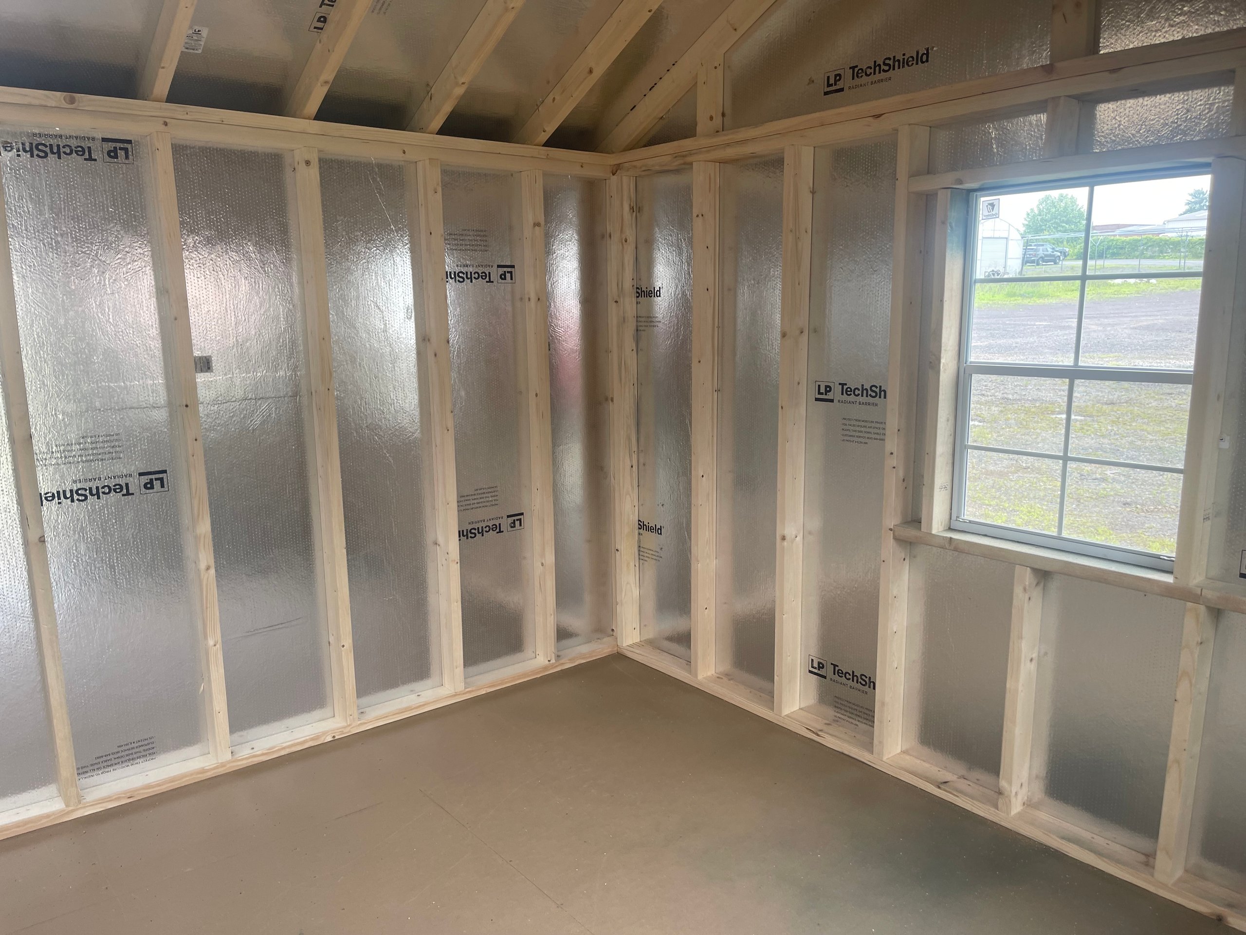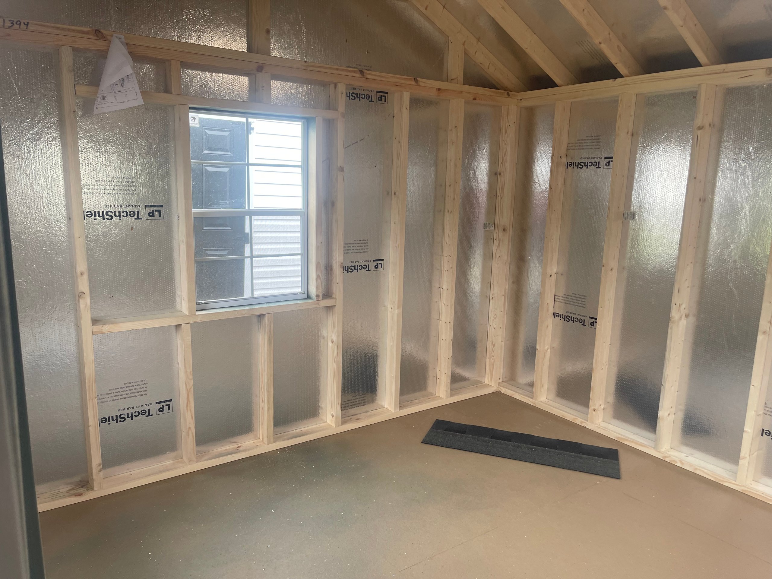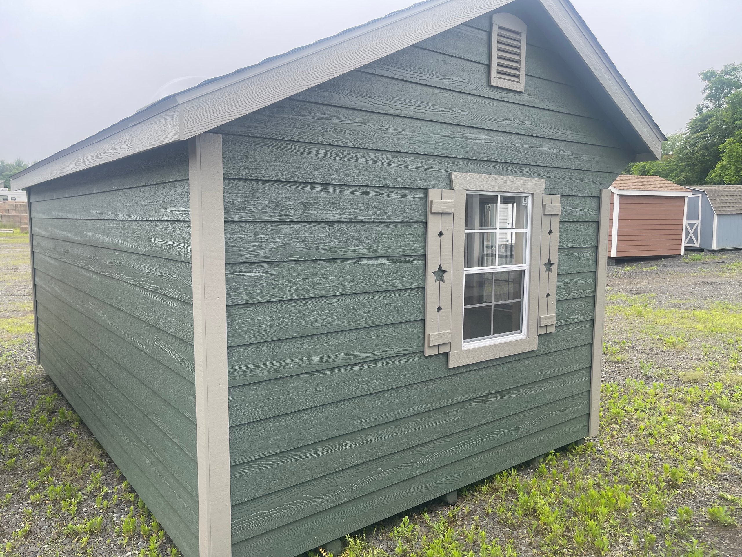 The 10×16 Carriage shed is a practical and stylish storage solution, featuring LP Smart Lap siding in an appealing Avocado color with Clay trim. Its Charcoal-colored shingle roof, complete with Roof Felt underlayment, ensures durability and weather resistance. The shed’s structure is robustly built with 2×4 wall studs and 2×4 roof rafters, both spaced 16 inches on center. The roof sheeting is enhanced with LP Tech Shield for added protection. Upgraded features include two extra windows for increased ventilation and a skylight that allows natural light to brighten the interior. This combination of functionality and aesthetics makes it an ideal choice for various storage needs.