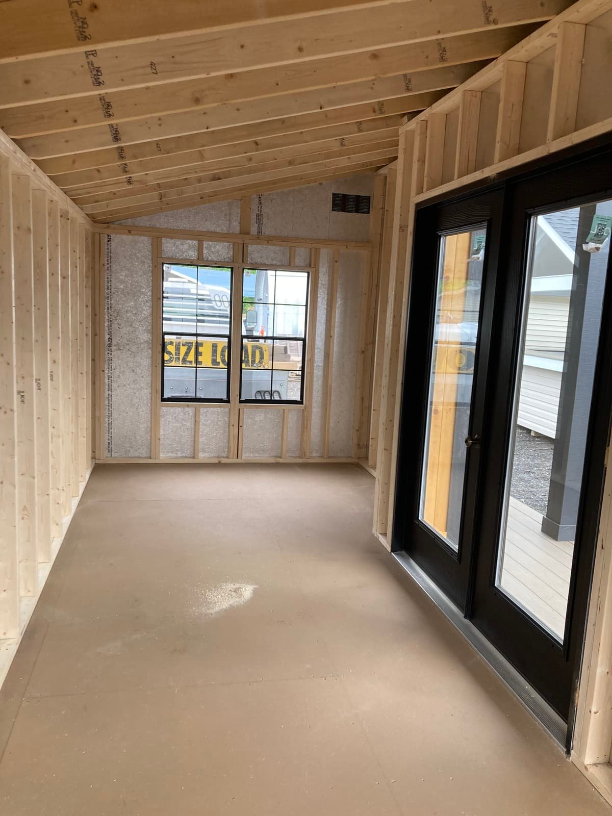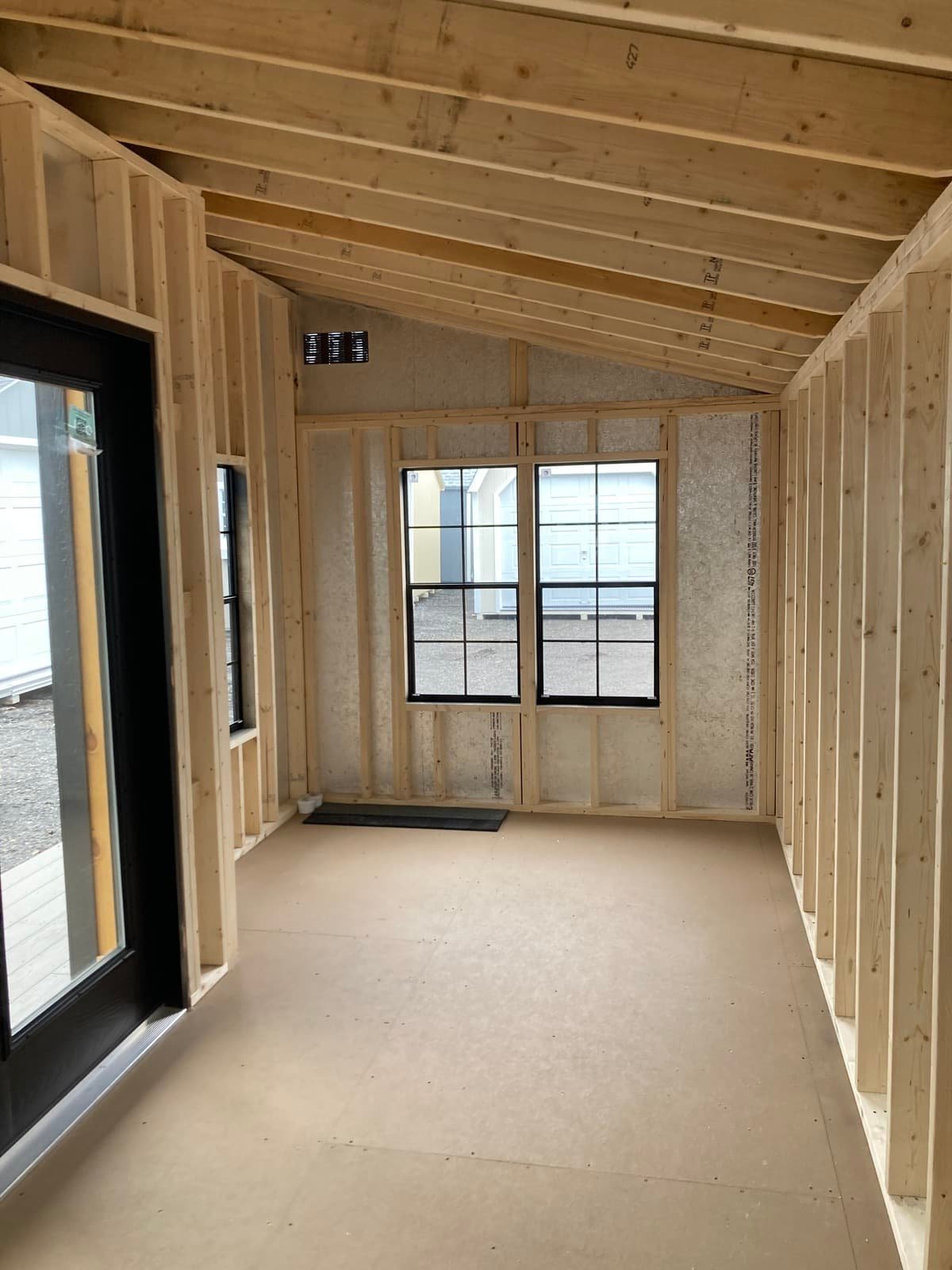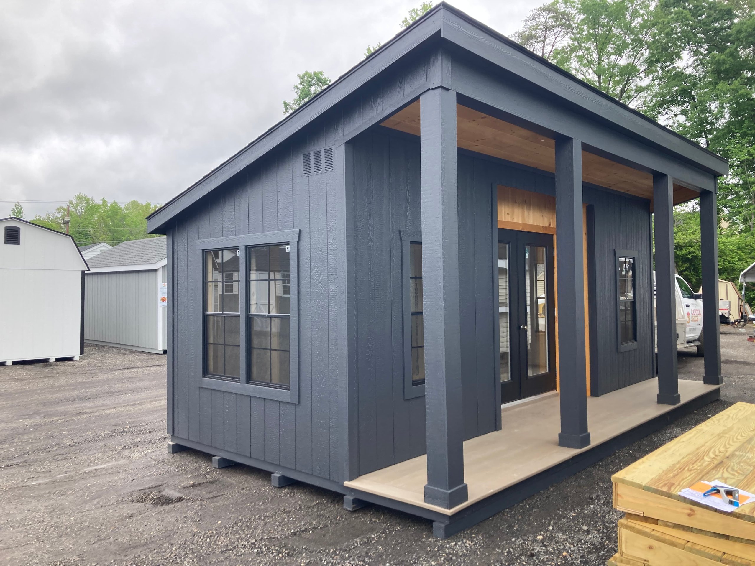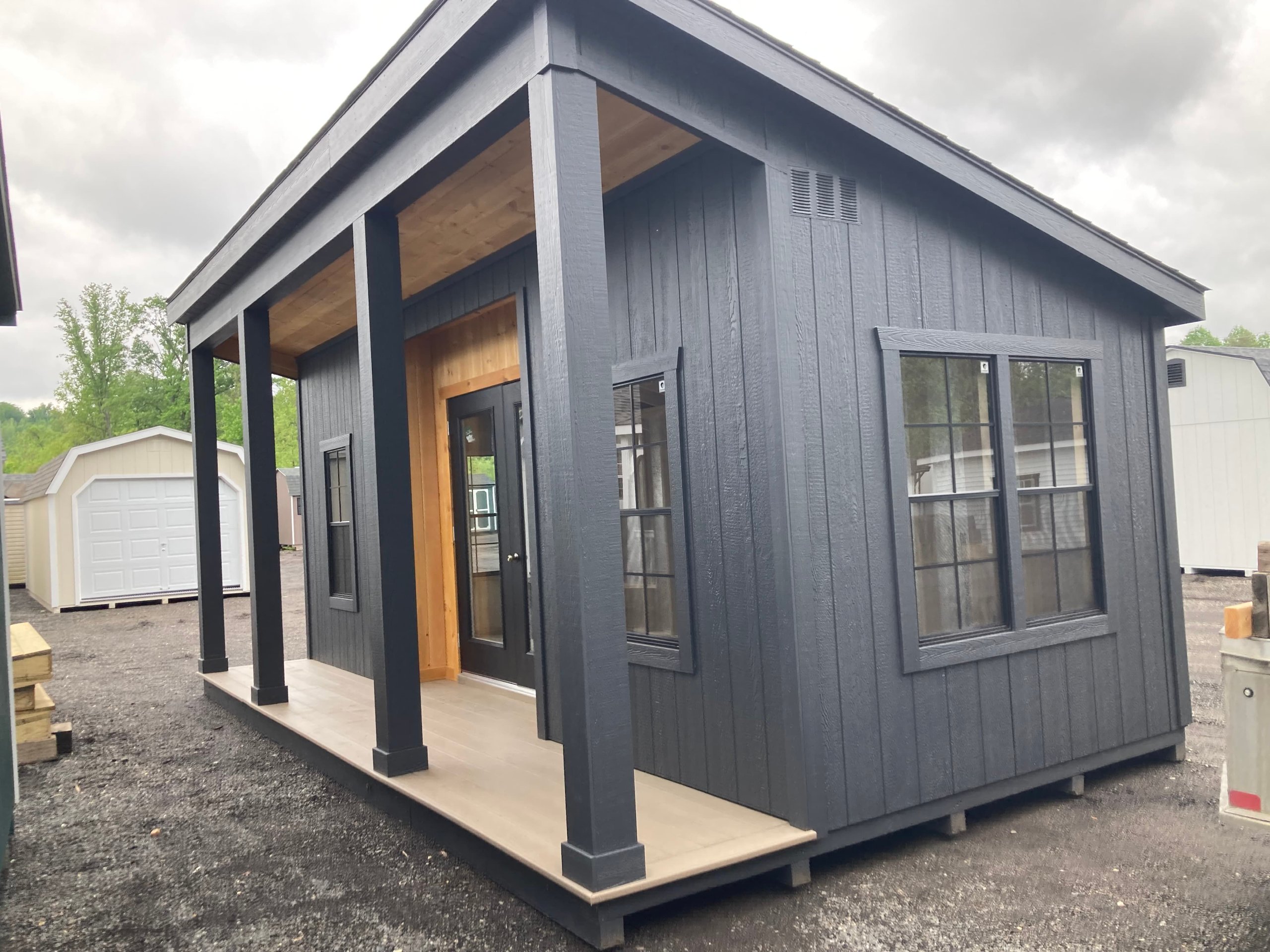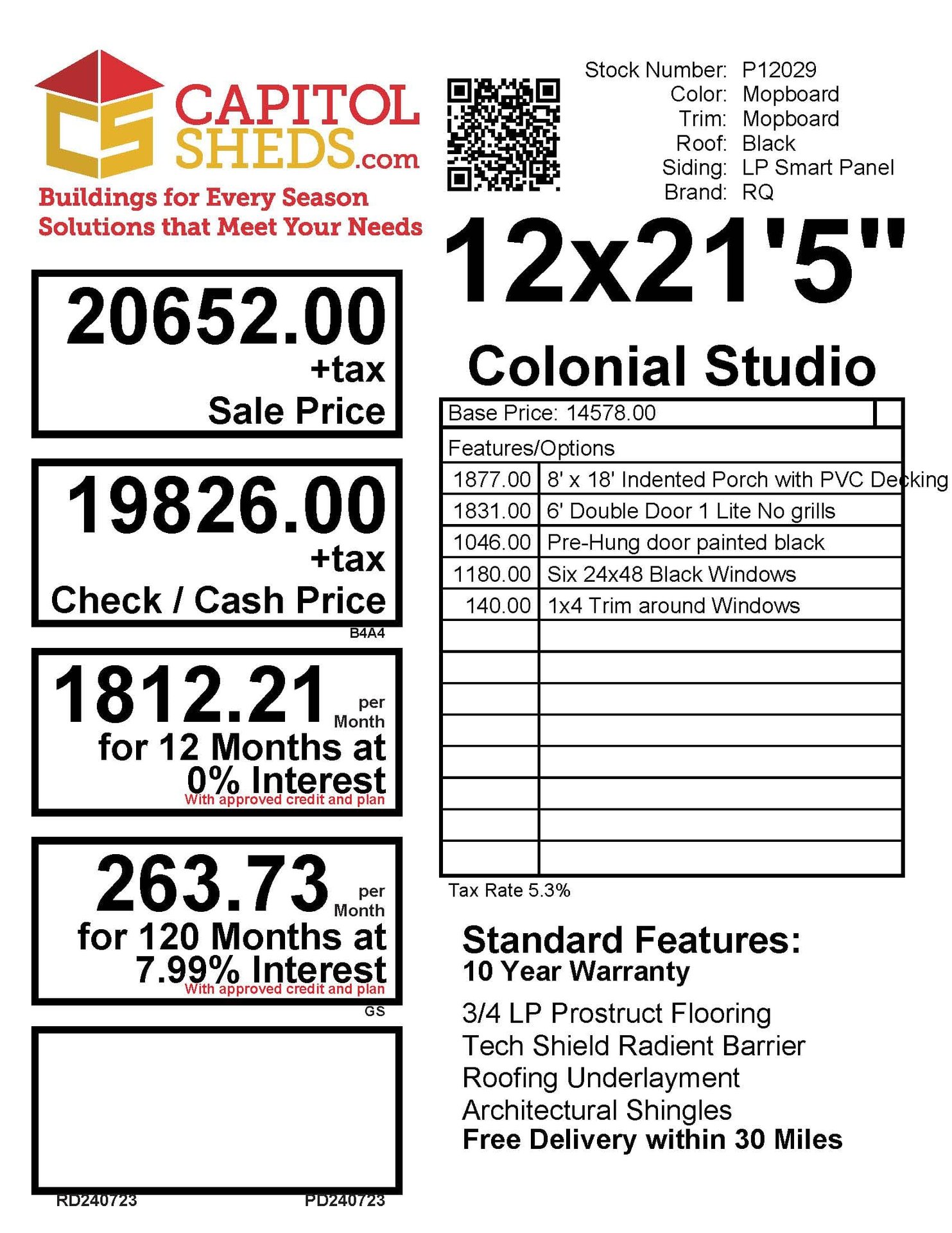Introducing the Colonial Studio with Porch, a spacious 12×21’5″ storage shed handcrafted by Amish artisans. Built with durable LP Smart Panel siding in Silverback, accentuated by Mopboard trim, and crowned with a sleek Black dimensional shingle roof. Revel in ample natural light through six 24×48 Black windows, complemented by 1×4 trim. Features an 8’x18′ Indented Front Porch with PVC Decking, inviting you to relax. Access is seamless with 6′ Black Fiberglass House Double Doors featuring 1 Lite Glass. Constructed with precision using 2×4 studs and rafters, and LP Prostruct Flooring with Pressure Treated joists. Elevate your outdoor space with this premium storage solution.