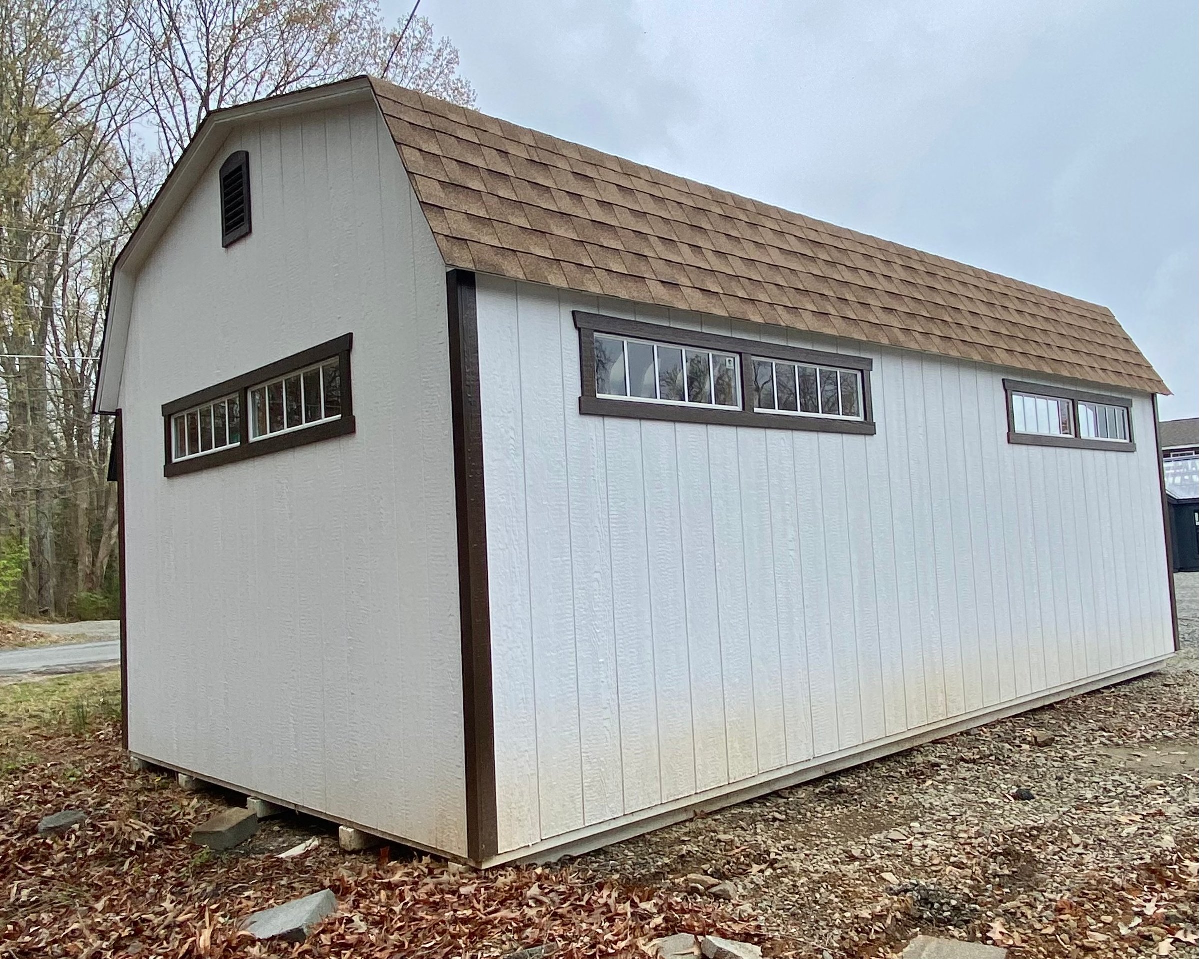 This 12×21’8″ Dutch Barn offers classic barn style with modern durability and smart upgrades. Finished in white LP Smart Panel siding with mushroom trim, it features a Shakewood architectural shingle roof and LP Tech Shield roof sheeting for added protection. Built with 2×4 wall and roof framing on 16-inch centers and heavy-duty pressure-treated floor joists spaced 8 inches on center, it’s designed for strength and longevity. Upgrades include a 9×7 overhead door, transom double doors with transom windows, garden vents, LuxGuard flooring, a 12-foot workbench, and a 12-foot loft—ideal for storage, projects, or equipment.