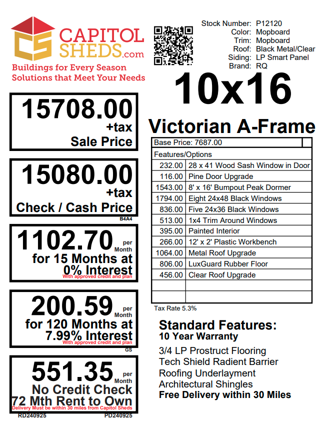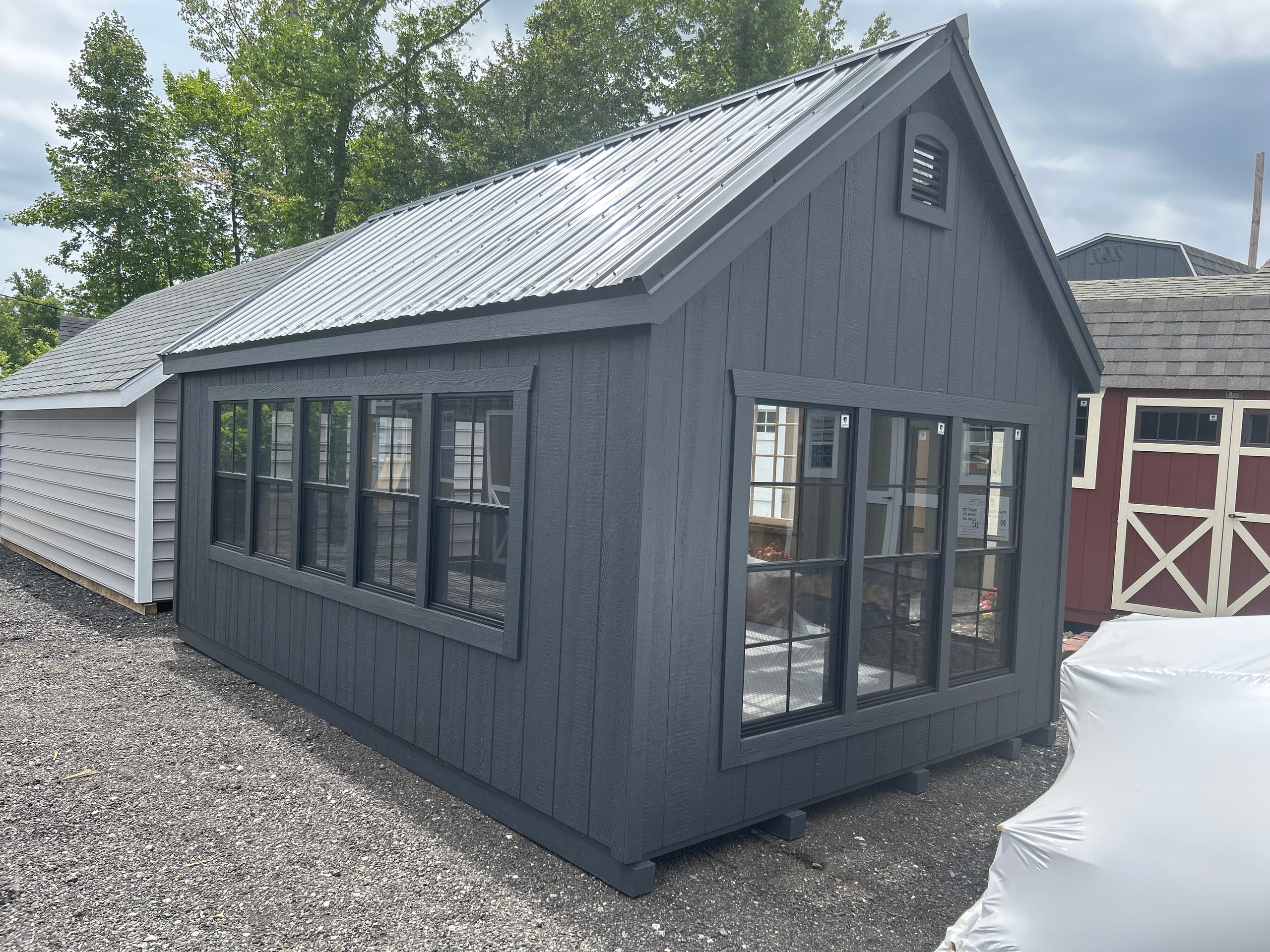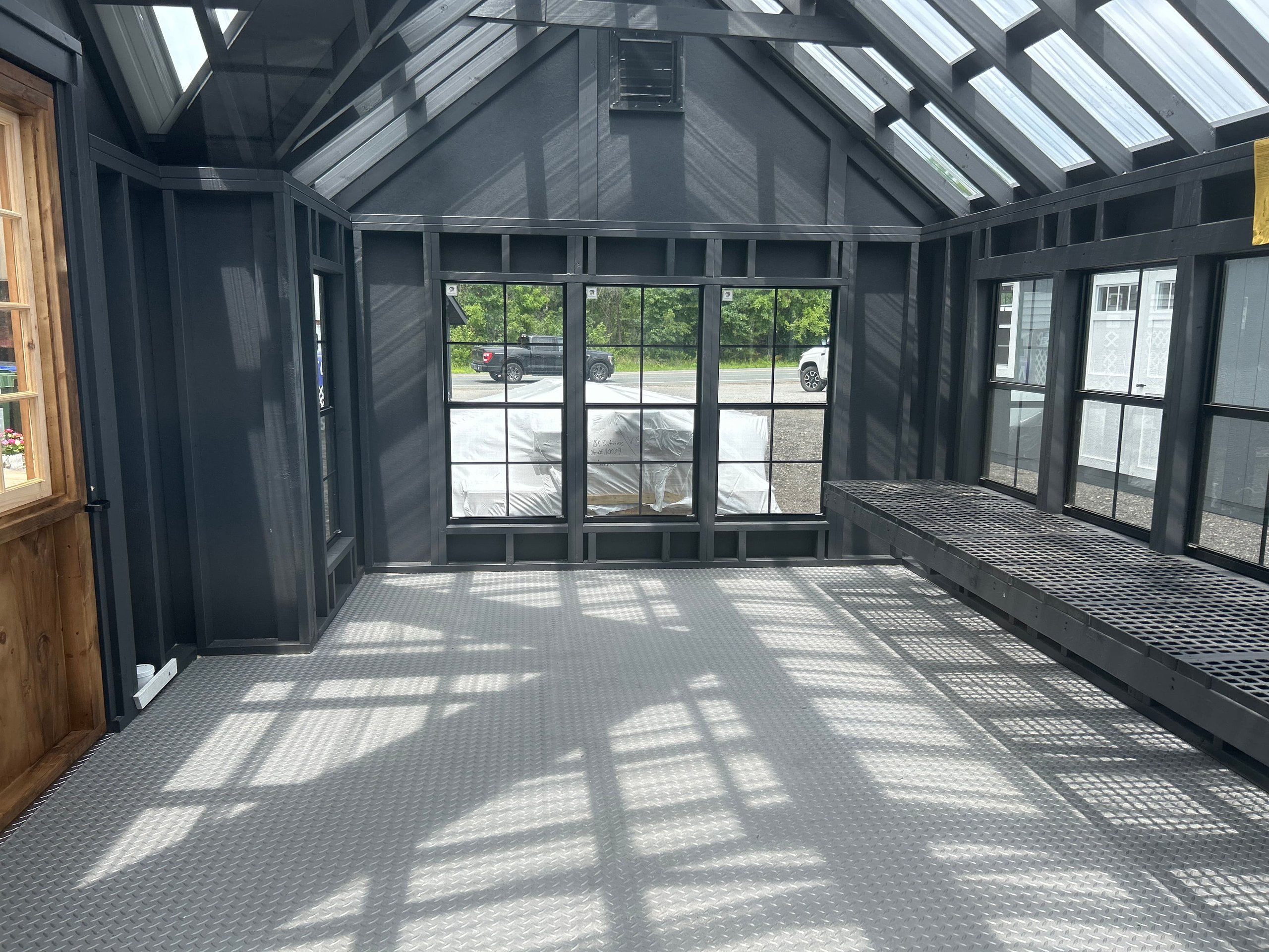 Step into a world of horticultural elegance with our Victorian Greenhouse. Exquisitely crafted by Amish artisans, this 10×16 haven is a testament to both form and function. Its LP Smart Panel siding, painted in the dignified hue of Mopboard, exudes timeless charm, while the Clear Metal Roof not only adds durability but also allows abundant natural light to flood the interior. With 13 windows strategically placed around its walls and a wood sash door welcoming you in, this greenhouse is a sanctuary for your plants to thrive. But it’s not just about its beauty; practicality is at its core. The LP Prostruct Flooring, supported by pressure-treated 2×4 joists, ensures stability and longevity, while included upgrades like the Bumpout Peak Dormer, black windows, and LuxGuard Rubber Floor elevate its functionality and aesthetic appeal. Transform your gardening experience with our Victorian Greenhouse and cultivate a space where beauty and growth intertwine effortlessly.