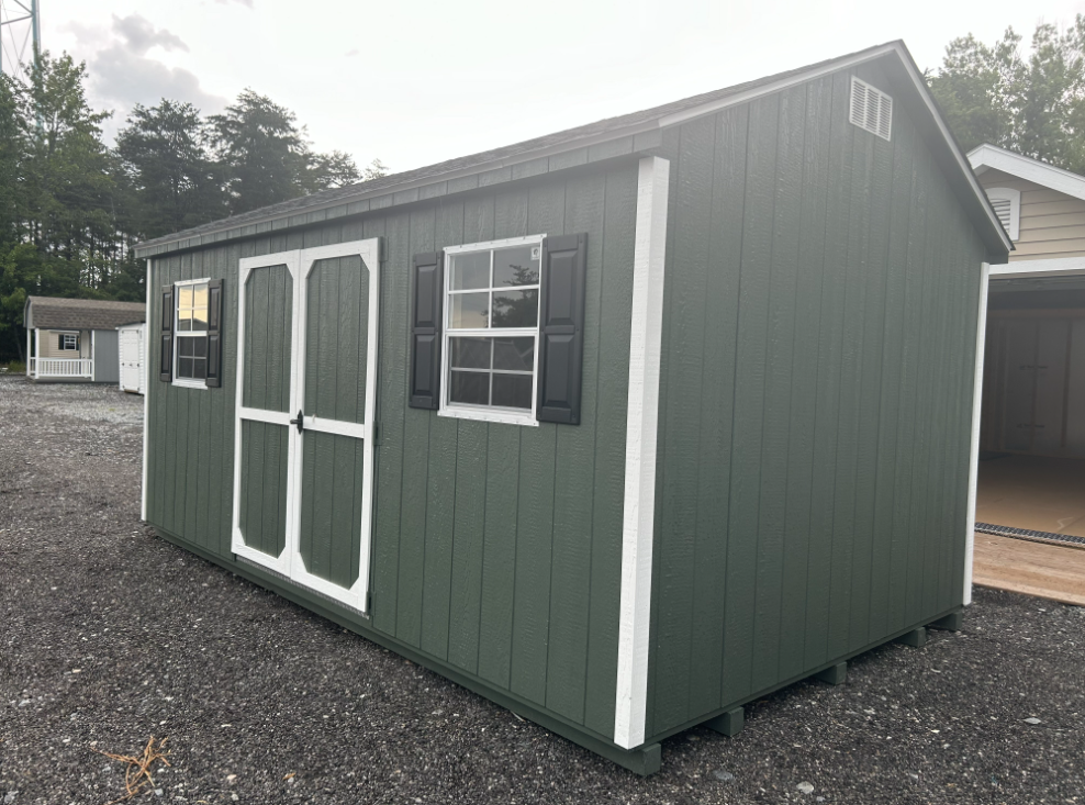 This 10×16 A-Frame shed is designed for style, durability, and functionality. Constructed with LP Smart Panel siding in Avocado and accented with crisp white trim, it features a Charcoal roof with architectural shingles and LP Tech Shield underlayment for superior weather resistance. The single door and 4×6’4″ Roll up door allows easy access, while two windows provide natural light. Built with 2×4 framing, pressure-treated joists, and 3/4-inch LP Prostruct flooring, this shed delivers long-lasting strength and versatility—ideal for storing tools, equipment, or creating a functional workspace.