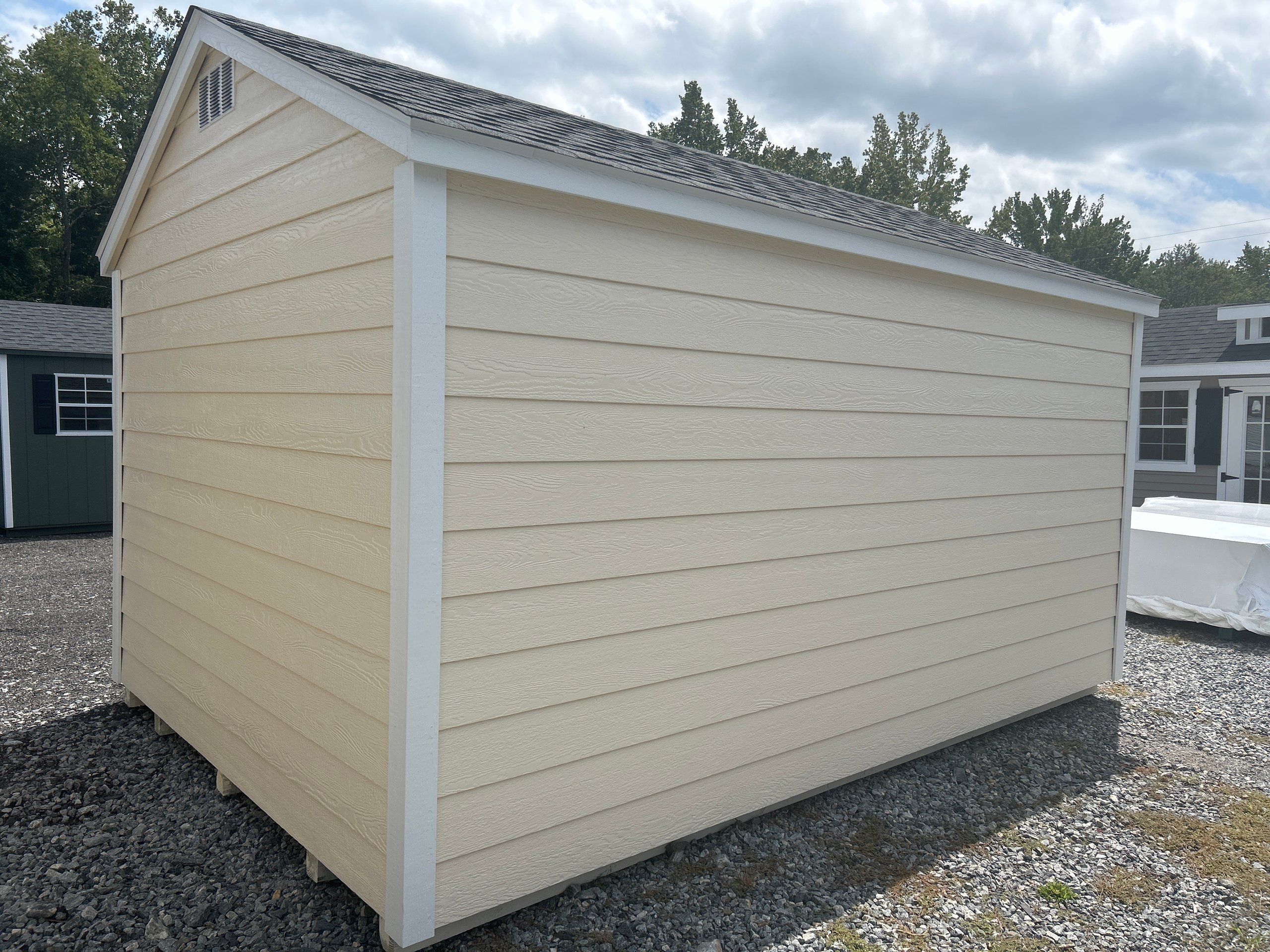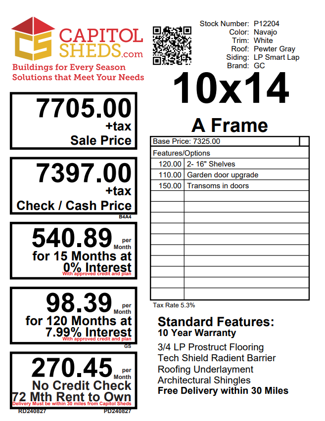 Introducing the Traditional A-Frame -A masterpiece of craftmanship by the Amish artisans. This 10×14 A-Frame is built to endure, offering exceptional quality and functionality for all your storage needs. The A-Frame siding provides superior durability while exuding timeless elegance in Navajo, complemented by pristine White. The Pewter Gray colored dimensional shingles protect your belongings from the elements ensuring long-lasting reliability. With 2-doors for easy access, the interior boasts 2×4 stud wall framing, 2×4 rafter roof framing, and LP Tech Shield roof sheeting for added strength. The LP Prostruct Flooring, coupled with pressure-treated 2×4 floor joists ensures stability and longevity. invest in the A-Frame for a storage solution that’s built to last.