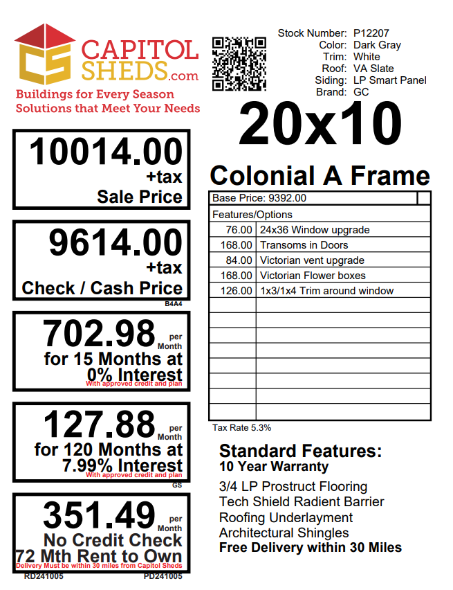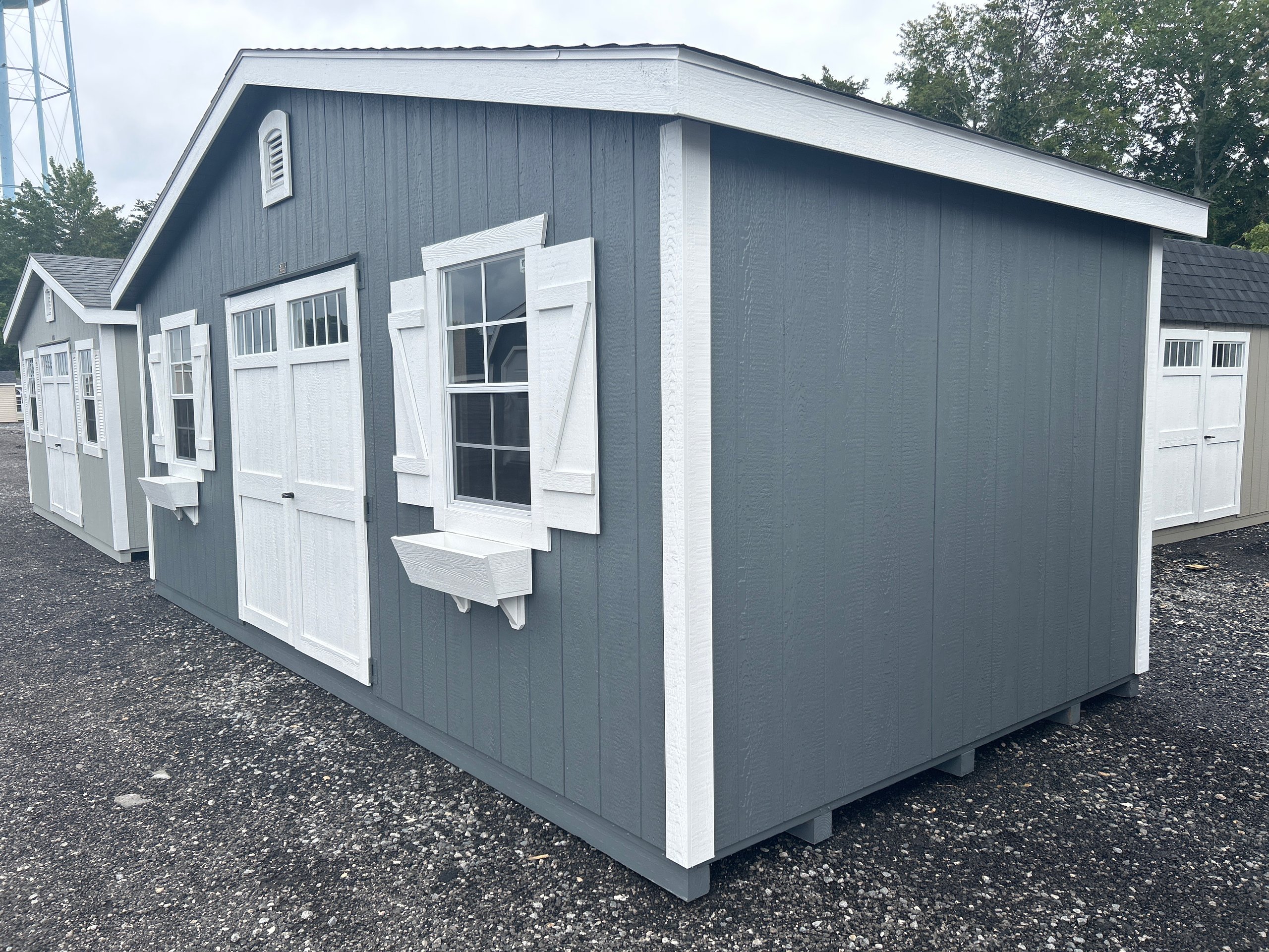 Enhance your outdoor space with our Colonial A-Frame Shed, featuring durable LP Smart Panel siding in dark grey, elegant white trim, and a striking Virginia Slate roof. Built to last with robust 2×4 wall and roof framing, this 20×10 shed provides ample storage and style. Enjoy abundant natural light from two upgraded 24″x36″ windows and transoms in the doors. The Victorian vent and charming flower boxes add a decorative touch, while the LP Prostruct flooring ensures a solid foundation. Perfect for tools, gardening supplies, or seasonal items, this shed combines function and elegance beautifully!
