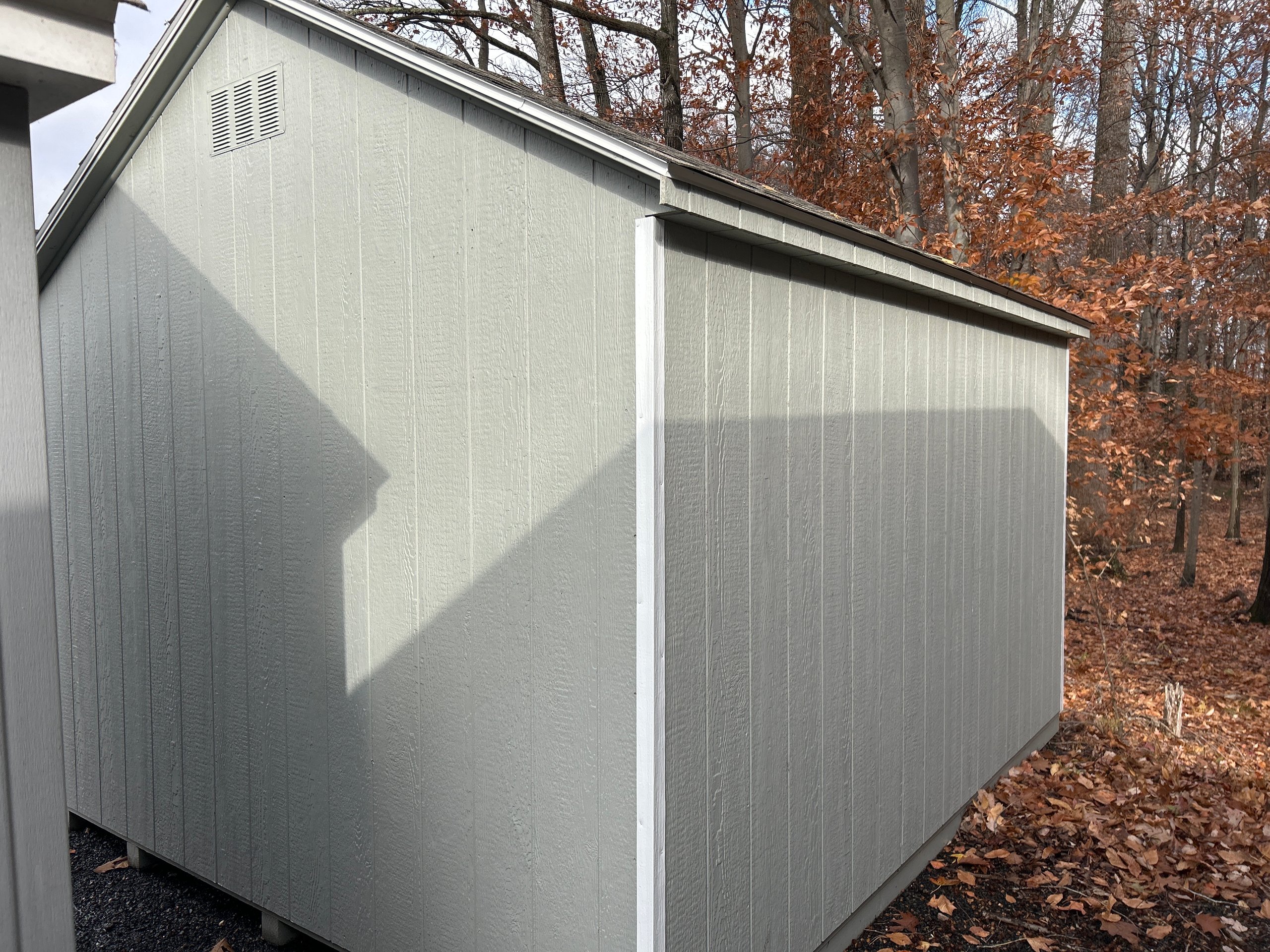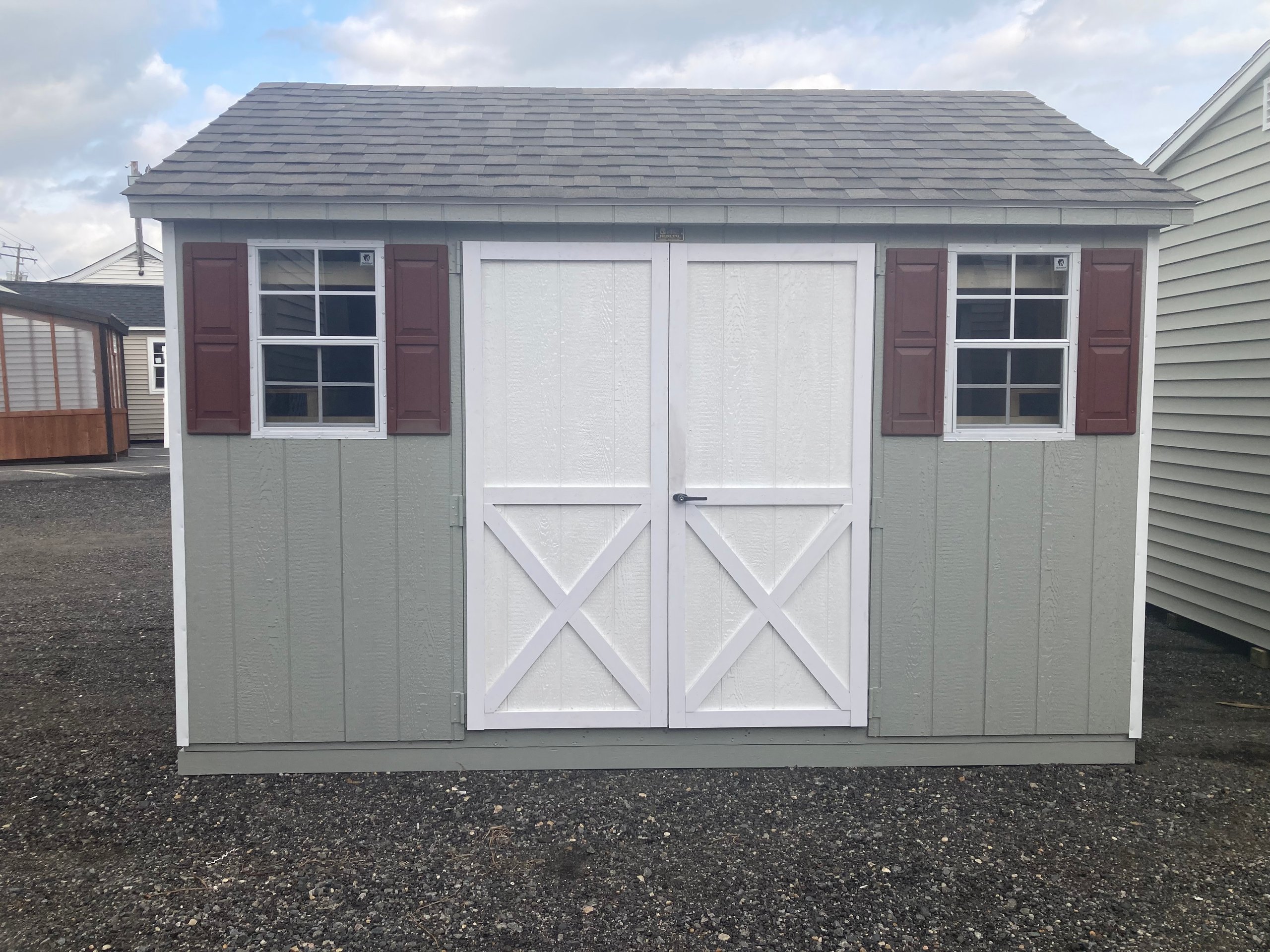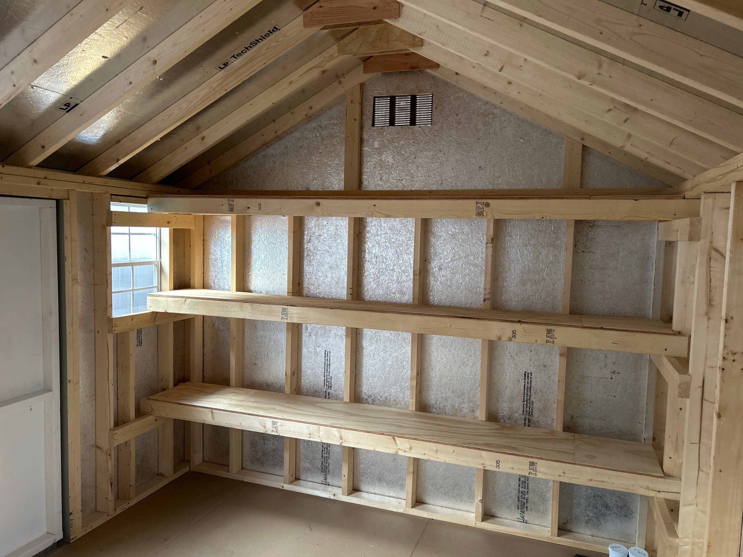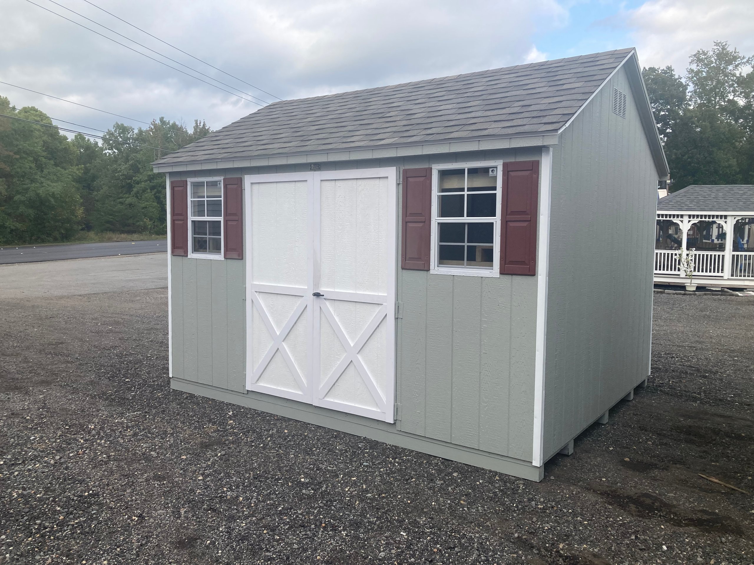 Style Name: A-frame Size: 10×12 Siding: LP Smart Panel Main Color: Light Gray Trim Color: White Roof Color: Weathered Wood Roofing: Architectural Shingles Roofing Underlayment: Roof Felt Paper Number of Windows: 2 Number of Doors: 2 Wall Framing: 2×4 studs 16 inches on center Roof Framing: 2×4 rafters 16 inches on center Roof Sheeting: LP Tech Shield Flooring: LP T&G Prostruct Flooring Floor Joists: Pressure Treated 2×4 joists 16 inches on center   Included Upgrades: Wider Door 10’ Shelf