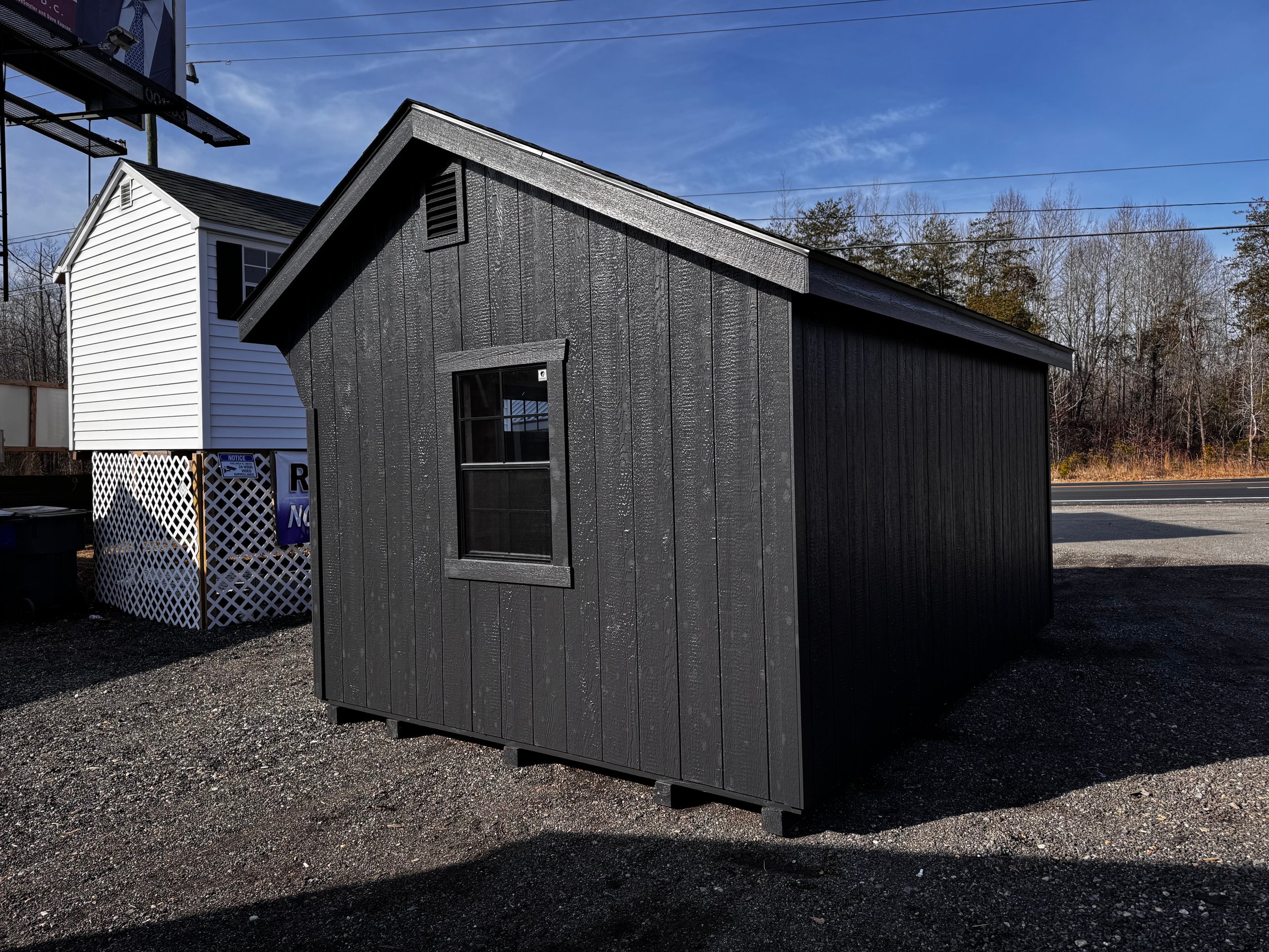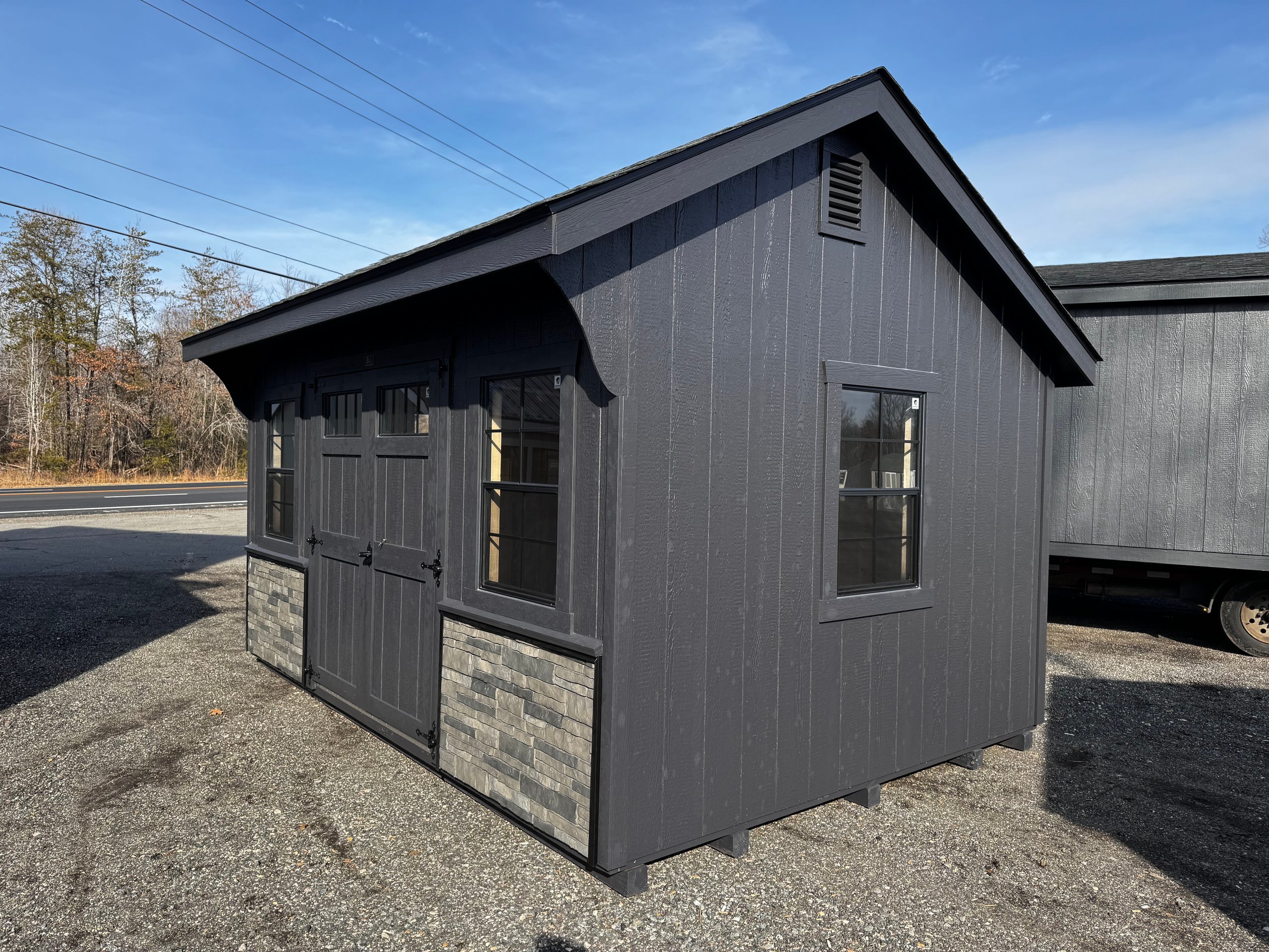 The 10×14 Carriage shed blends classic design with sophisticated upgrades to enhance your outdoor space. Featuring durable mopboard-colored LP Smart Panel siding with custom black accents, it’s both functional and elegant. Upgraded black 24×36 windows with trim and black 4-lite transoms allow abundant natural light while maintaining privacy. The Lewiston stone front adds a luxurious touch, complementing the charcoal architectural shingle roof. Built for durability, this shed includes LP Tech Shield roof sheeting, ProStruct flooring, and pressure-treated 2×4 joists. Garden vents improve ventilation, making it perfect for storage, hobbies, or workspace needs.