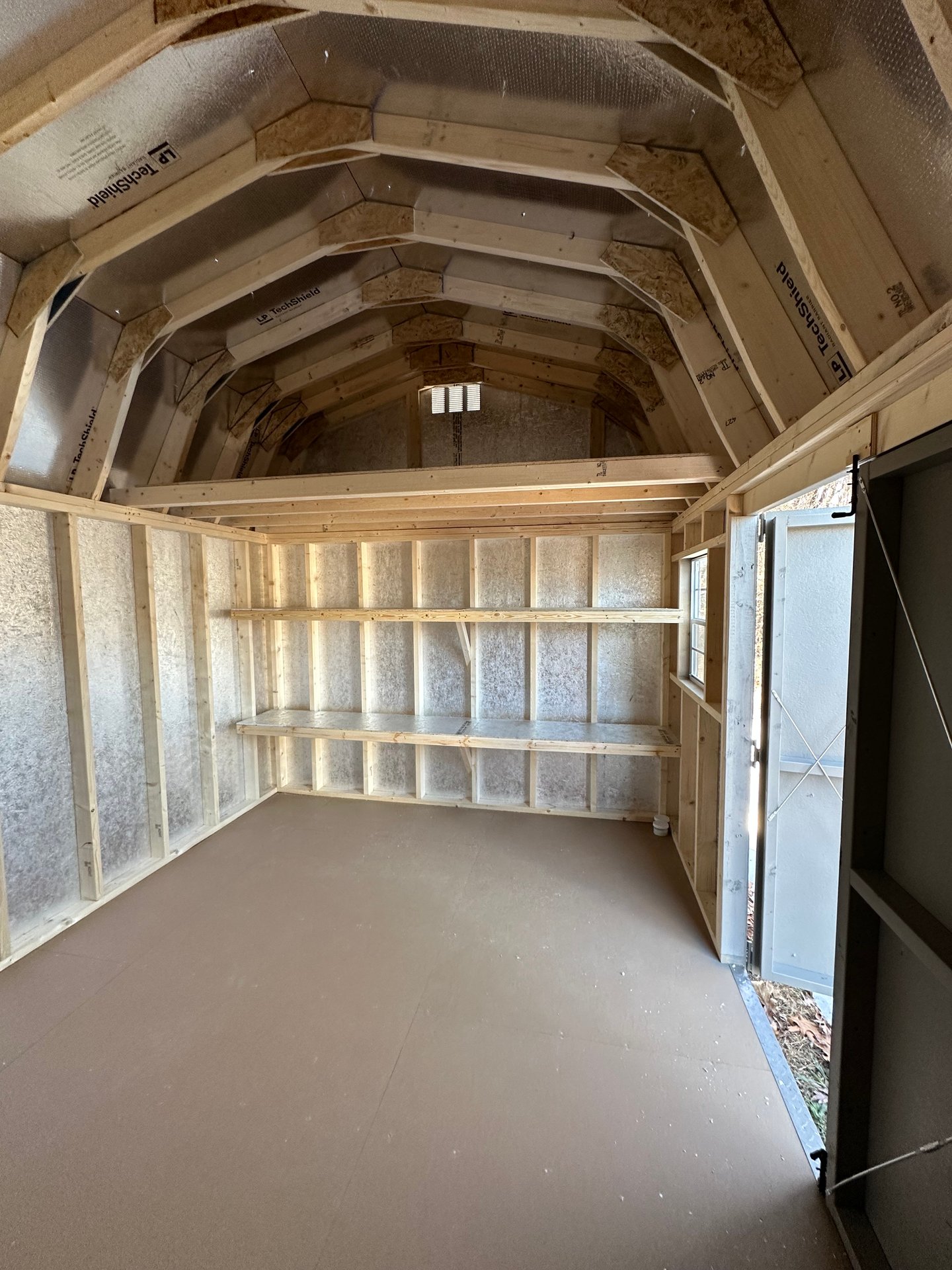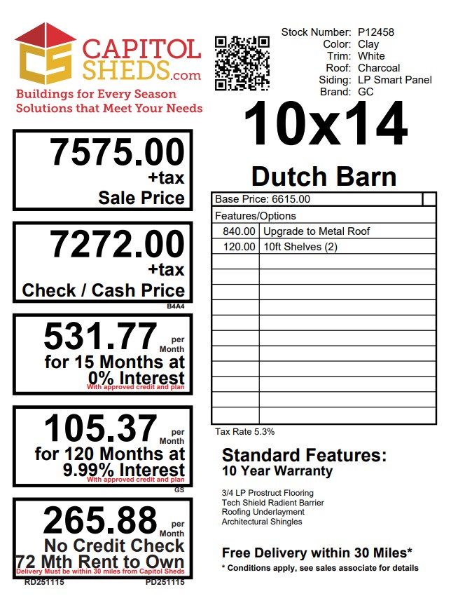 Style Name: Dutch Barn Size: 10×14 Siding: LP Smart Panel Main Color: Clay Trim Color: White Roof Color: Charcoal Roofing: Metal Number of Windows: 2 Number of Doors: 2 Wall Framing: 2×4 studs 16 inches on center Roof Framing: 2×4 rafters 16 inches on center Roof Sheeting: LP Tech Shield Flooring: LP Prostruct Flooring Floor Joists: Pressure Treated 2×4 joists 16 inches on center Included Upgrades: 10ft Shelves