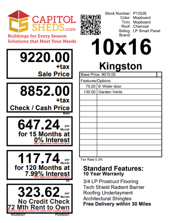Style Name: Kingston Size: 10×16 Siding: LP Smart Panel Main Color: Mopboard Trim Color: Mopboard Roof Color: Charcoal Roofing: Architectural Shingles Roofing Underlayment: Roof Felt Paper Number of Windows: 2 Number of Doors: 2 Wall Framing: 2×4 studs 16 inches on center Roof Framing: 2×4 rafters 16 inches on center Roof Sheeting: LP Tech Shield Flooring: LP T&G Prostruct Flooring Floor Joists: Pressure Treated 2×4 joists 16 inches on center   Included Upgrades: Extra 3’ Door with Black 4-lite Inserts Black Window Upgrade Black Octagon Window Garden Vents Custom Painted Siding and Trim