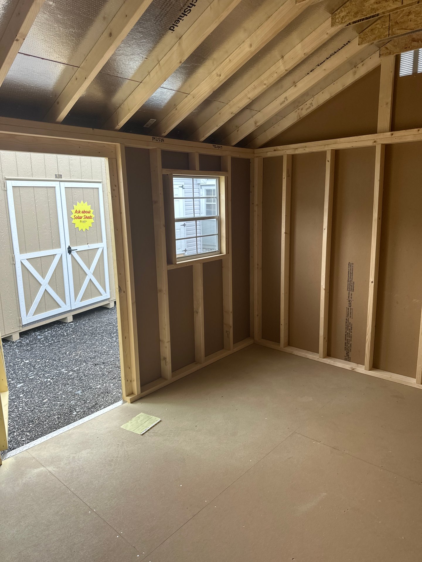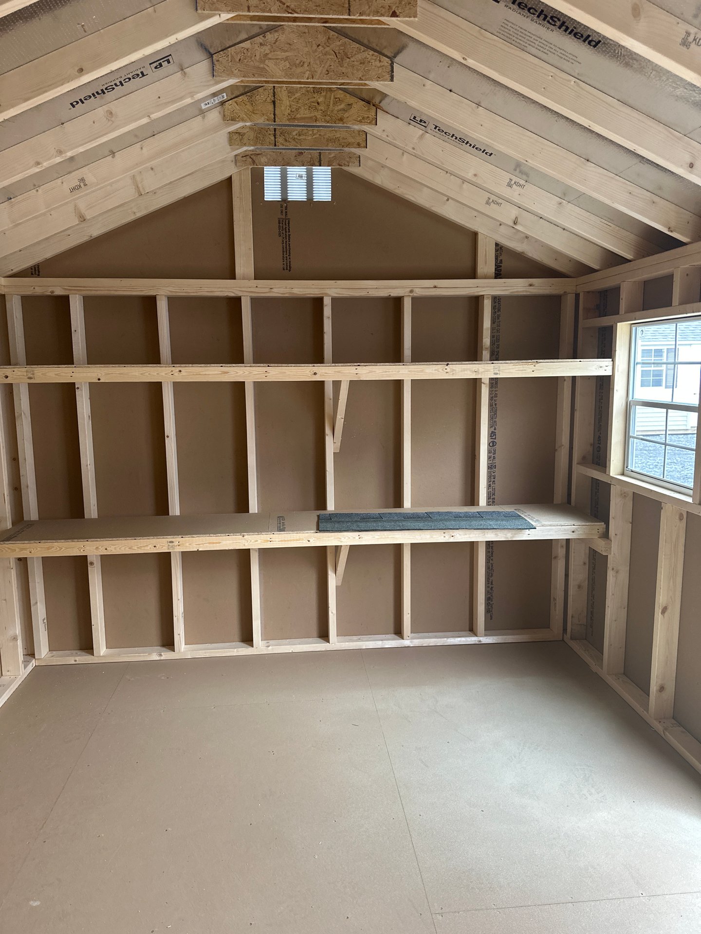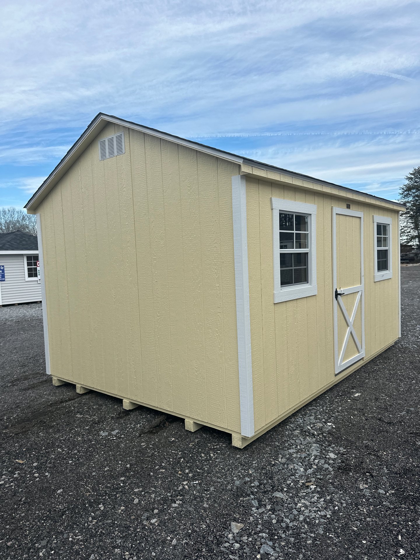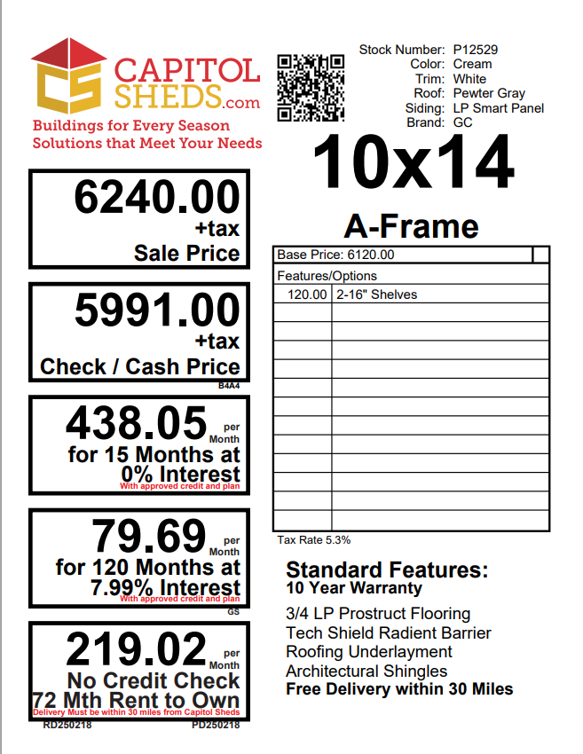 Introducing the Traditional A-Frame -A masterpiece of craftmanship by the Amish artisans. This 10×14 A-Frame is built to endure, offering exceptional quality and functionality for all your storage needs. The A-Frame siding provides superior durability while exuding timeless elegance in Cream , complemented by pristine White. The Pewter gray colored dimensional shingles protect your belongings from the elements ensuring long-lasting reliability. With 3 doors for easy access, the interior boasts 2×4 stud wall framing, 2×4 rafter roof framing, and LP Tech Shield roof sheeting for added strength. The LP Prostruct Flooring, coupled with pressure-treated 2×4 floor joists ensures stability and longevity. invest in the A-Frame for a storage solution that’s built to last.