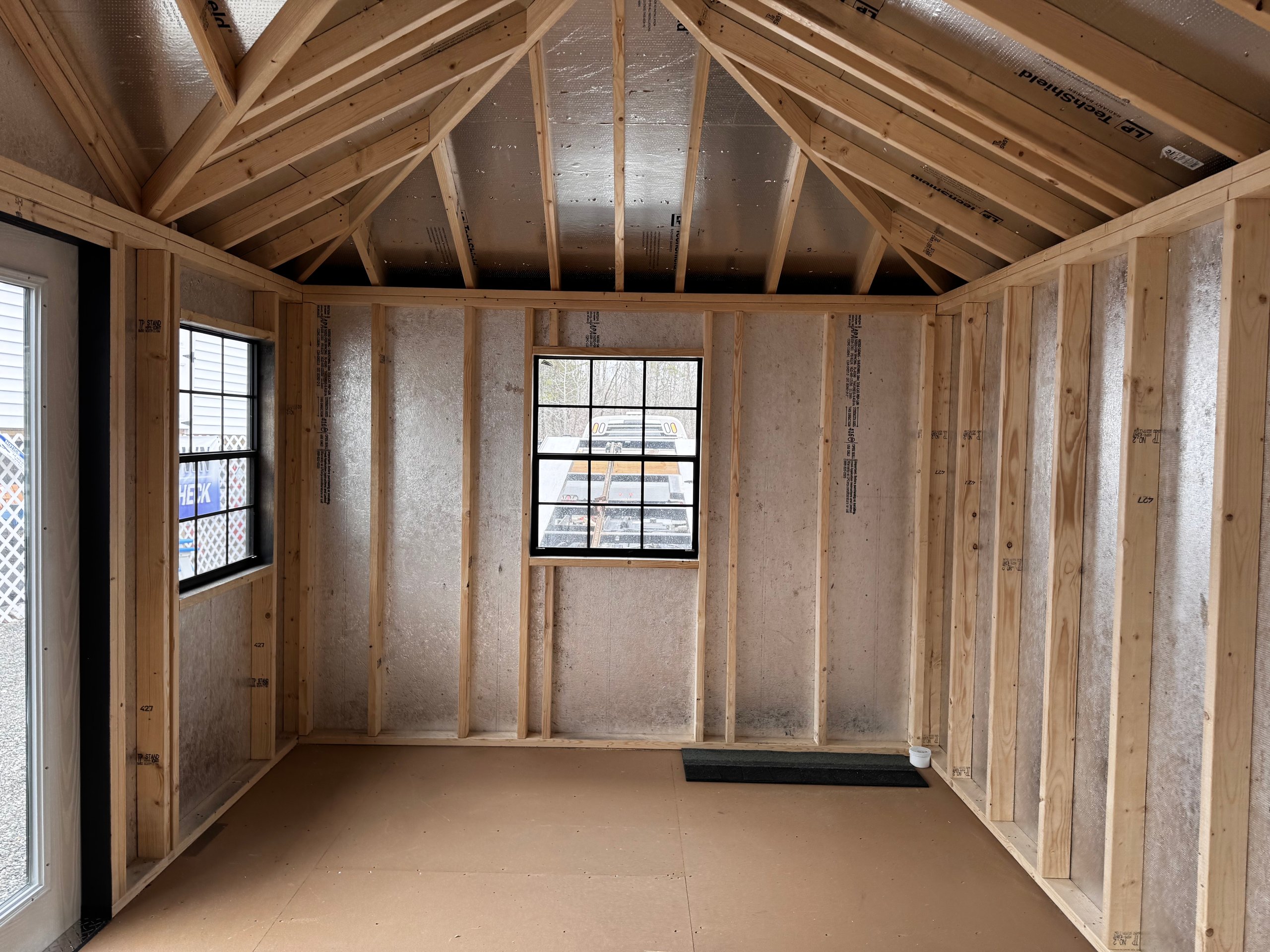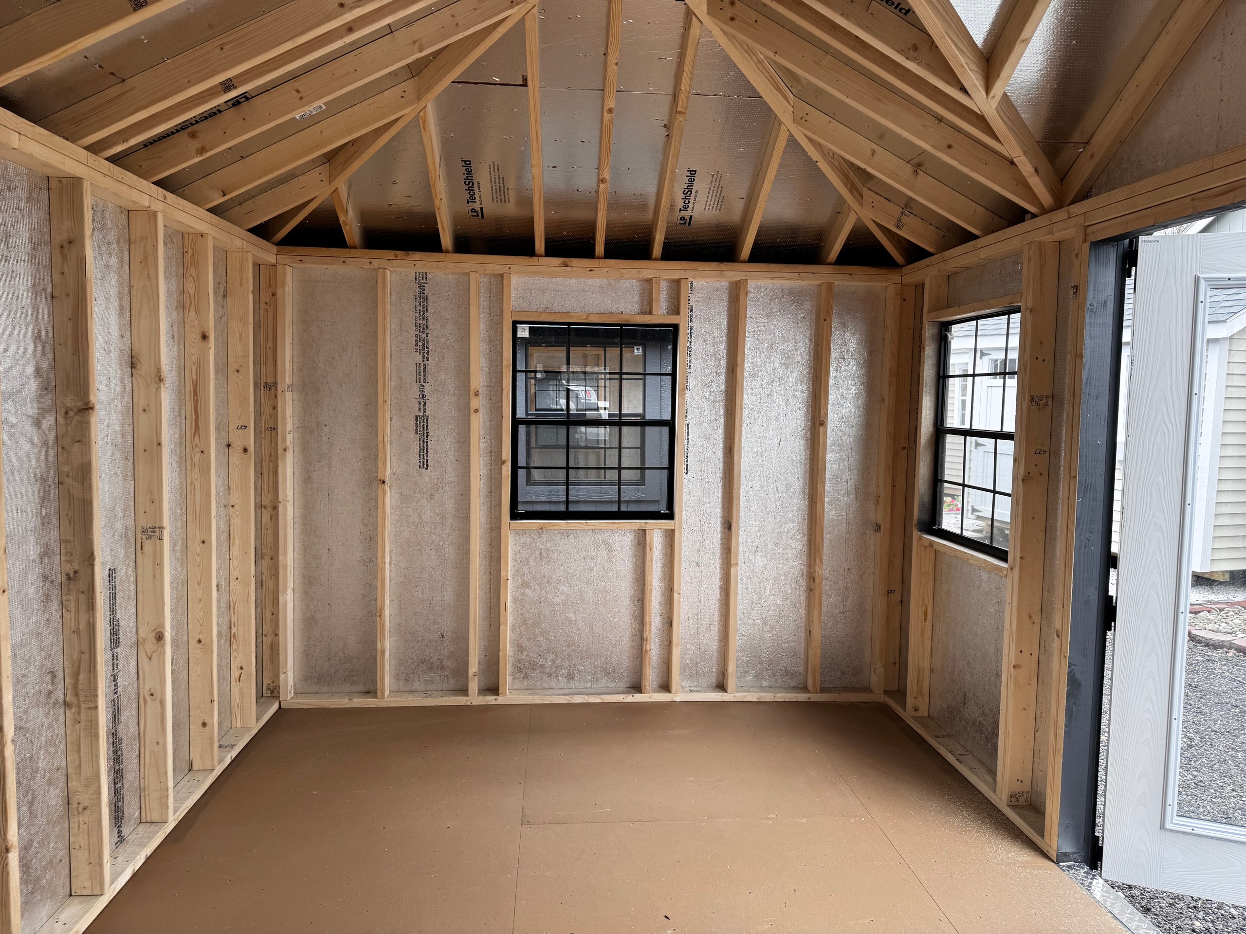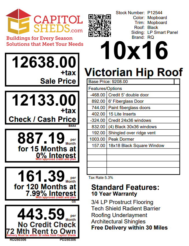 This 10×16 Victorian Hip Roof shed combines a classic aesthetic with premium features. The Mopboard LP Smart Panel siding pairs with black trim and a Black architectural shingle roof. A 6′ fiberglass door with 15 lite inserts enhances accessibility. Four black 30×36 windows and an 18×18 black square window allow ample natural light. A peak dormer adds architectural charm, while a shingled-over ridge vent improves airflow. Constructed with LP Tech Shield roof sheeting and pressure-treated 2×4 joists, this shed delivers long-lasting durability and refined style, perfect for versatile storage or workspace needs.