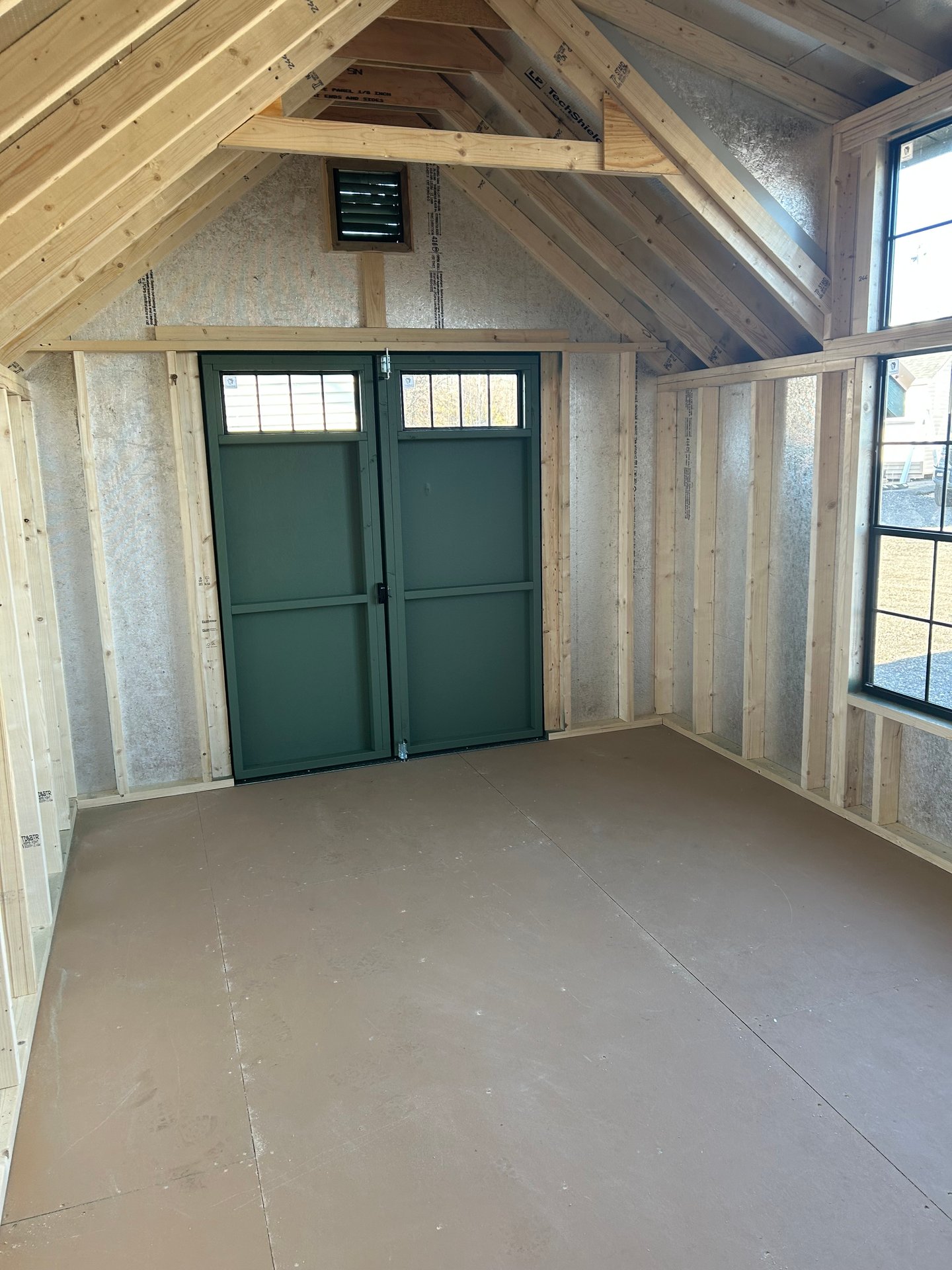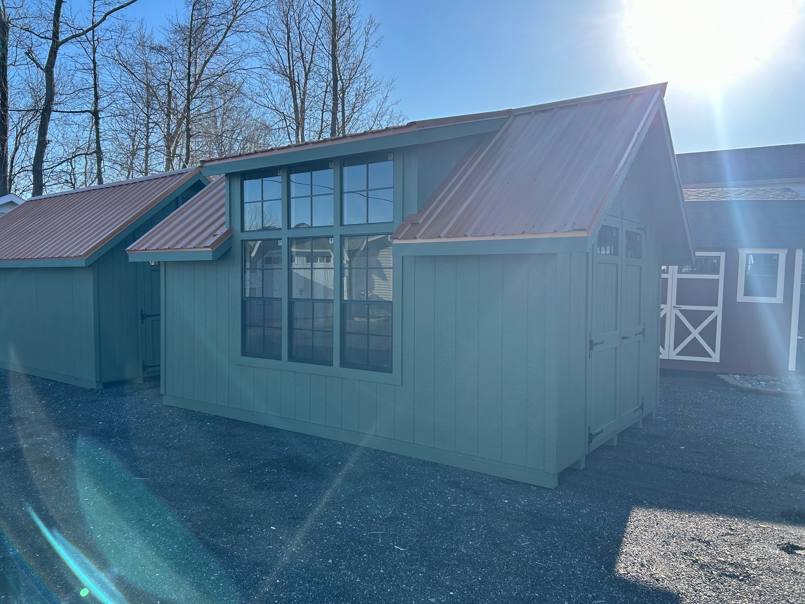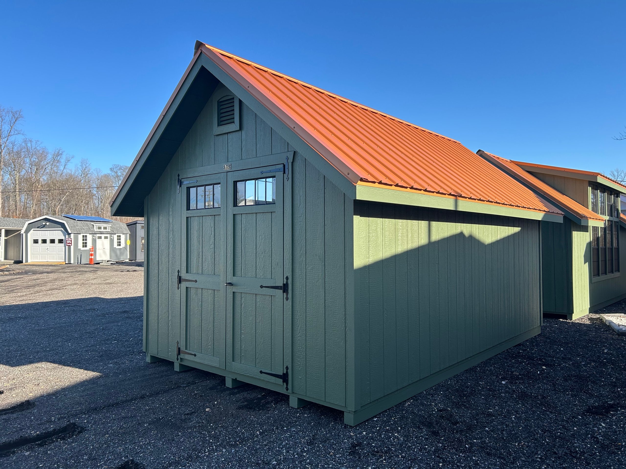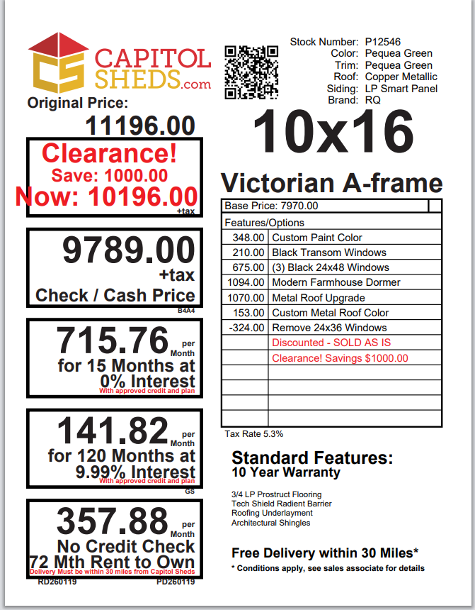 The 10×16 Victorian A-frame offers a sophisticated blend of function and style. Featuring LP Smart Panel siding in Pequea Green with a Copper Metallic metal roof upgrade, it combines durability with eye-catching design. The structure includes 2×4 wall and roof framing at 16” on center, LP Tech Shield roof sheeting, and LP T&G Prostruct flooring. Enhancing its modern appeal are black transom windows, three black 24×48 windows, and a striking modern farmhouse 3-transom dormer. With custom paint and a uniquely colored metal roof, this shed is a premium choice for those looking for both elegance and practicality.