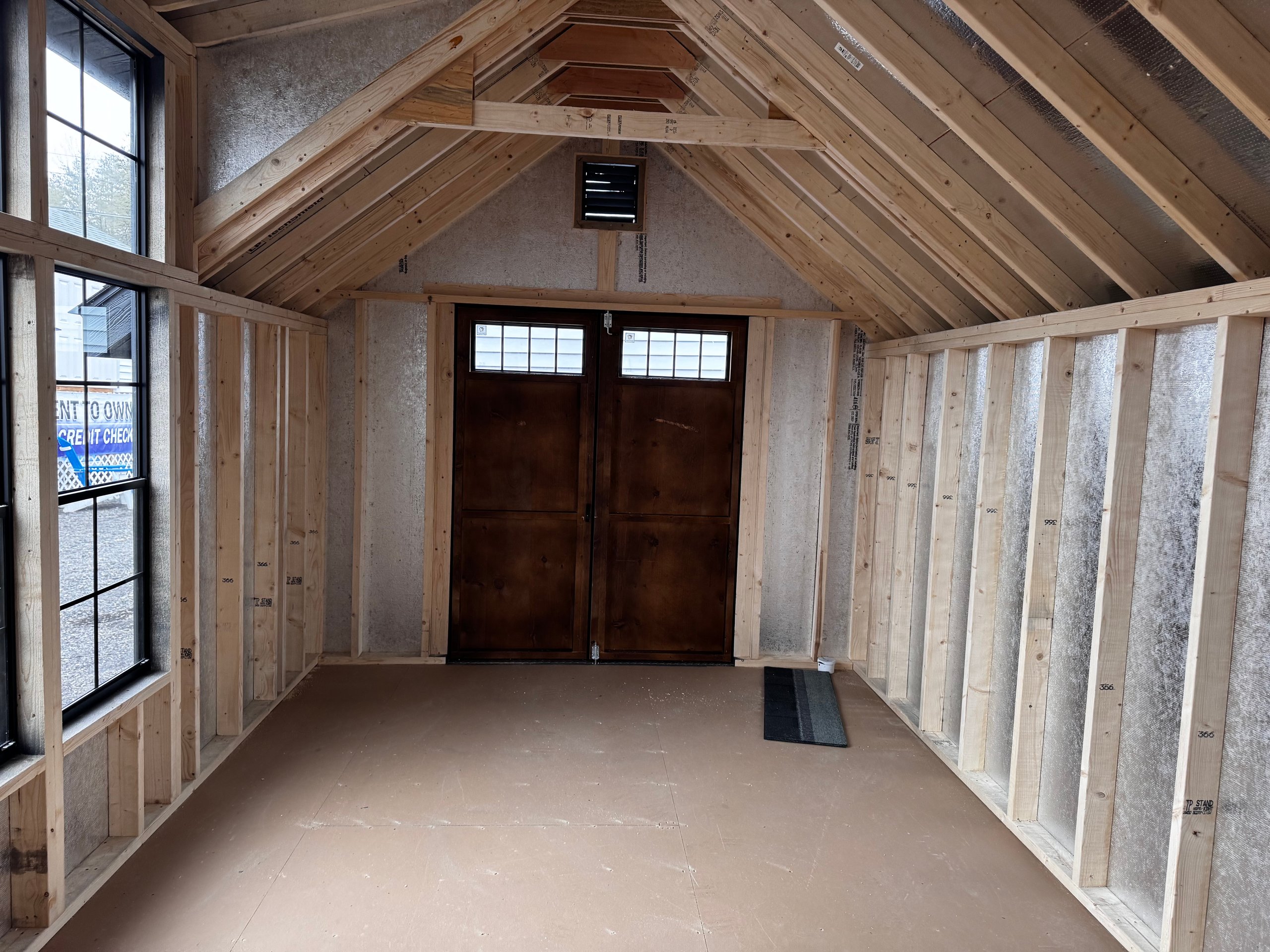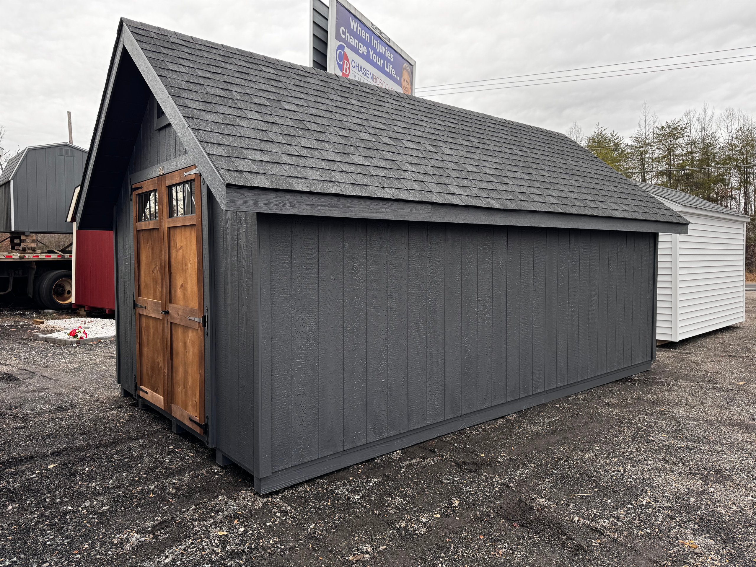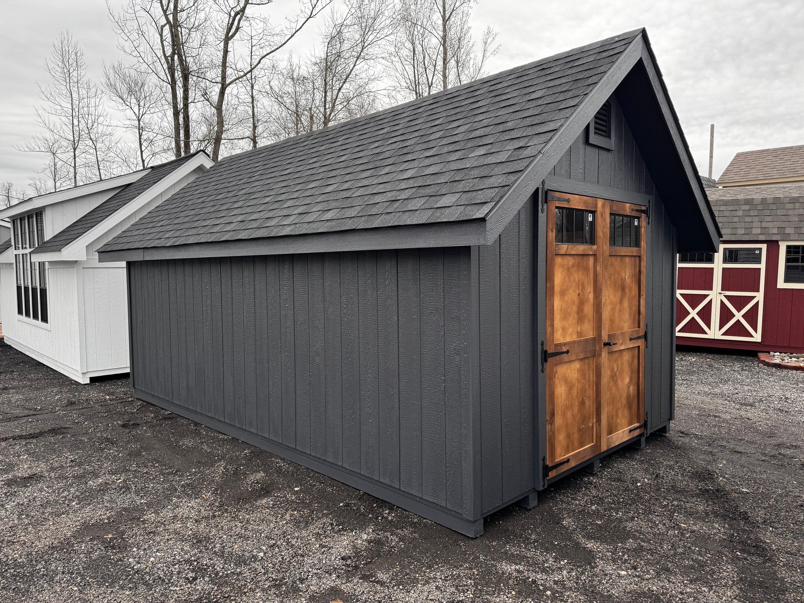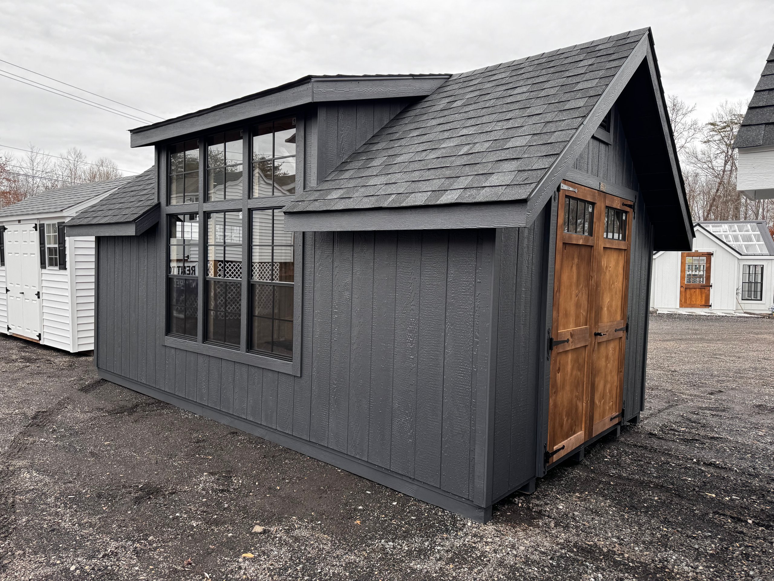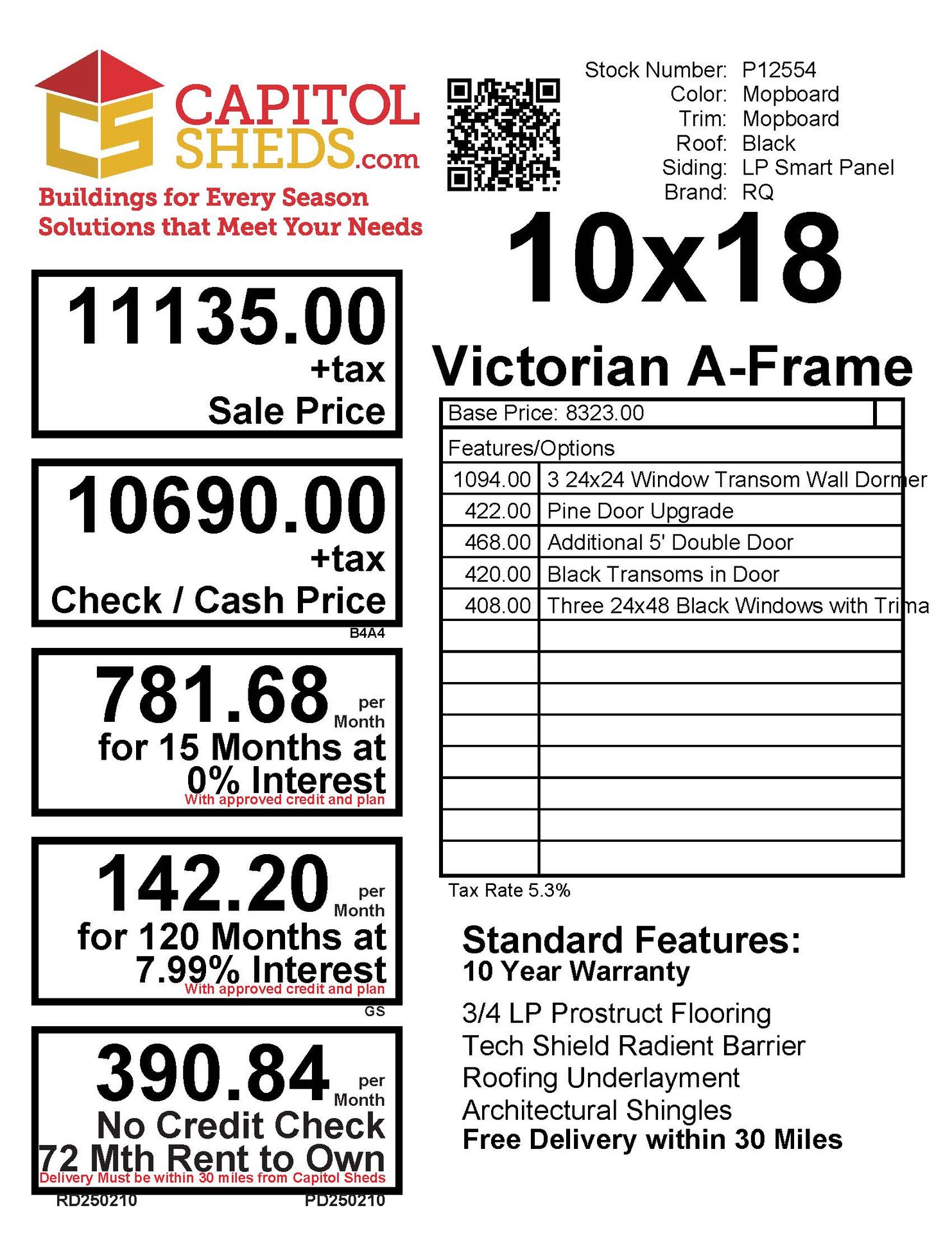 Add timeless elegance to your backyard with the Victorian A-Frame 10×18 Amish-Built Storage Shed. Designed for durability and charm, this shed features LP Smart Panel siding in classic Mopboard with matching trim, a black dimensional shingle roof, and decorative dormer windows for extra light and style. Built to last, it boasts robust 2×4 framing, LP Tech Shield roof sheeting, and pressure-treated floor joists. Enhanced with three 24×48 black windows, transom-accented pine doors, and an extra 5′ double door, this shed is the perfect blend of functionality and sophistication. Elevate your outdoor space with unmatched Amish craftsmanship!