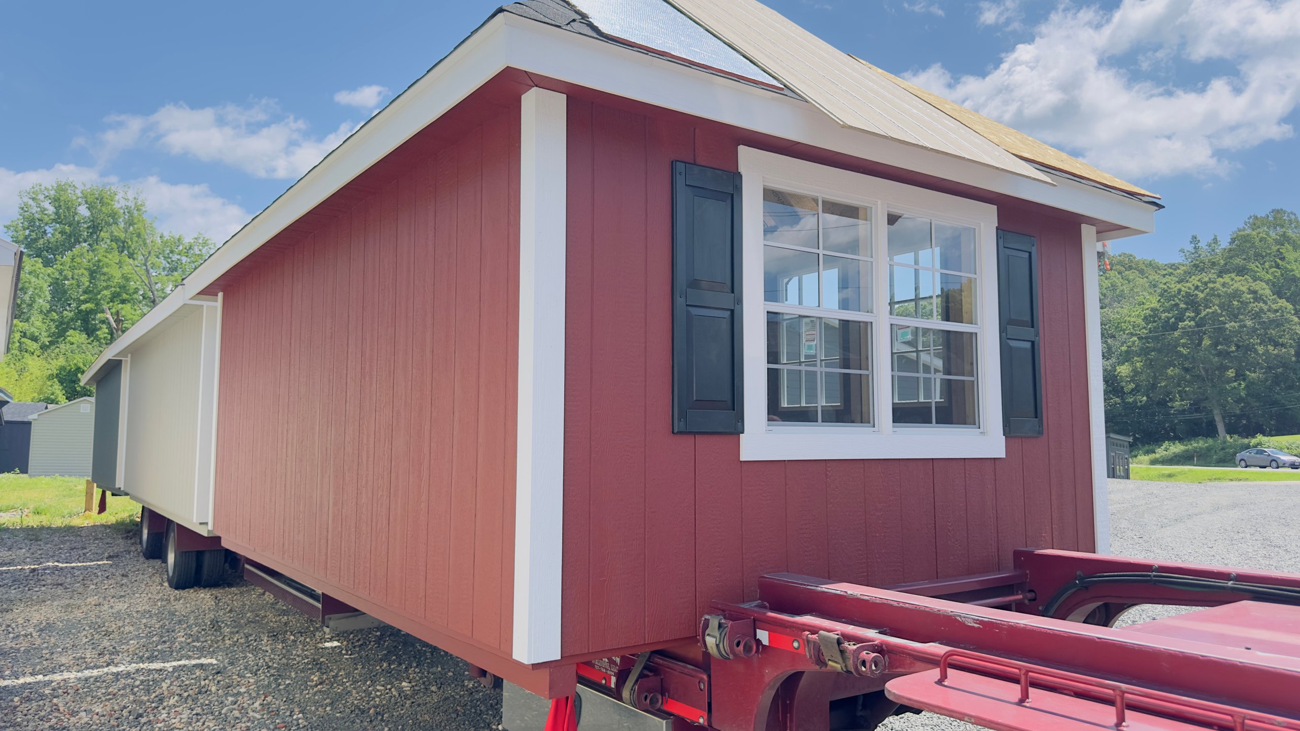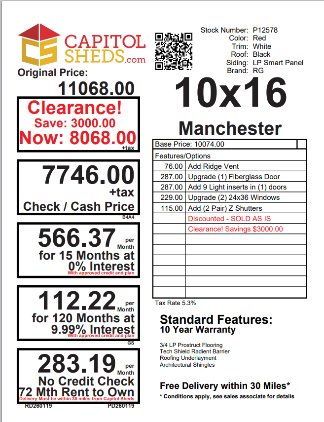 Style Name: Manchester Size:  10X16 Siding:  LP Smart Panel Main Color:  Red Trim Color:  White Roof  Color: Black Number Of  Windows:  4 Number Of Doors:  Double Doors Flooring:  3/4 LP Prostruct Flooring Included Upgrades: Add Ridge Vent Upgraded Double Fiberglass Doors Add 9 Light Inserts In Double Doors Upgraded (2) 24X36 Windows Add (2 Pair) Z Shutters
